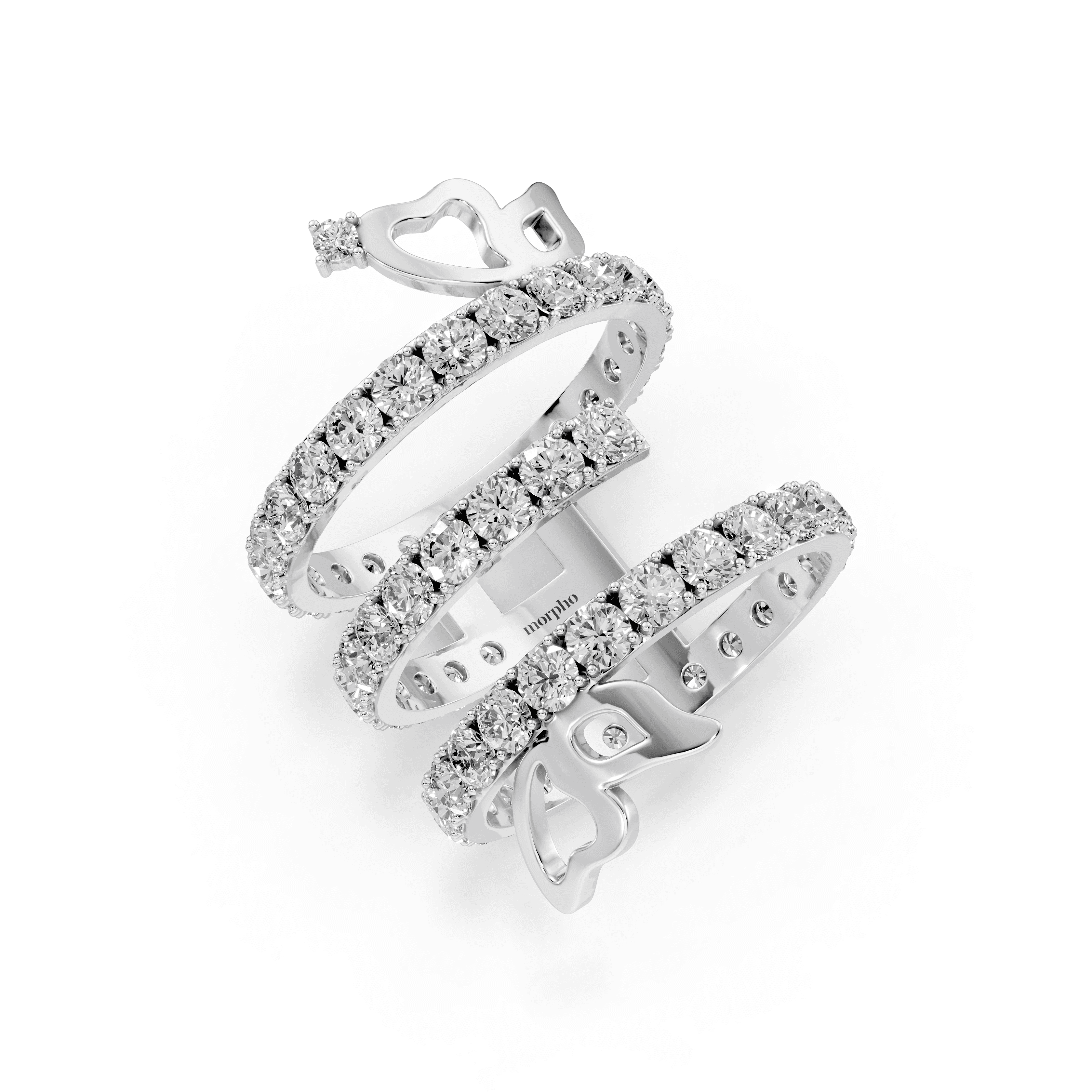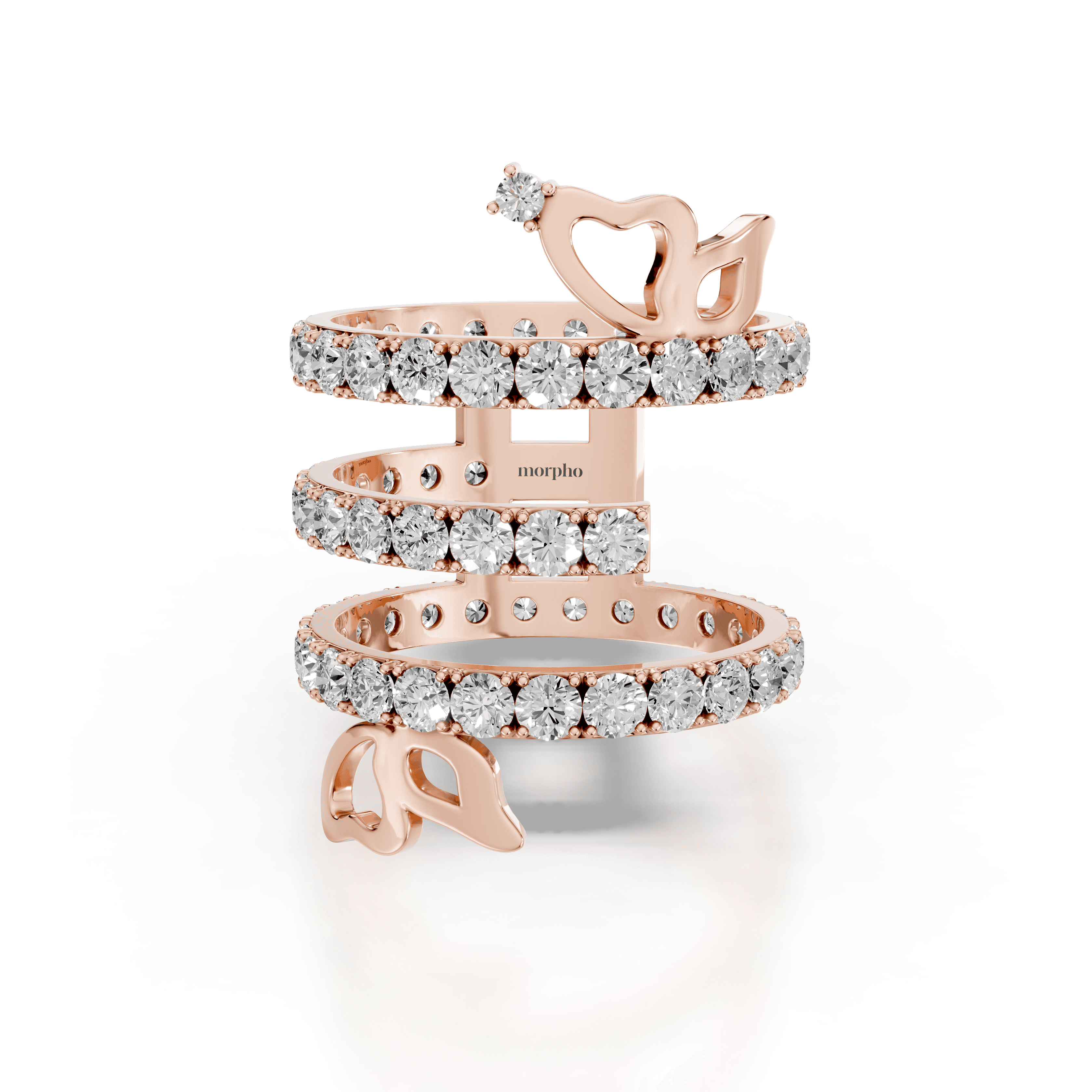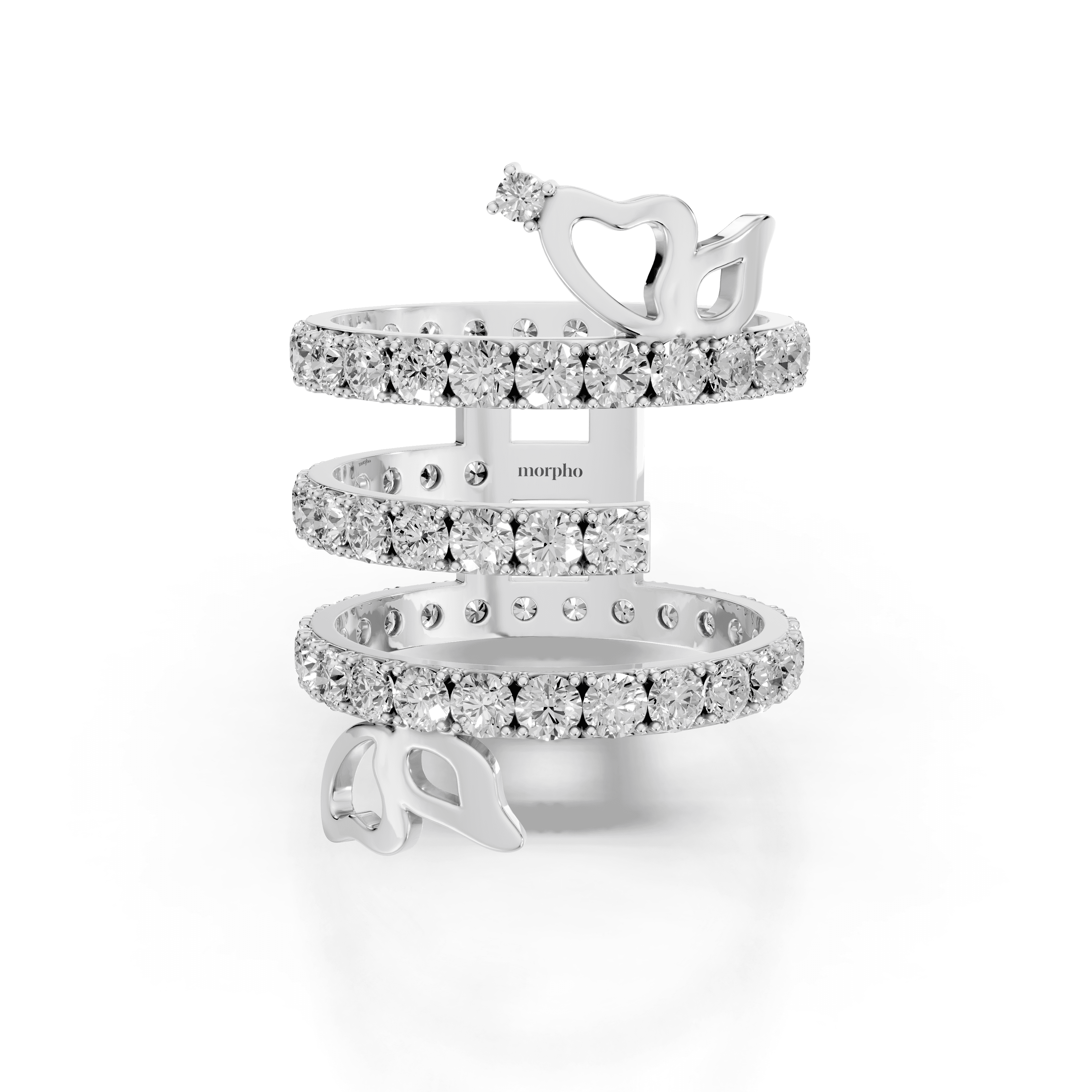 Multi-row spiral ring with pavé diamonds and abstract butterfly accents