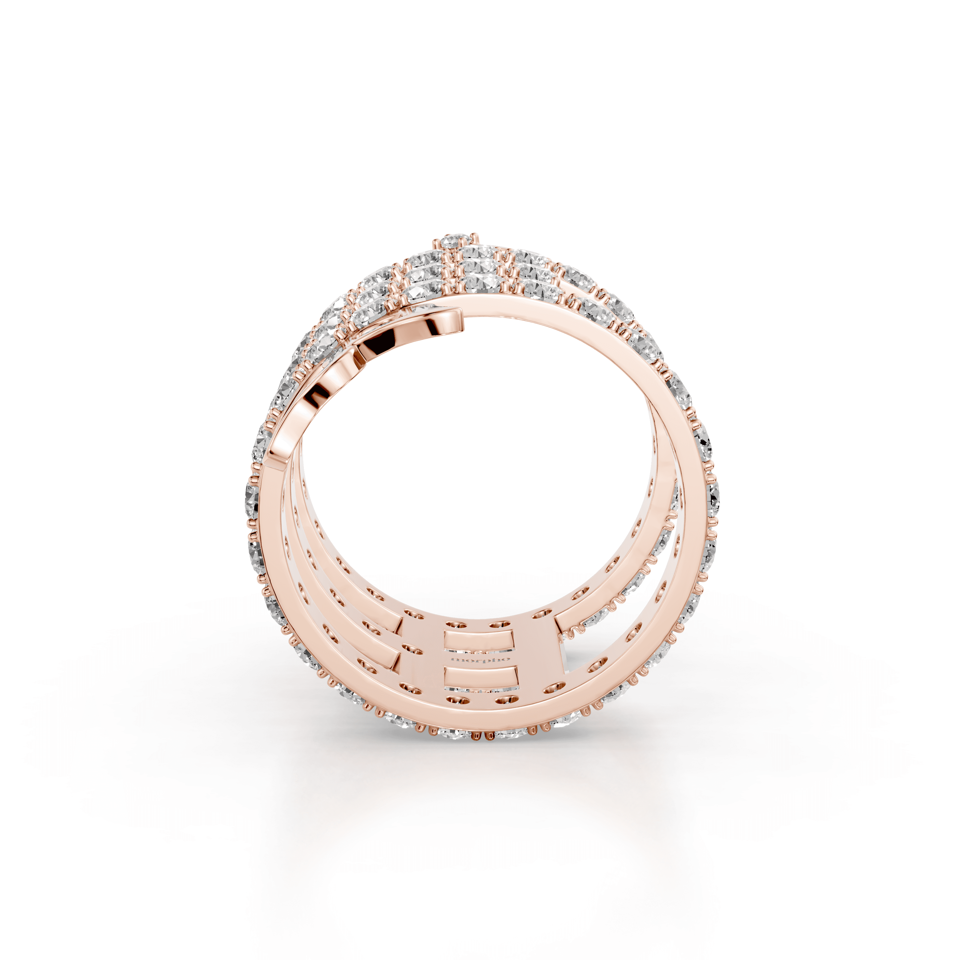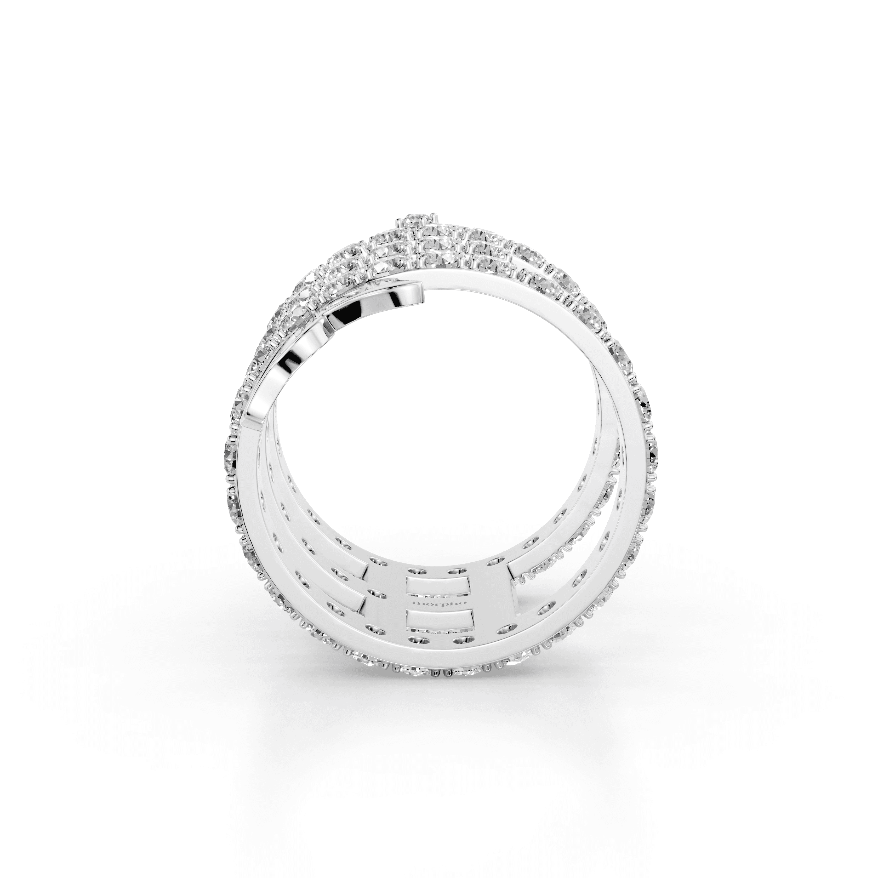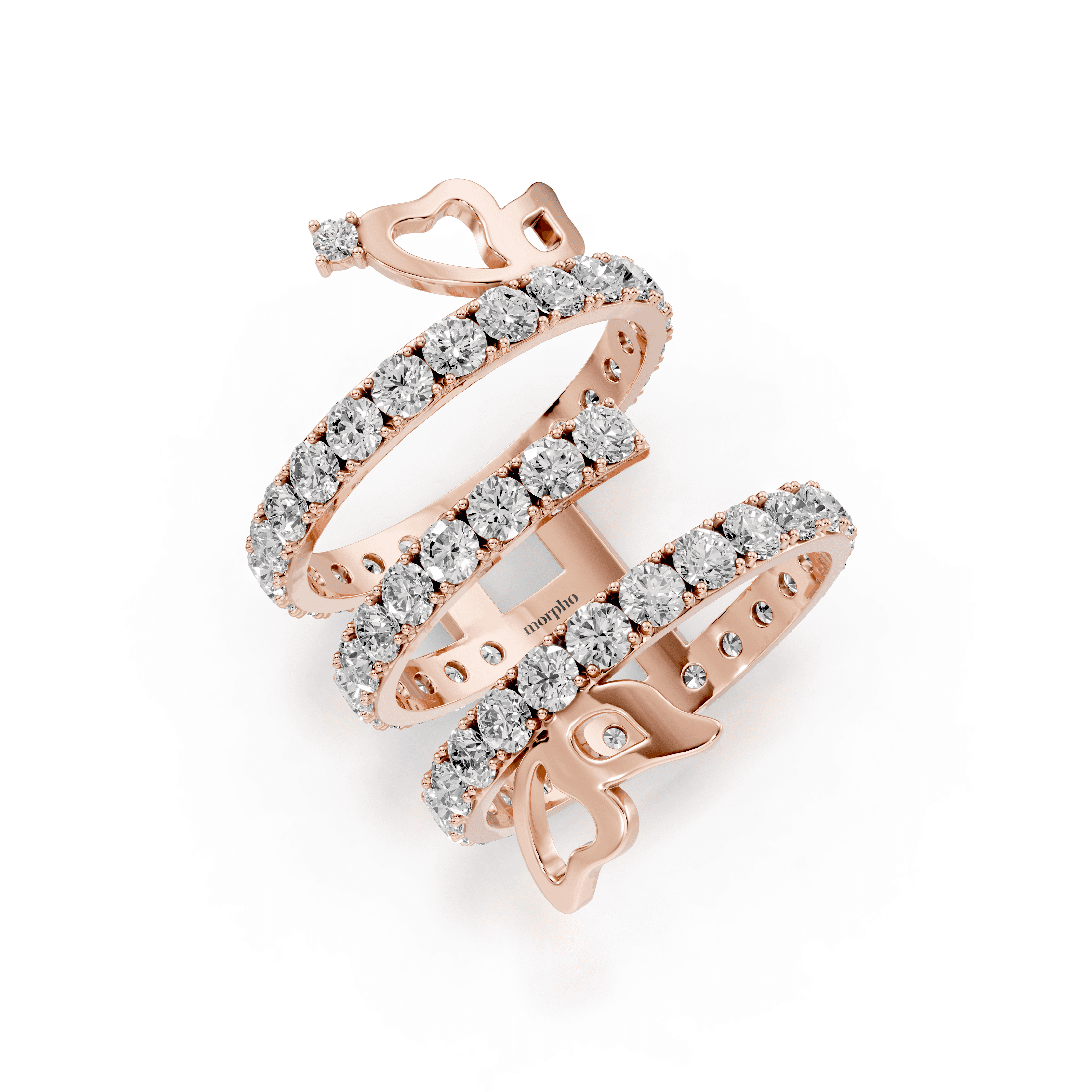 Multi-row spiral ring with pavé diamonds and abstract butterfly accents