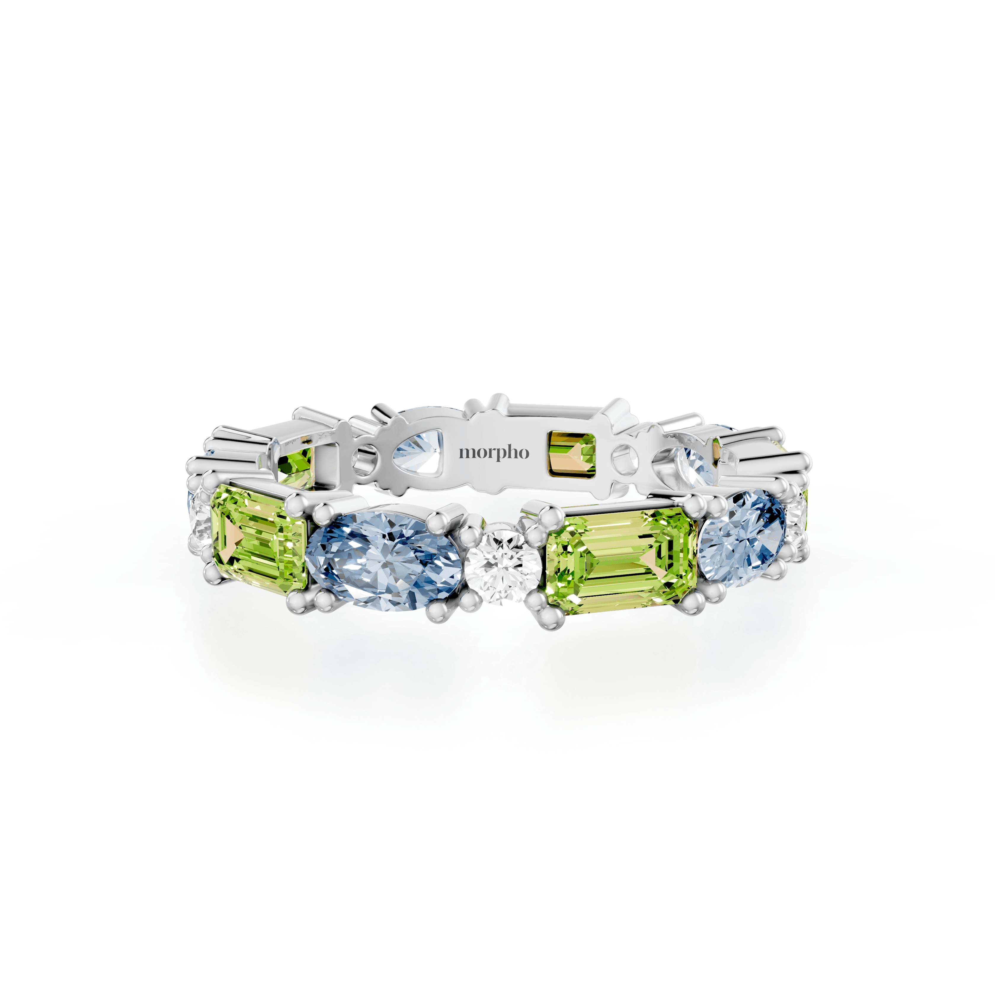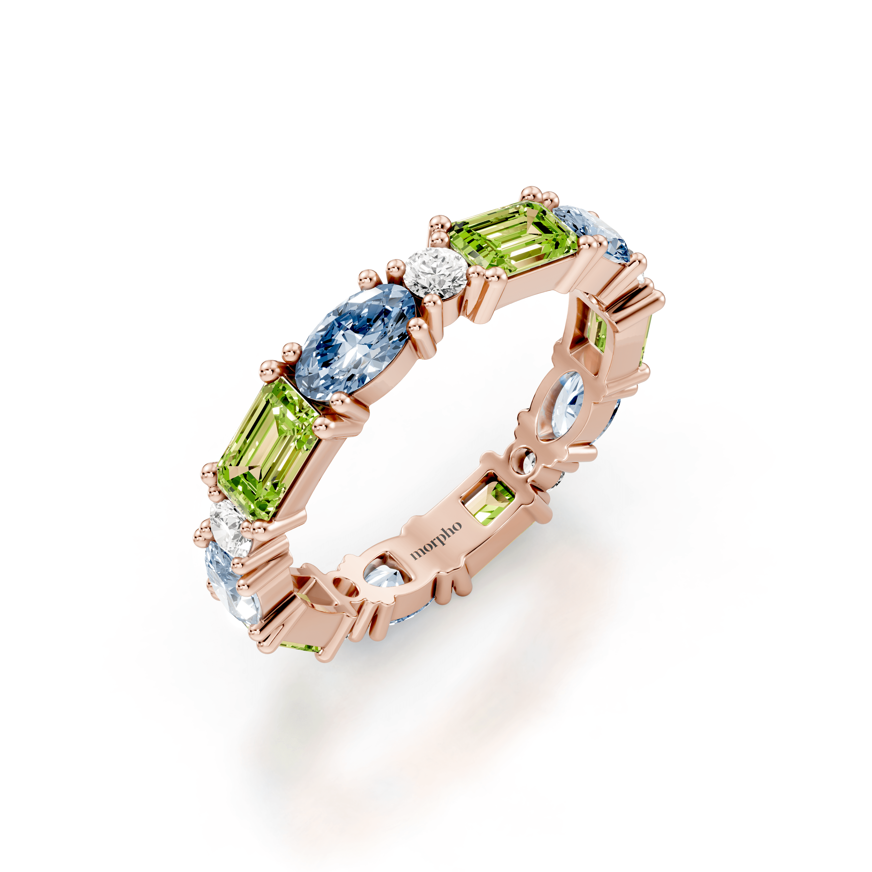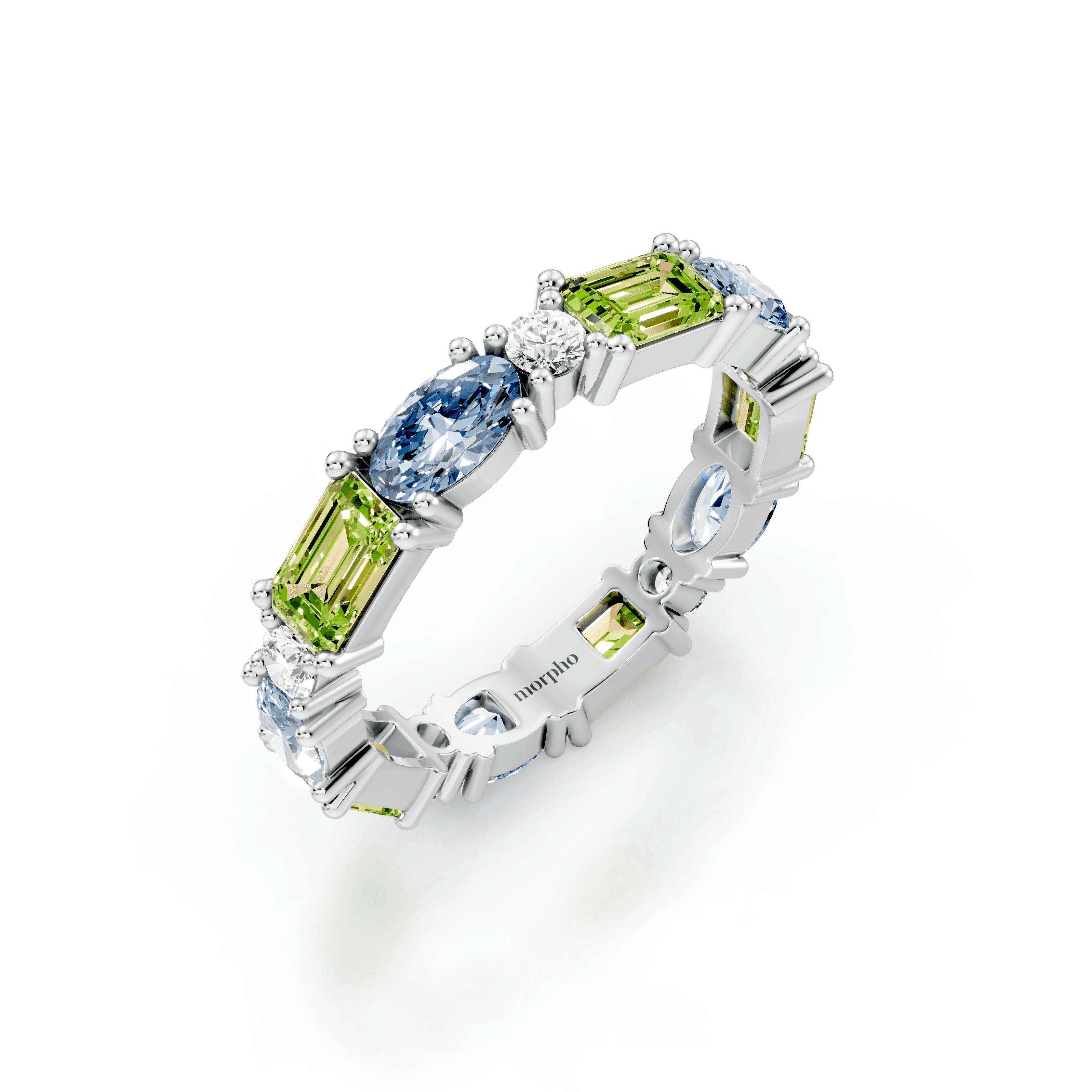 Alternating emerald-cut green and oval blue stones in a claw-set full circle.
