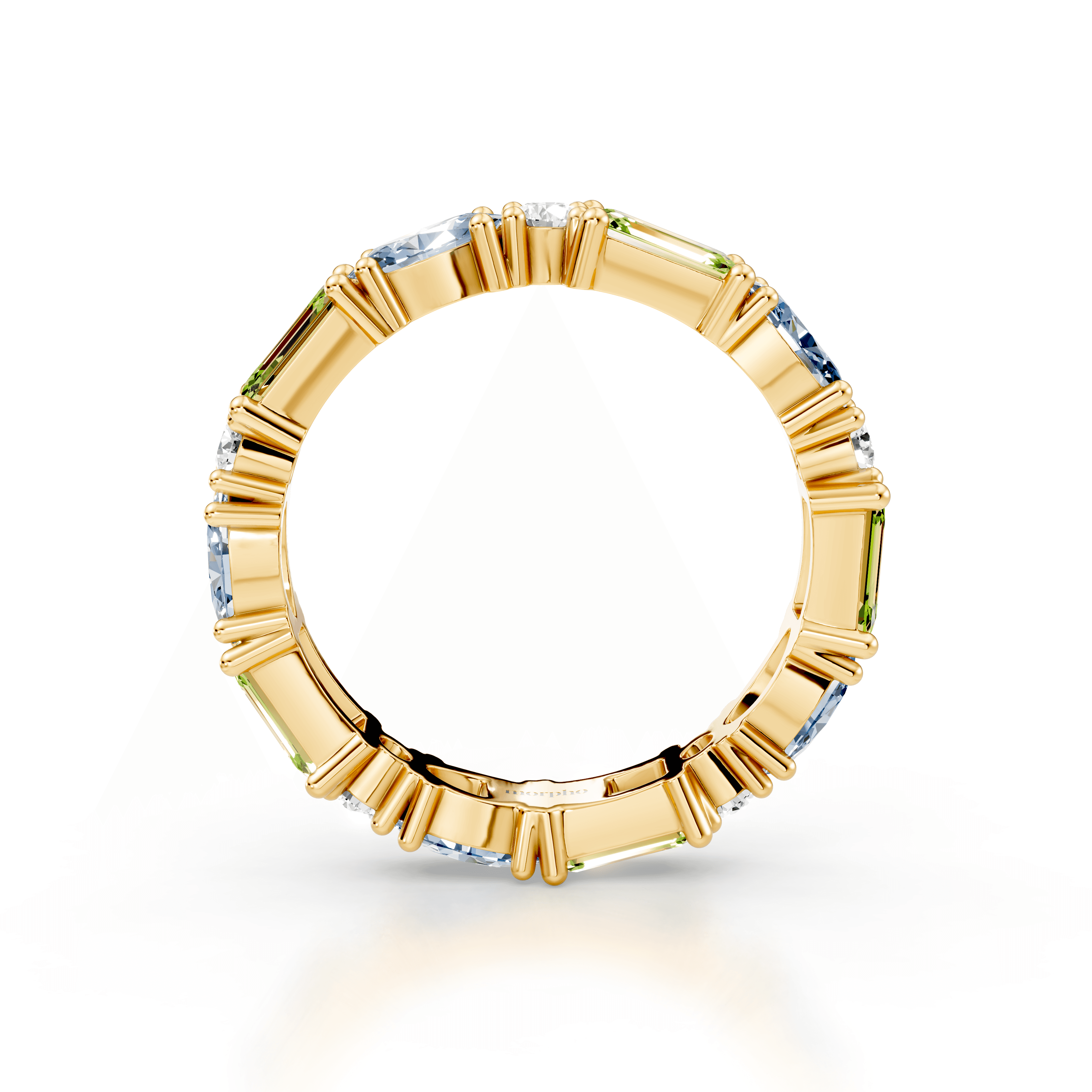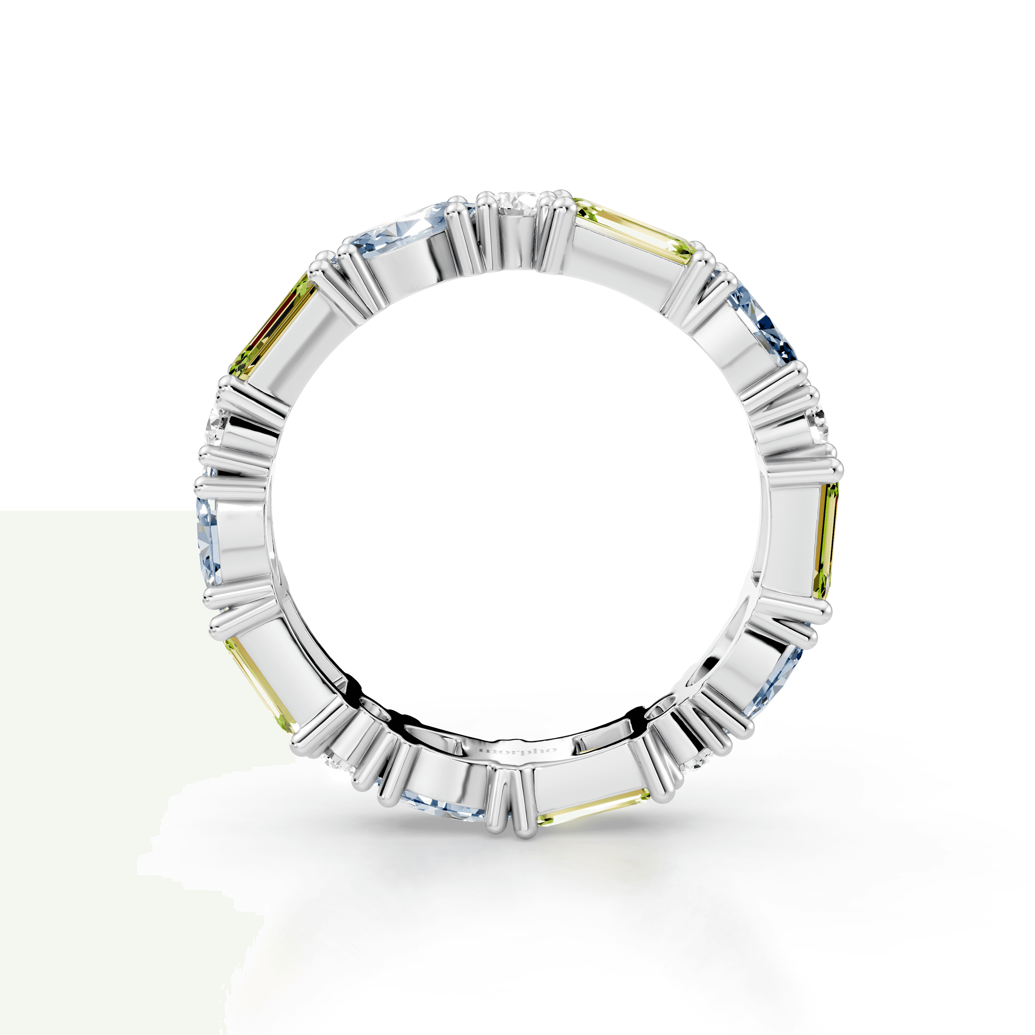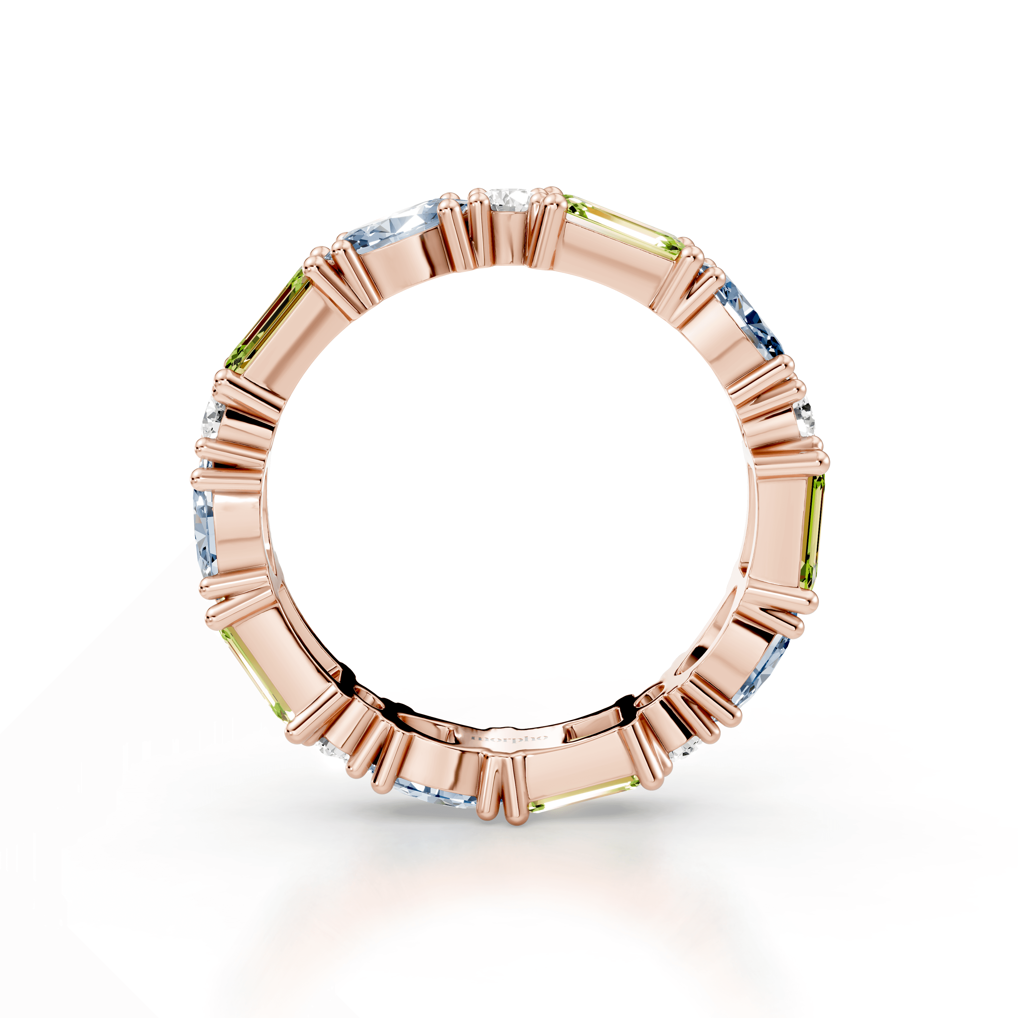 Alternating emerald-cut green and oval blue stones in a claw-set full circle.