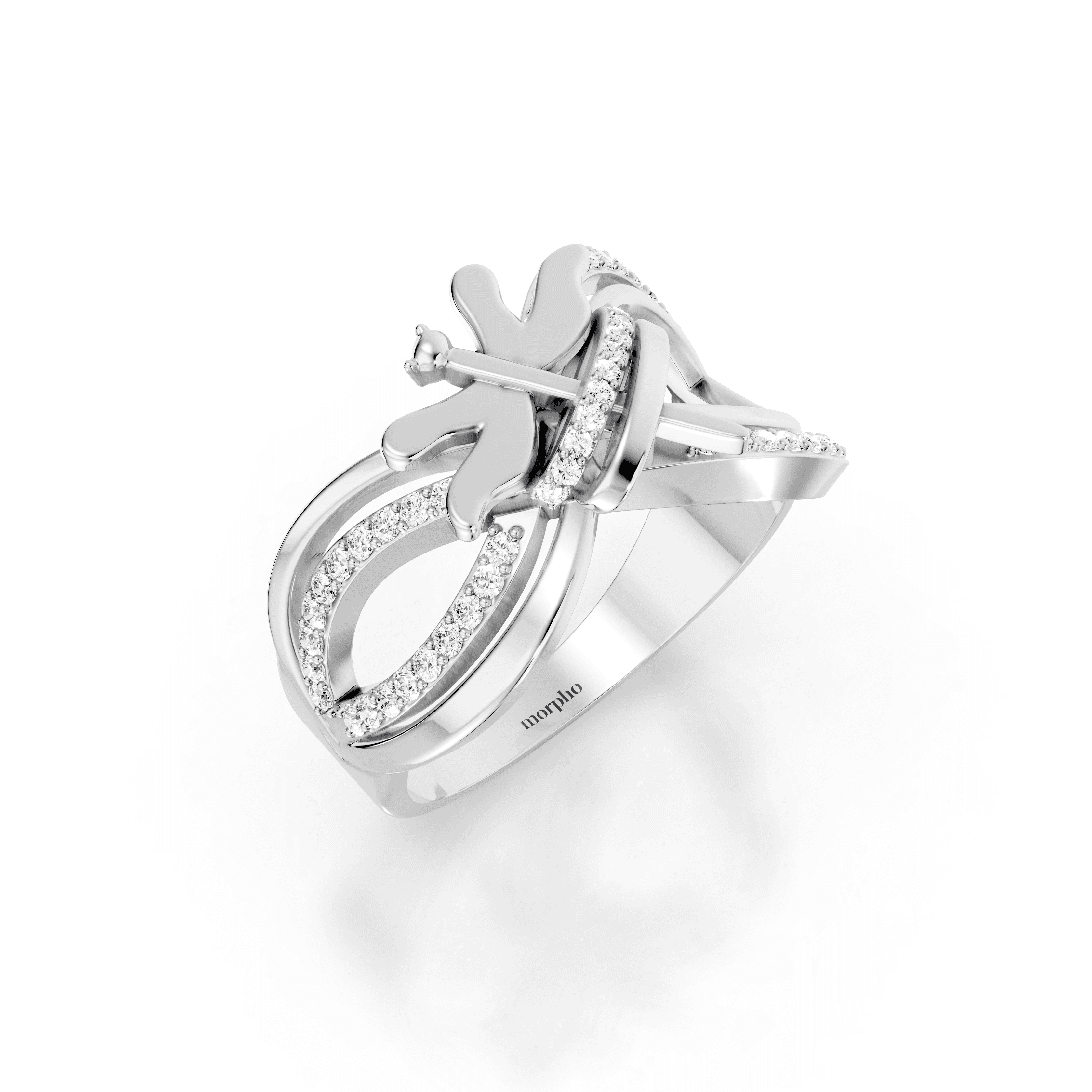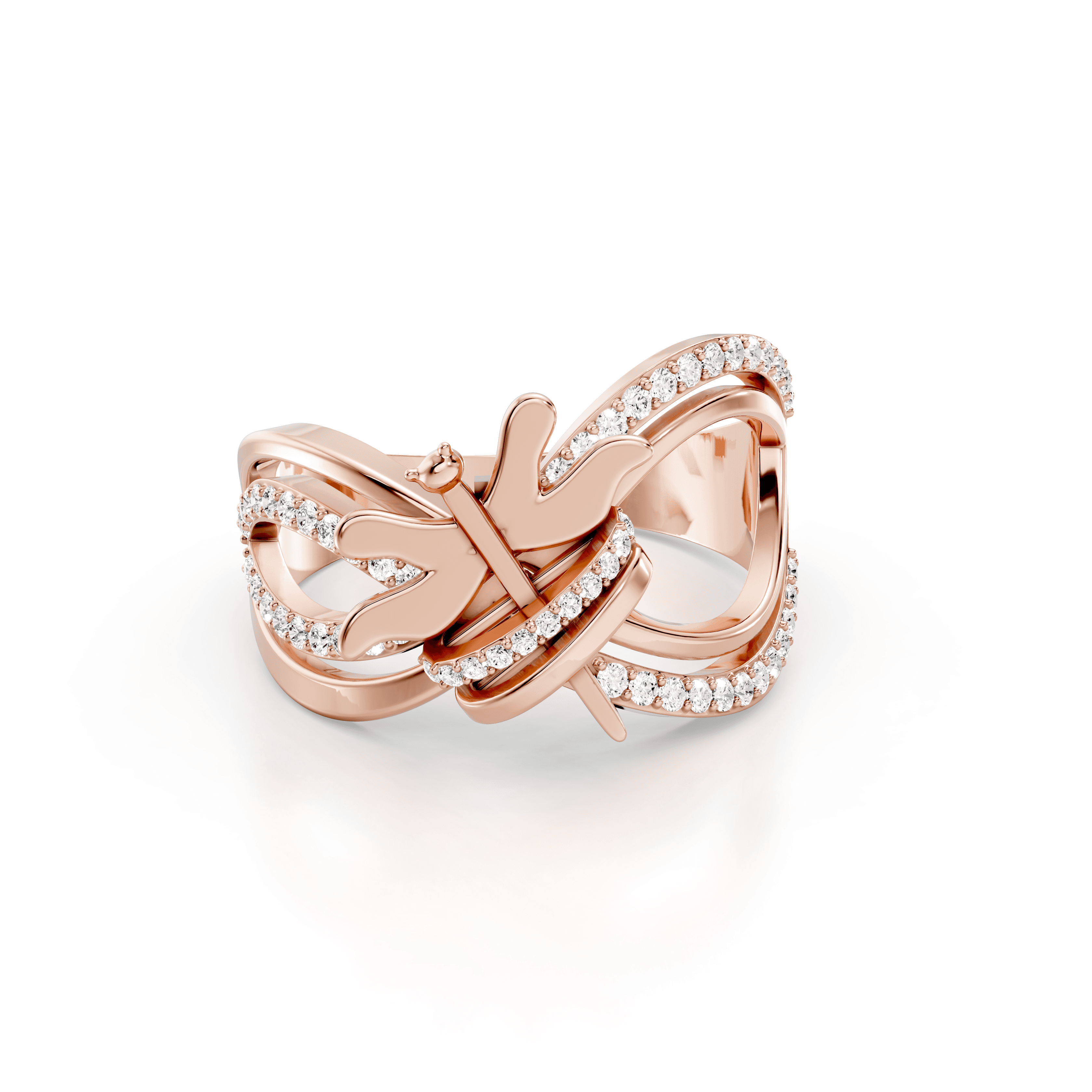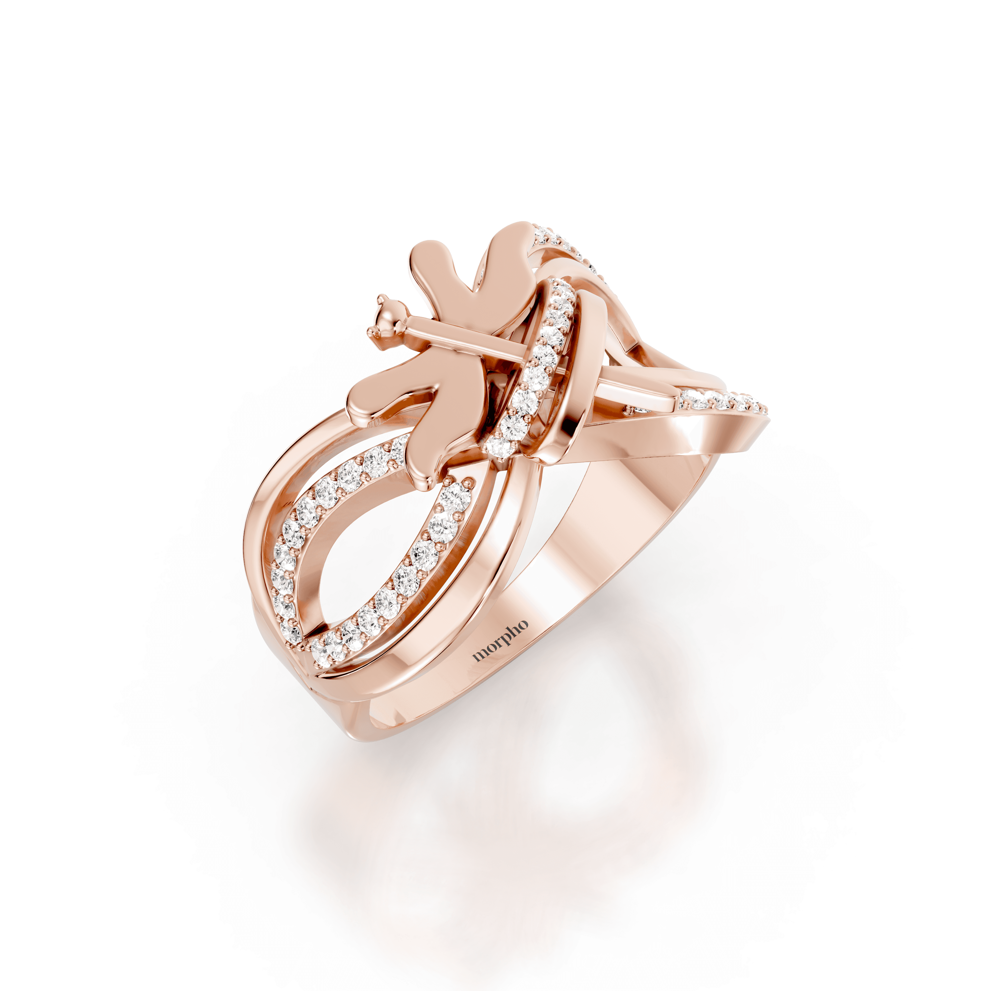 Multi-band cocktail ring with intertwining polished gold loops, pavé diamond accents, and a sculptural dragonfly motif designed for dimensional, statement wear.