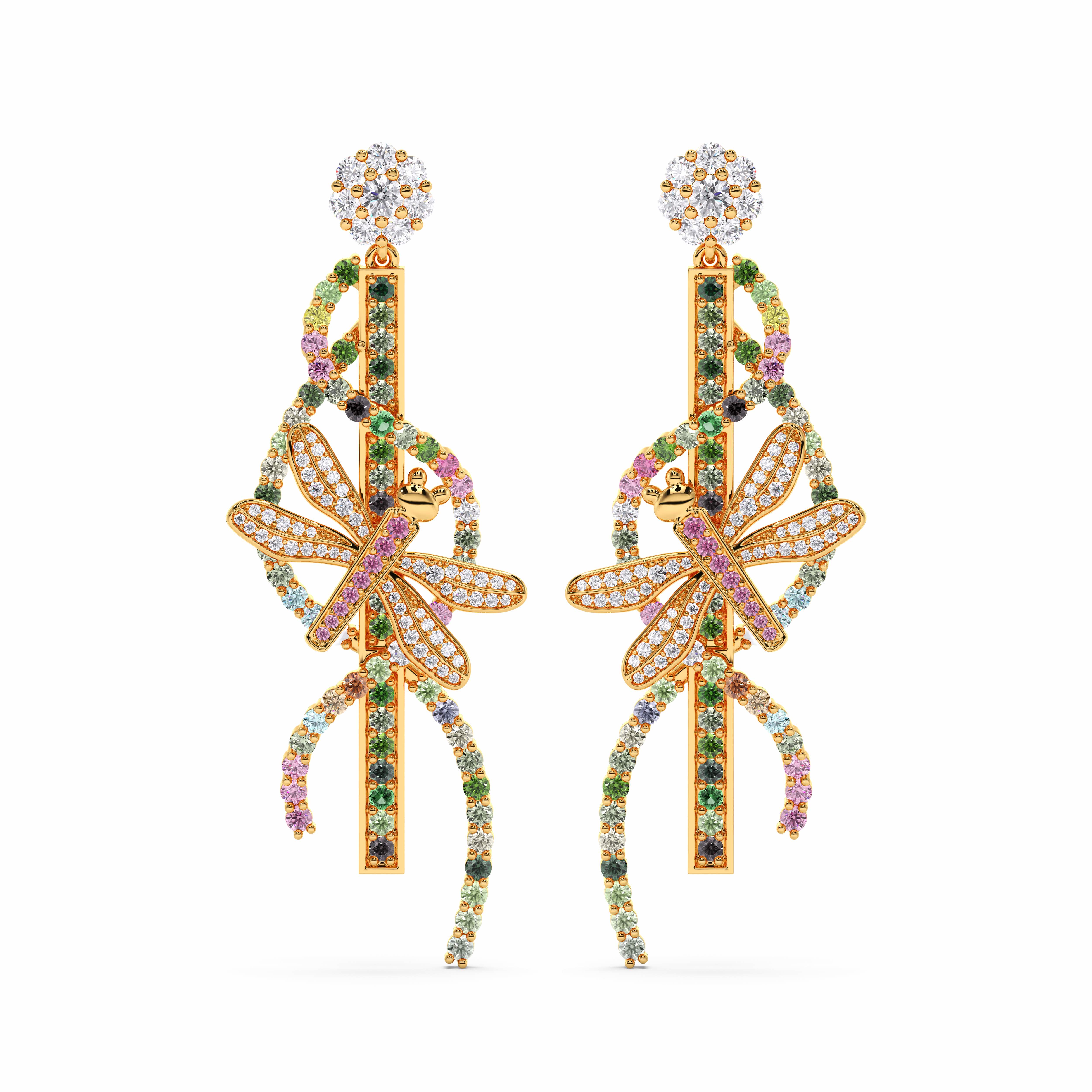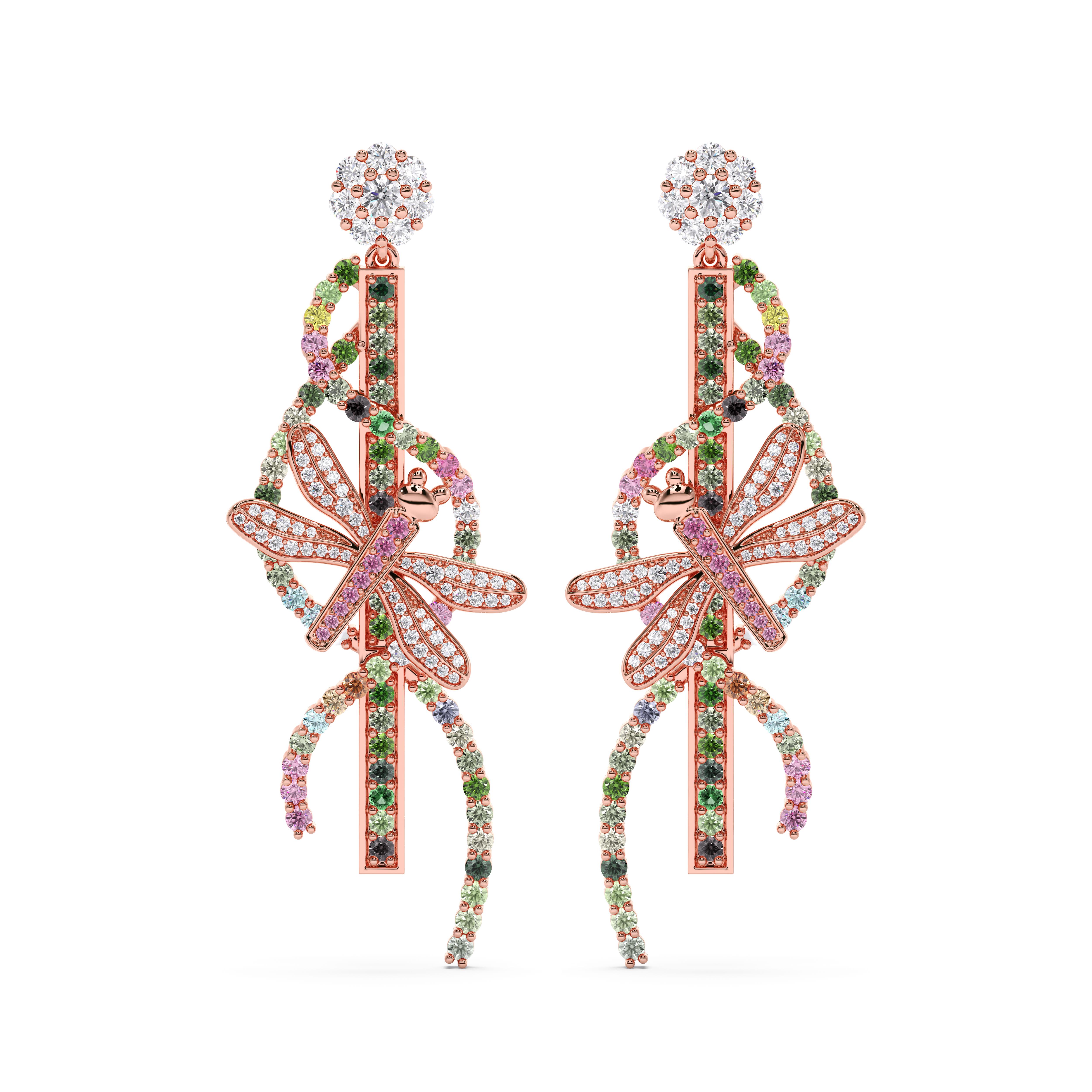 Drop earrings with multicolour Tourmaline loops and pavé dragonfly detail.