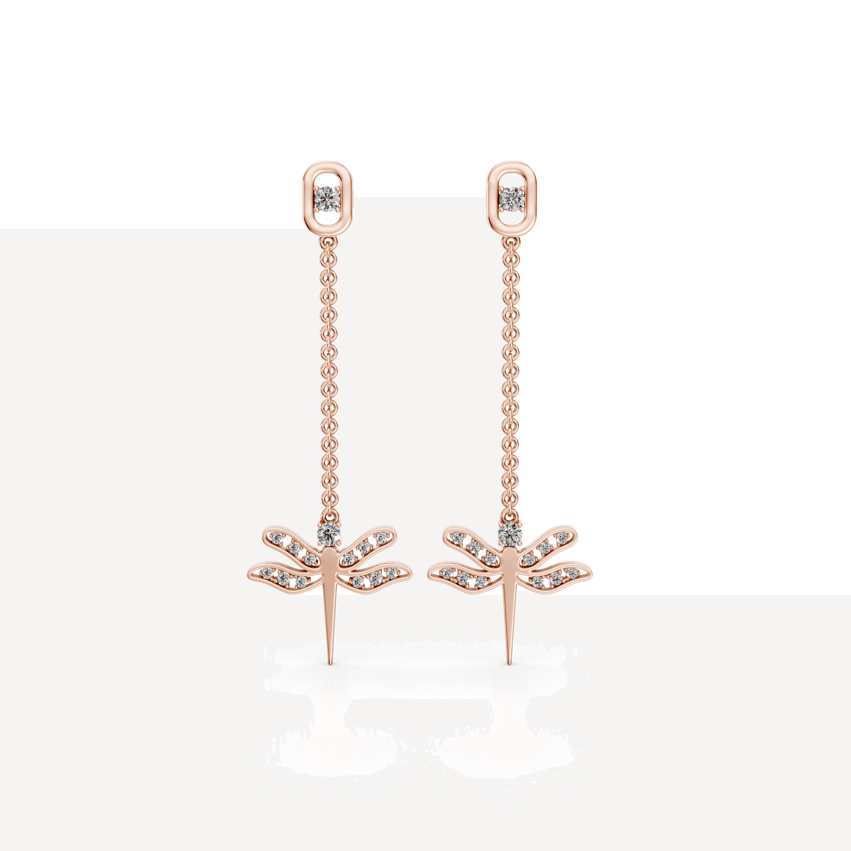 Linear chain earrings with pavé dragonflies and bezel top link