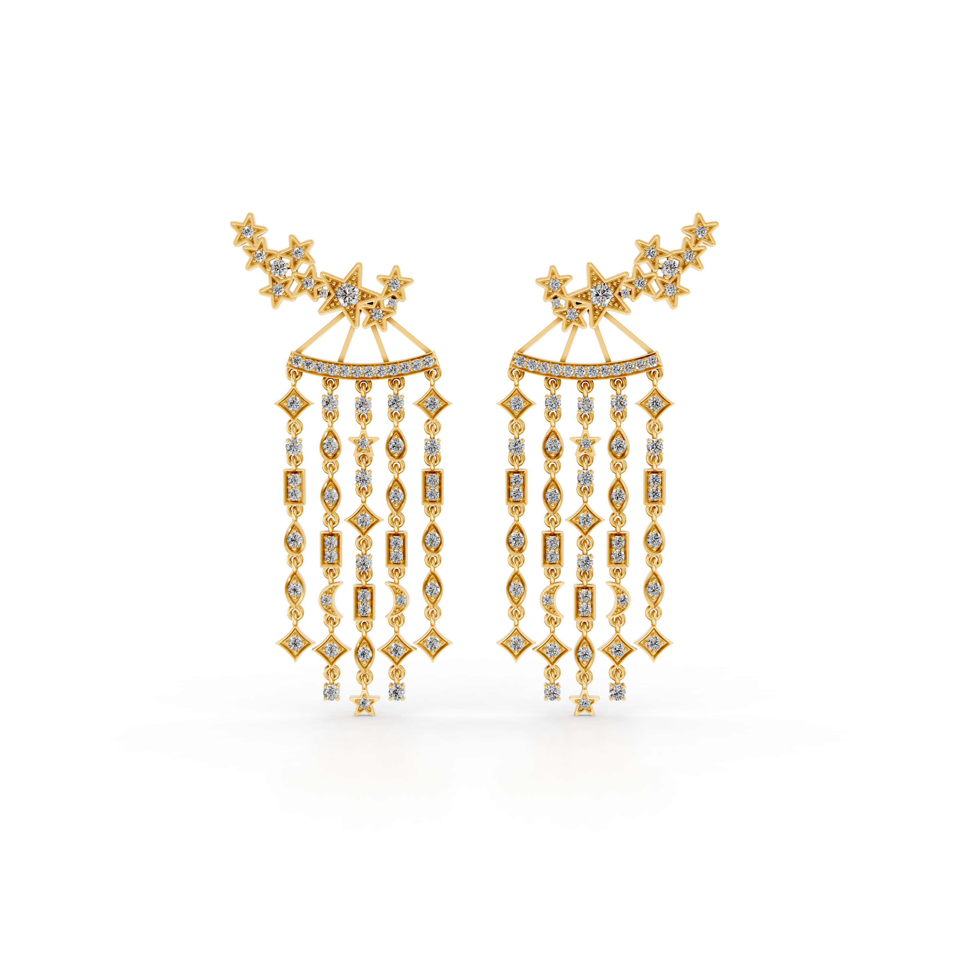 Stud earrings featuring starburst forms with central diamonds and radiating prong-set accents.