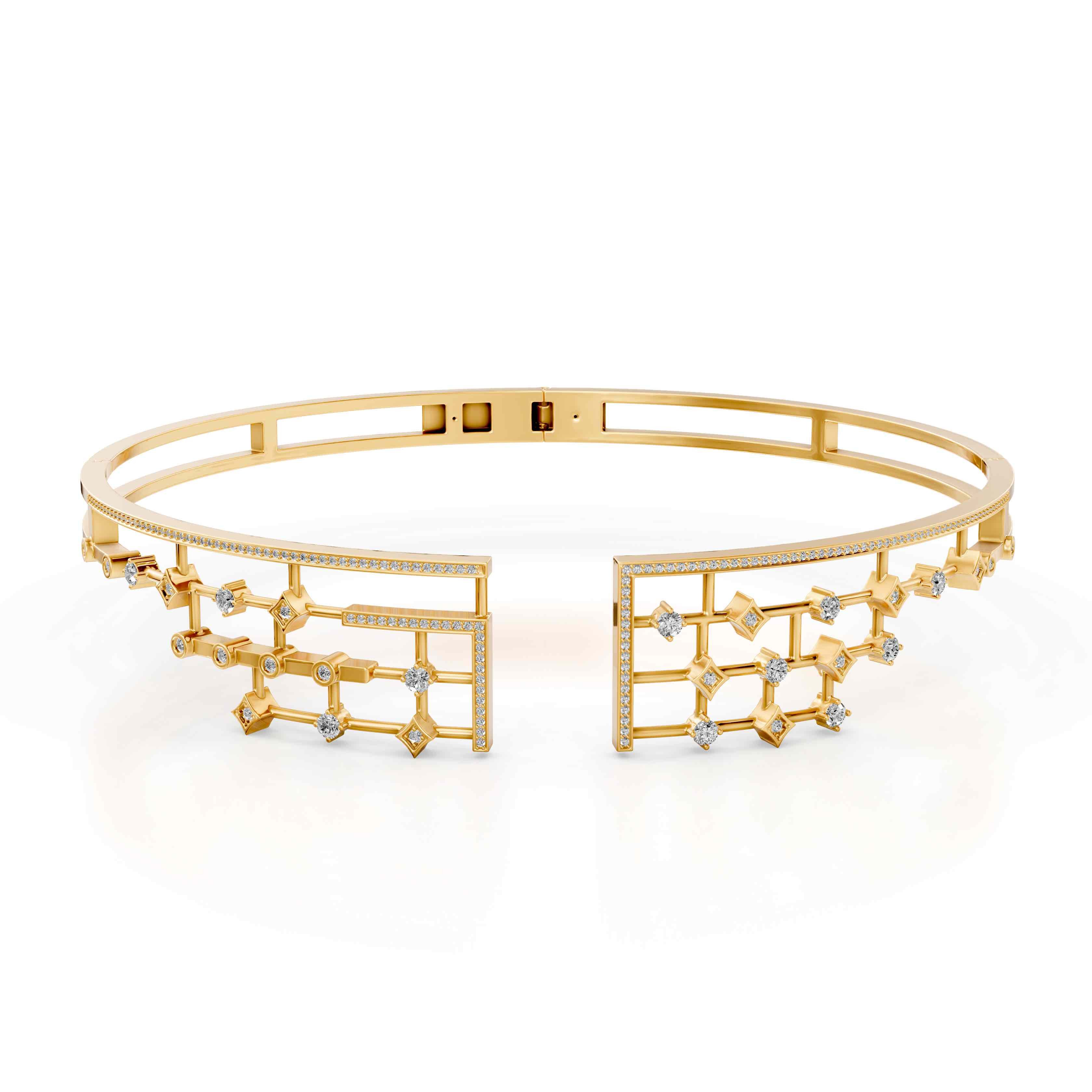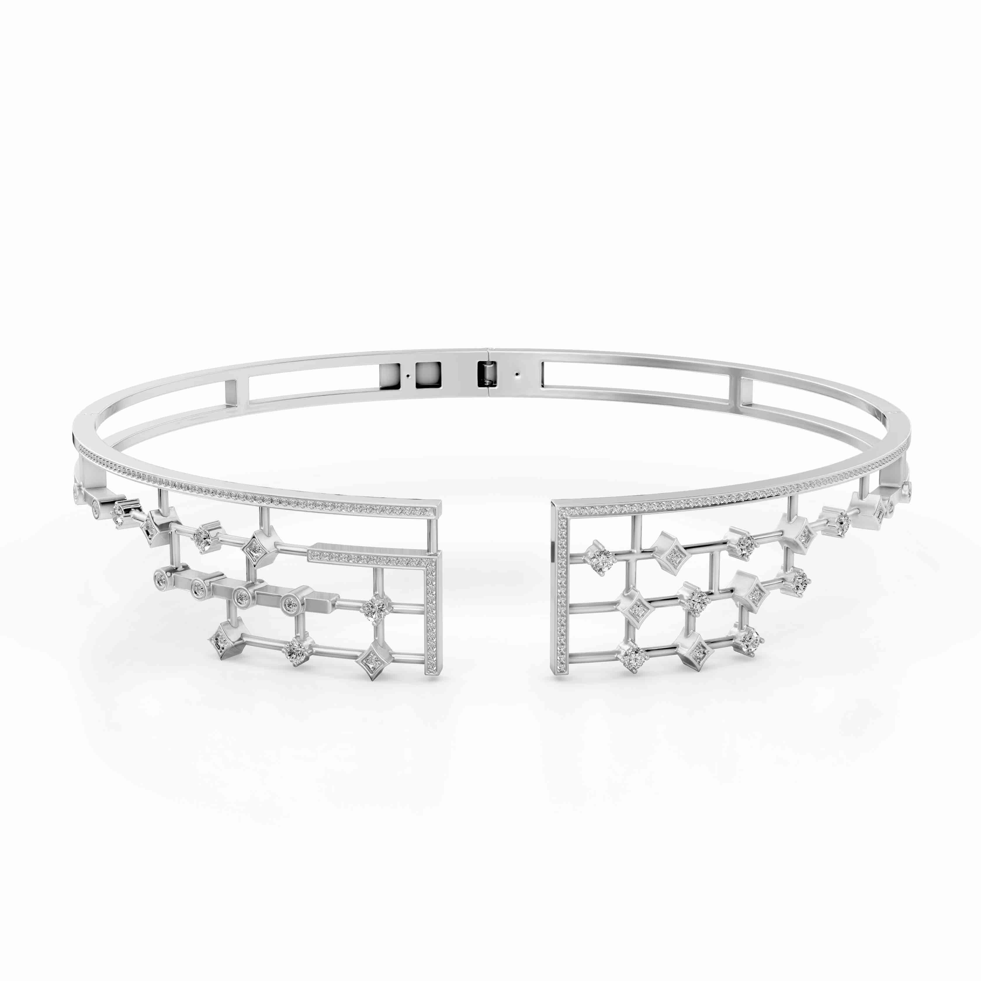 Very stiff choker constructed with geometric diamond-set panels designed to hold a sculptural shape.