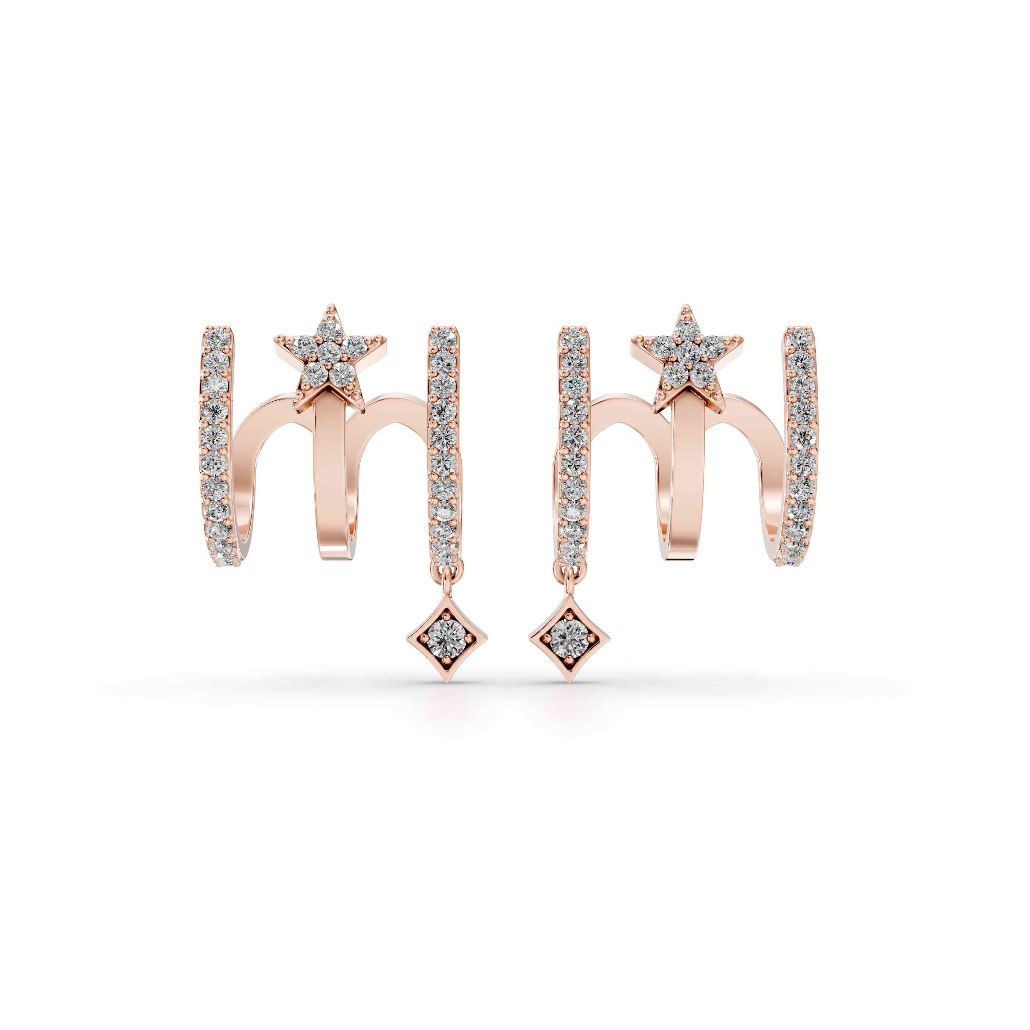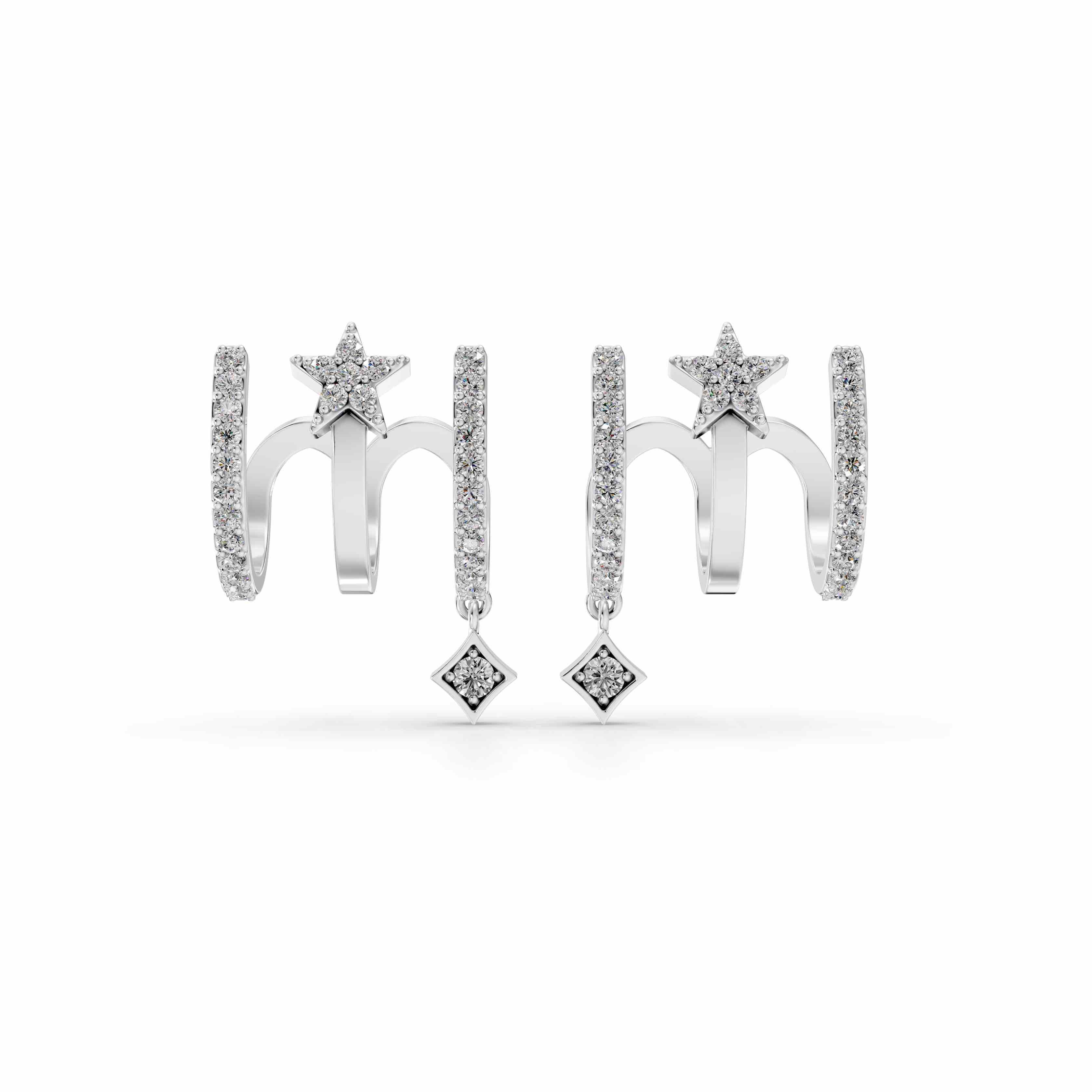 Hoop earrings accented with diamond-set geometric drops for sharp, architectural movement.