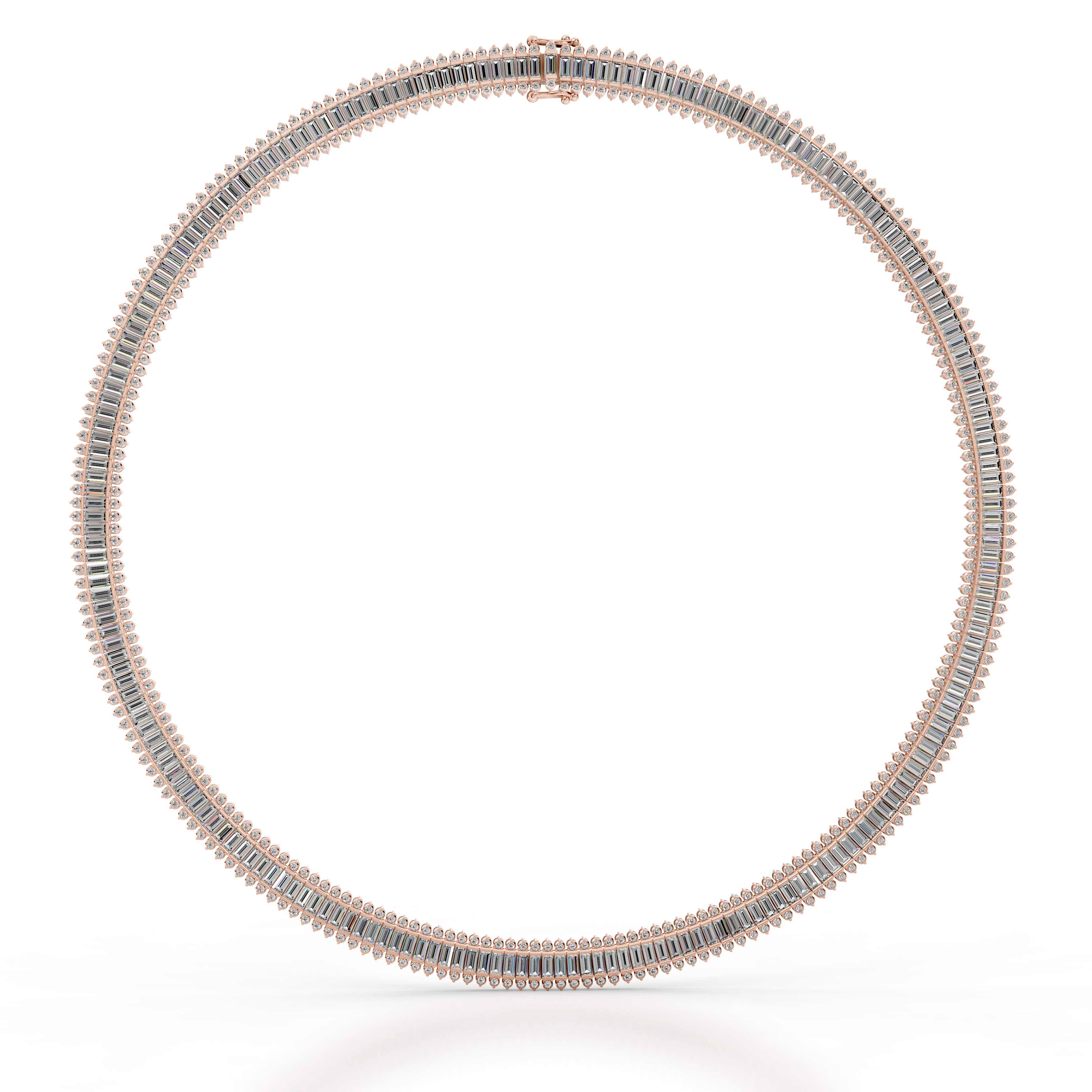 Triple-row graduated necklace with round and baguette diamonds in a uniform link channel setting.