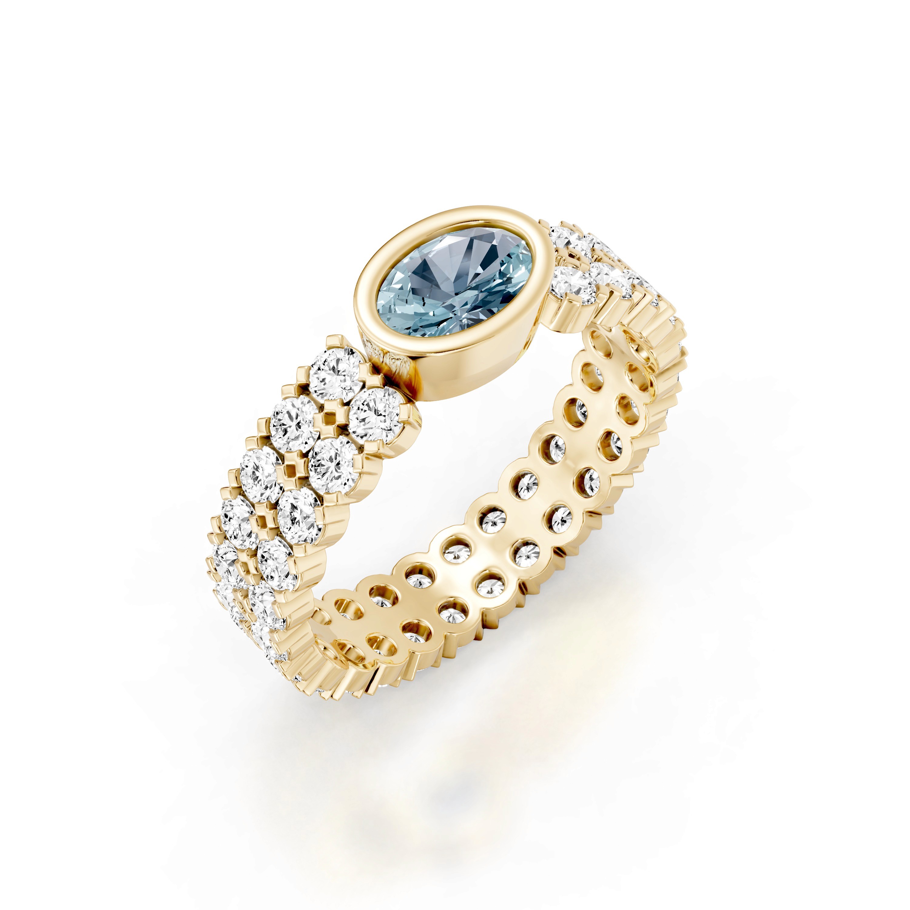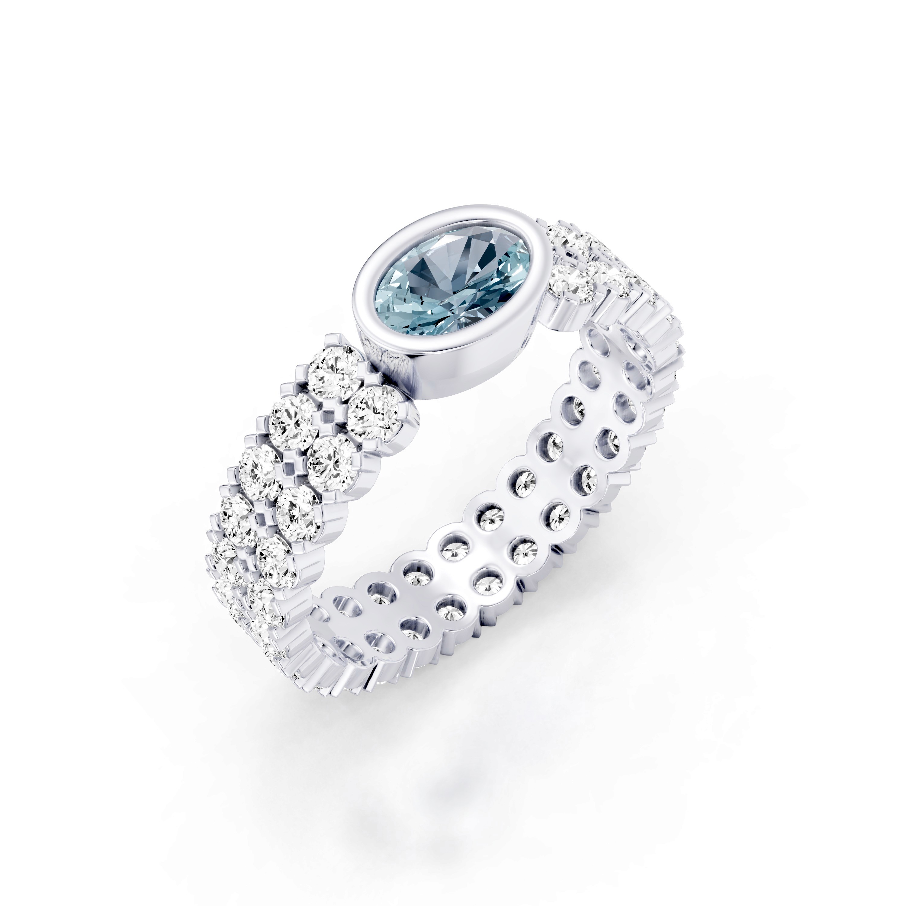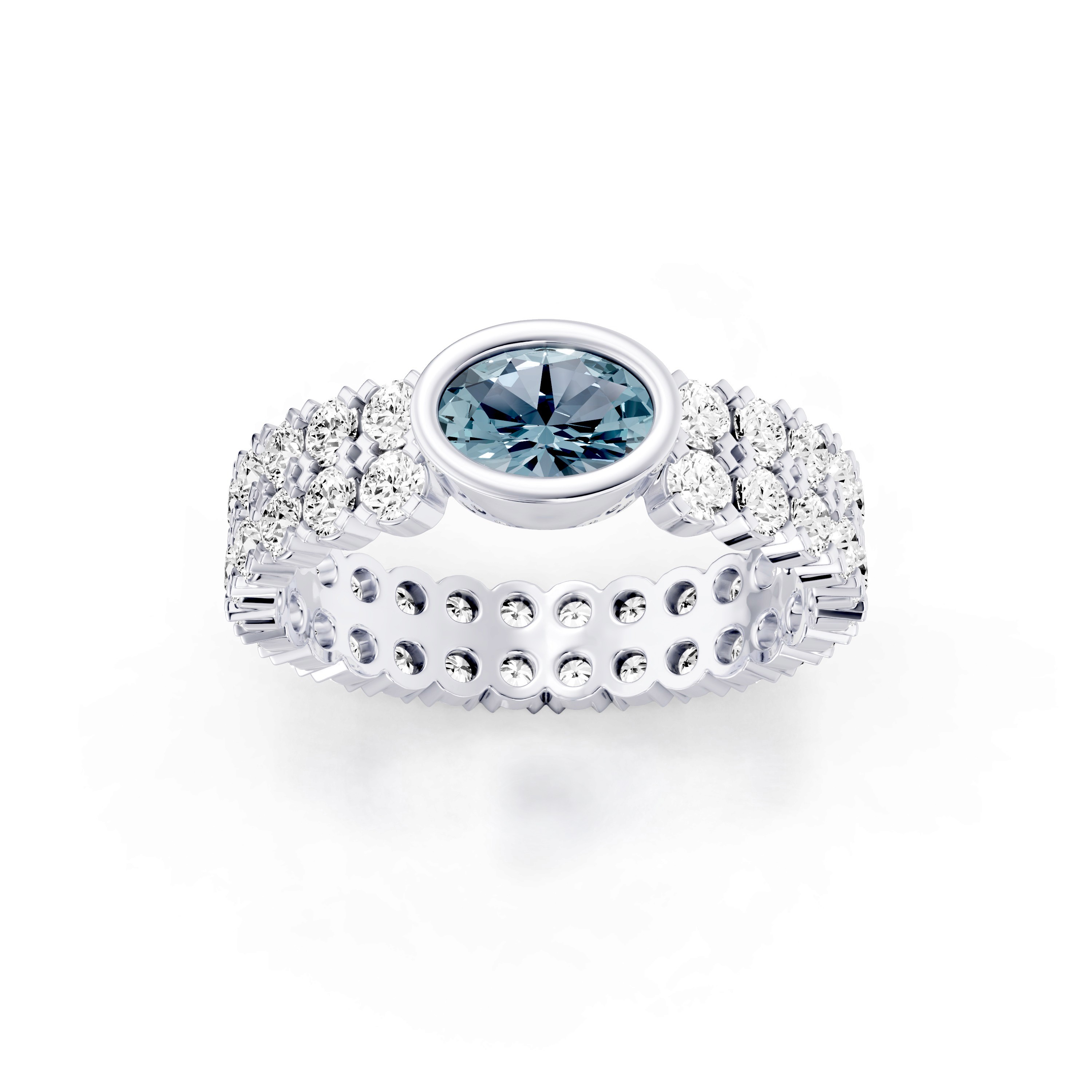 Eternity band composed of oval-cut aquamarine in a bezel, set between double-layered round diamonds in prong setting around the full circumference.