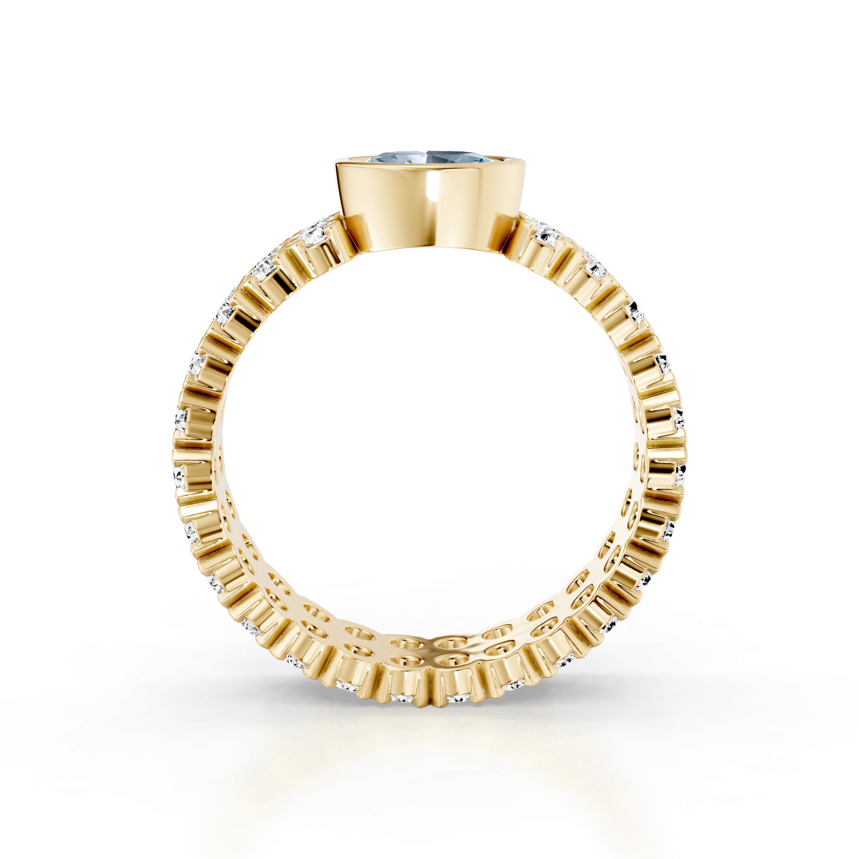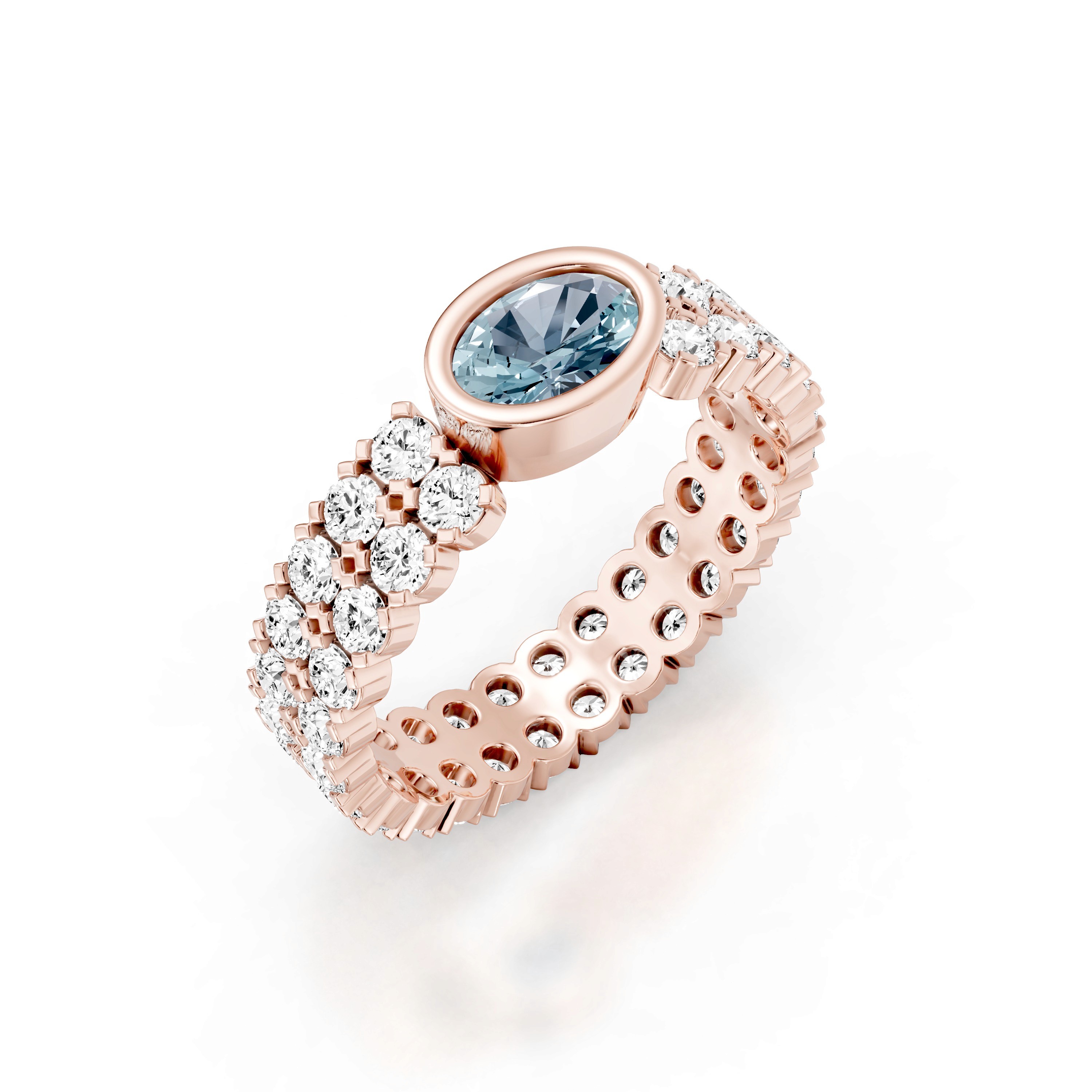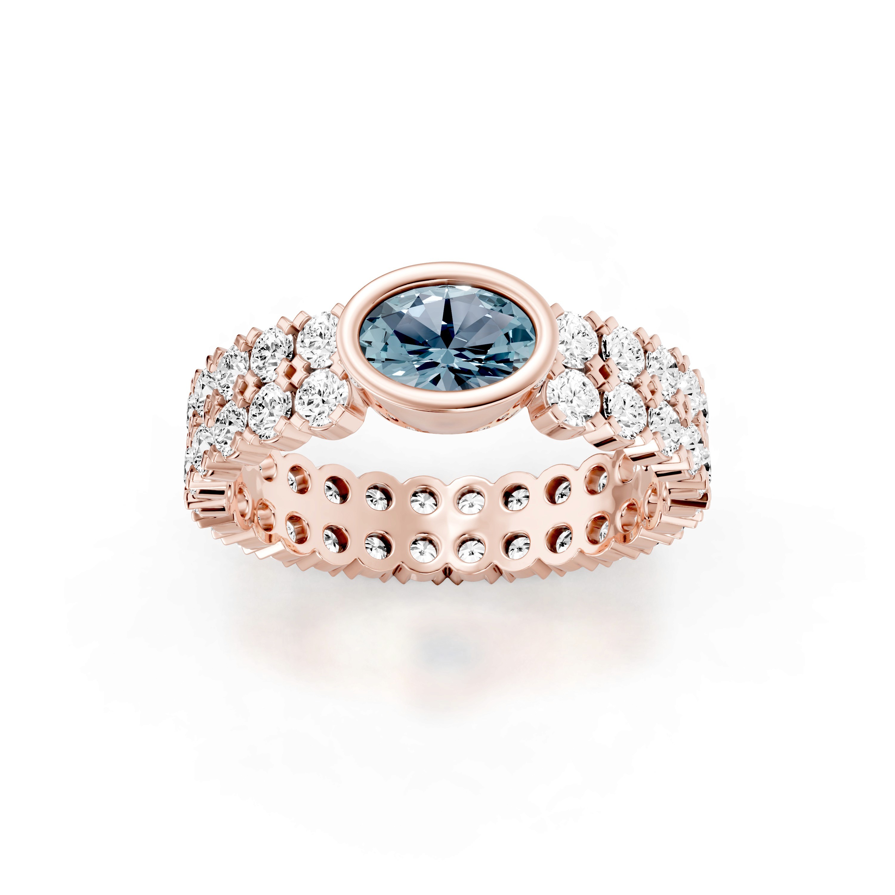 Eternity band composed of oval-cut aquamarine in a bezel, set between double-layered round diamonds in prong setting around the full circumference.