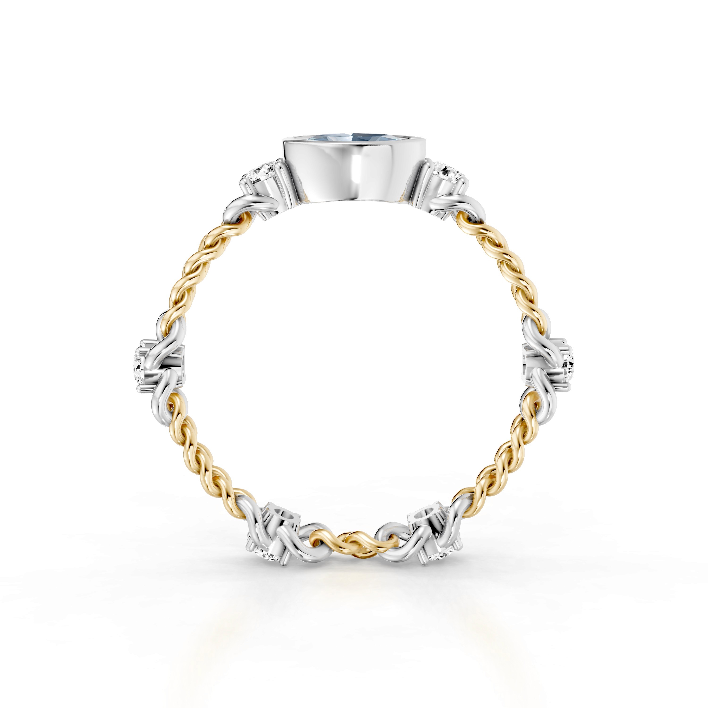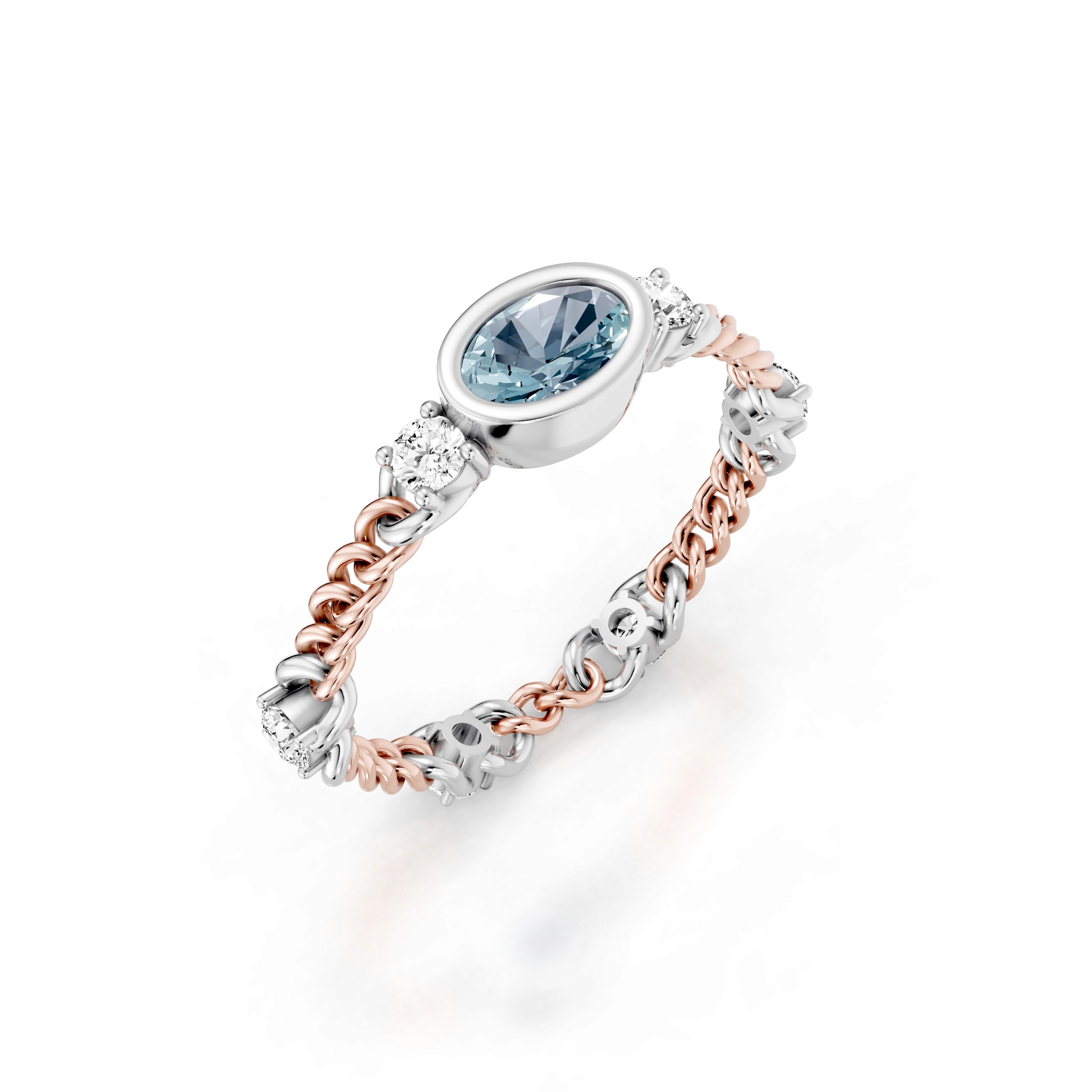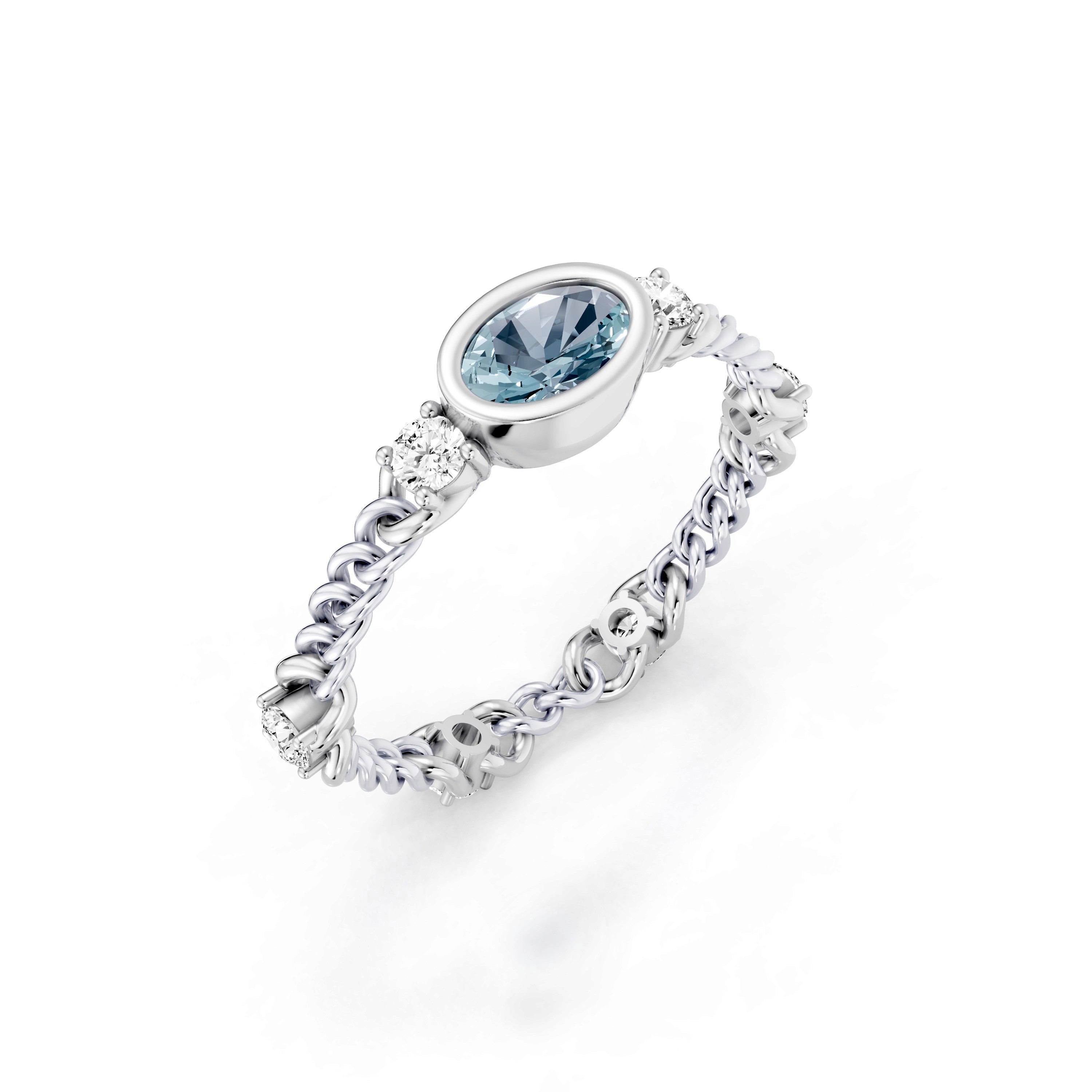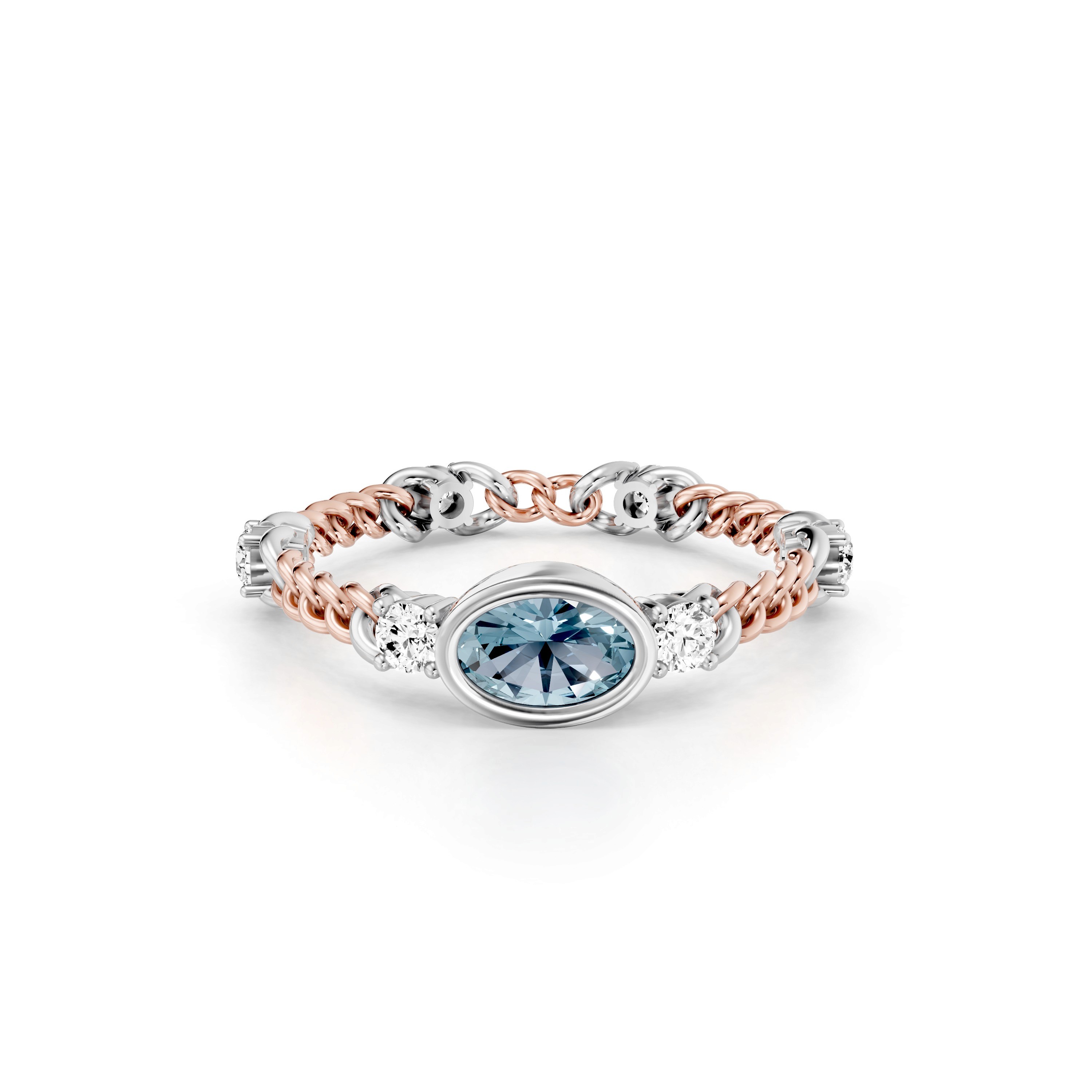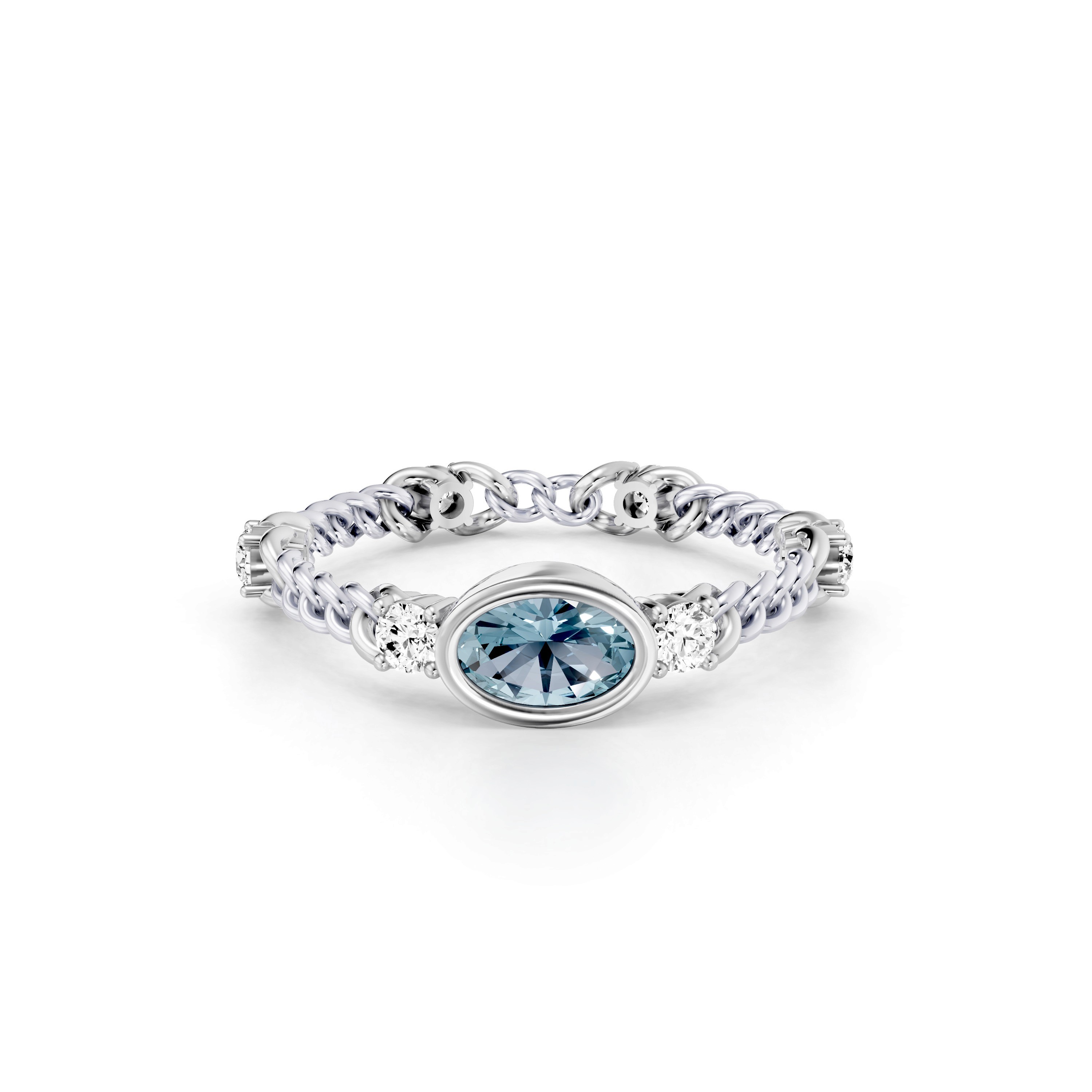 Minimal daily-wear ring featuring an oval-cut aquamarine bezel-set on a fine articulated chain band with intervening round diamonds.