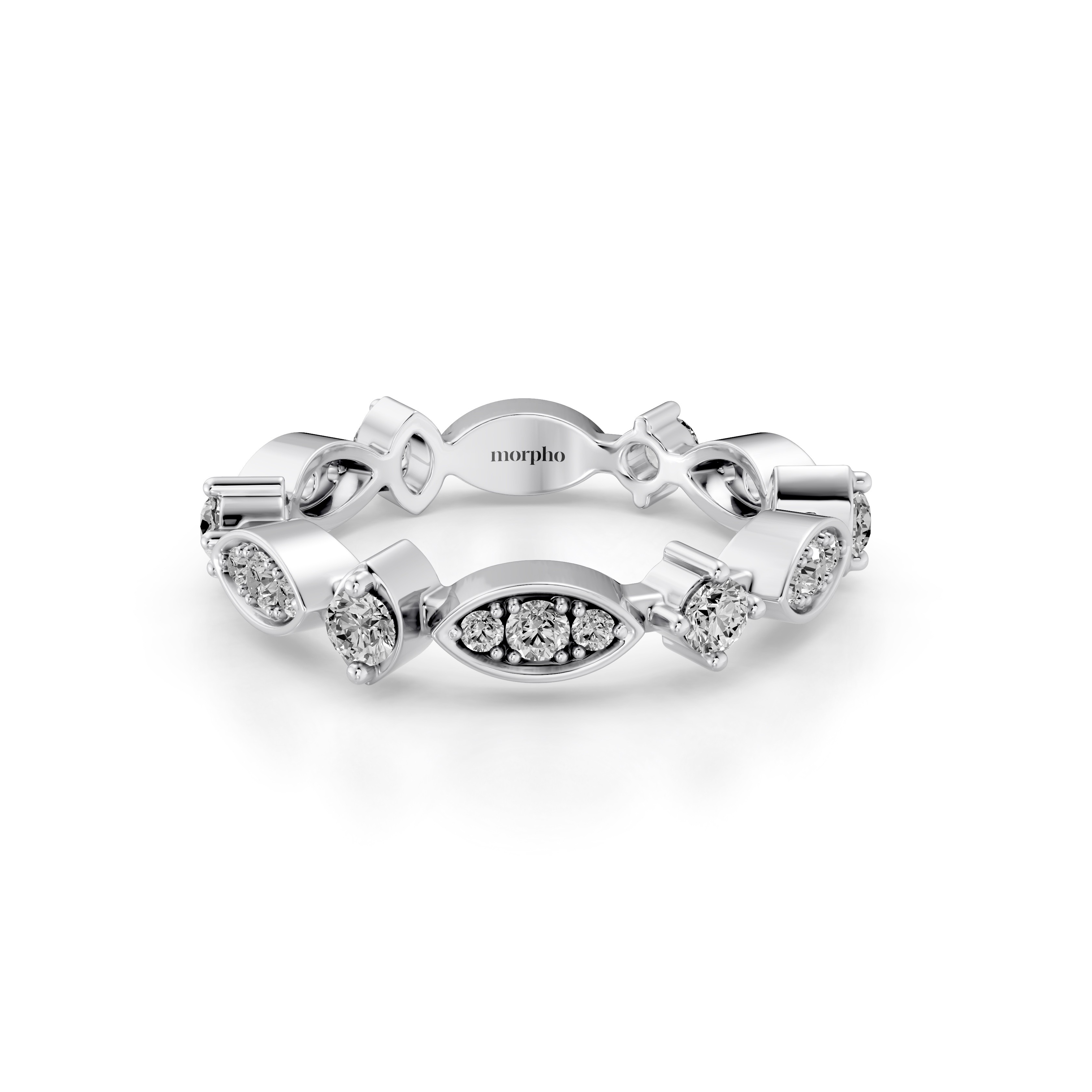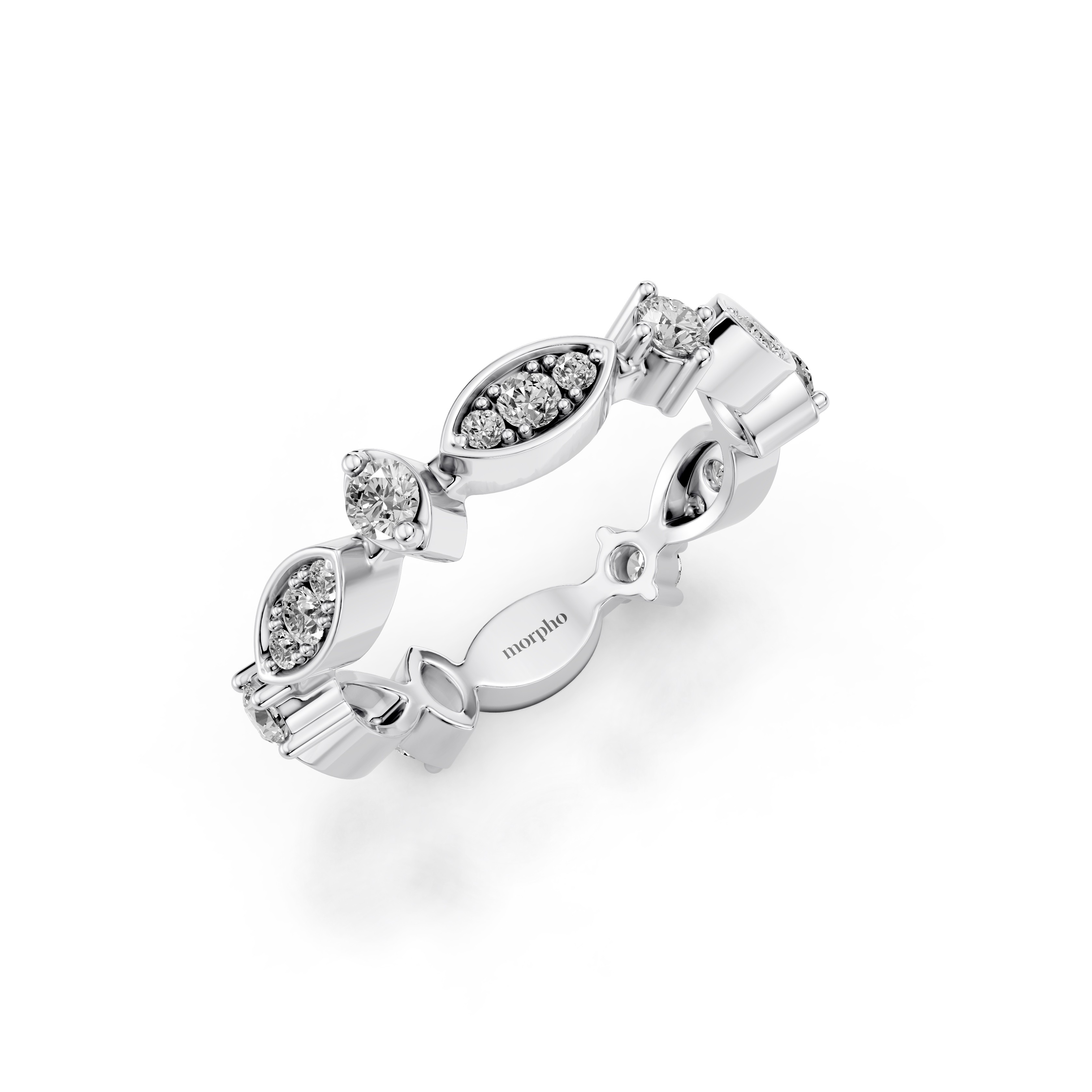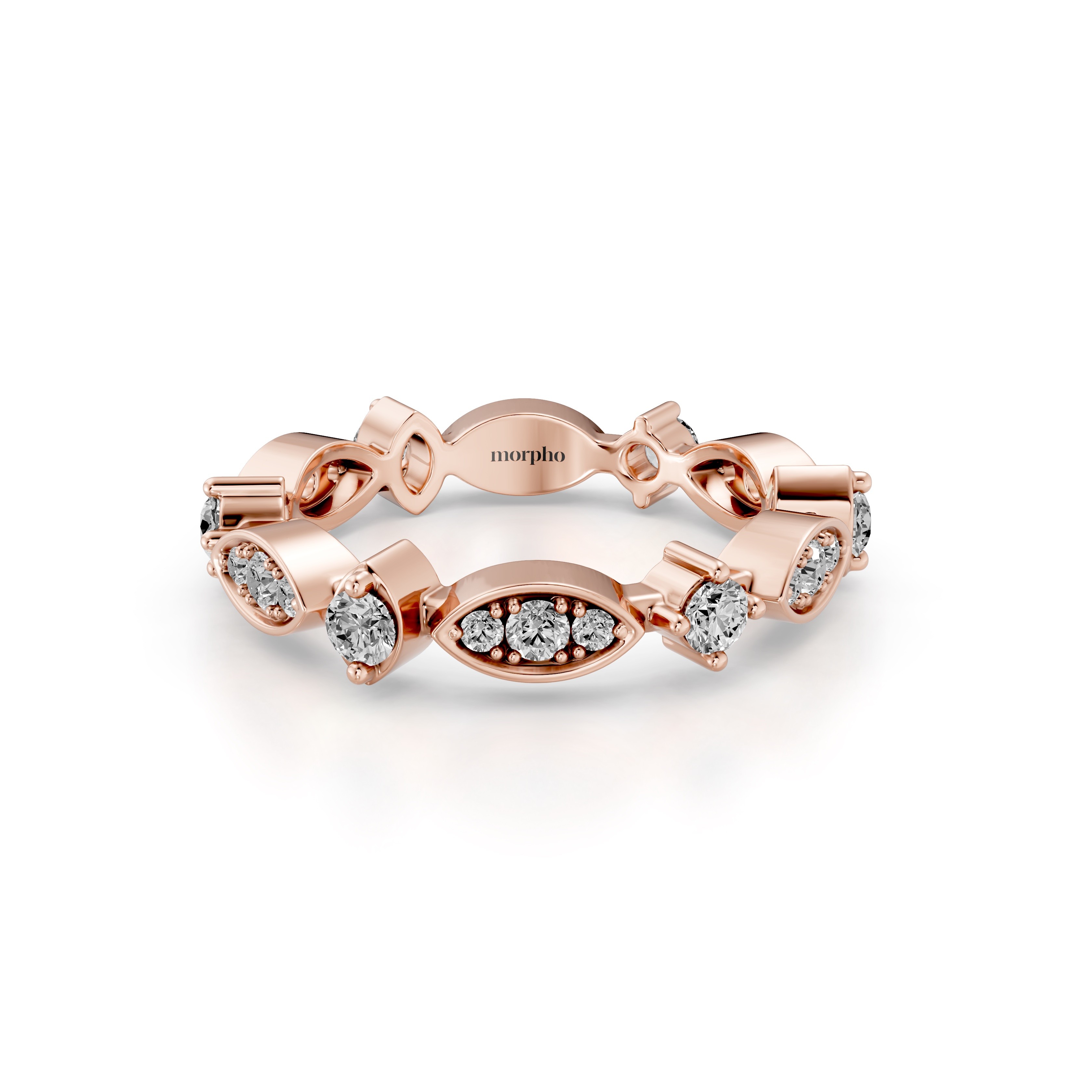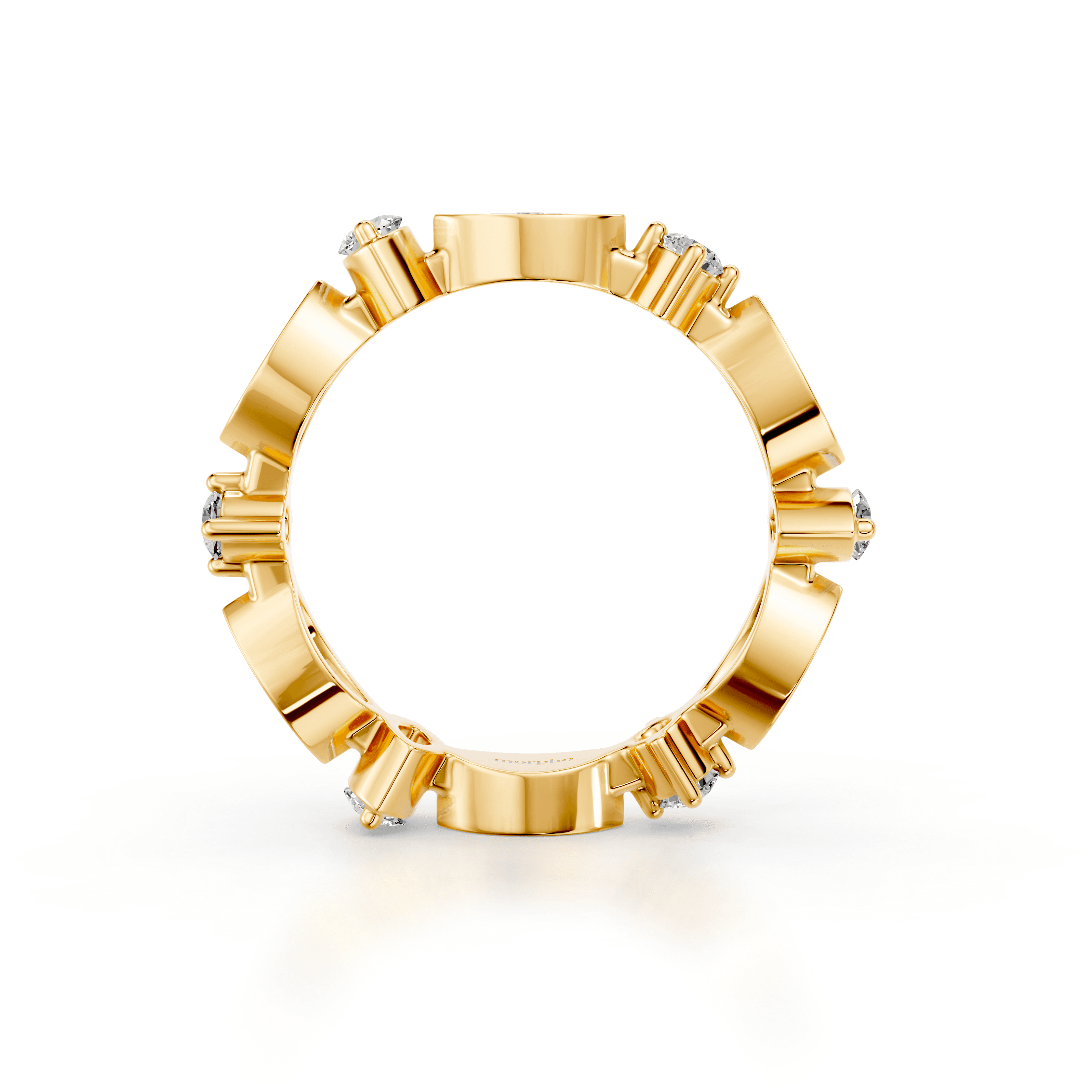 Wide gold eternity band with alternating bezel-set round and marquise diamonds.