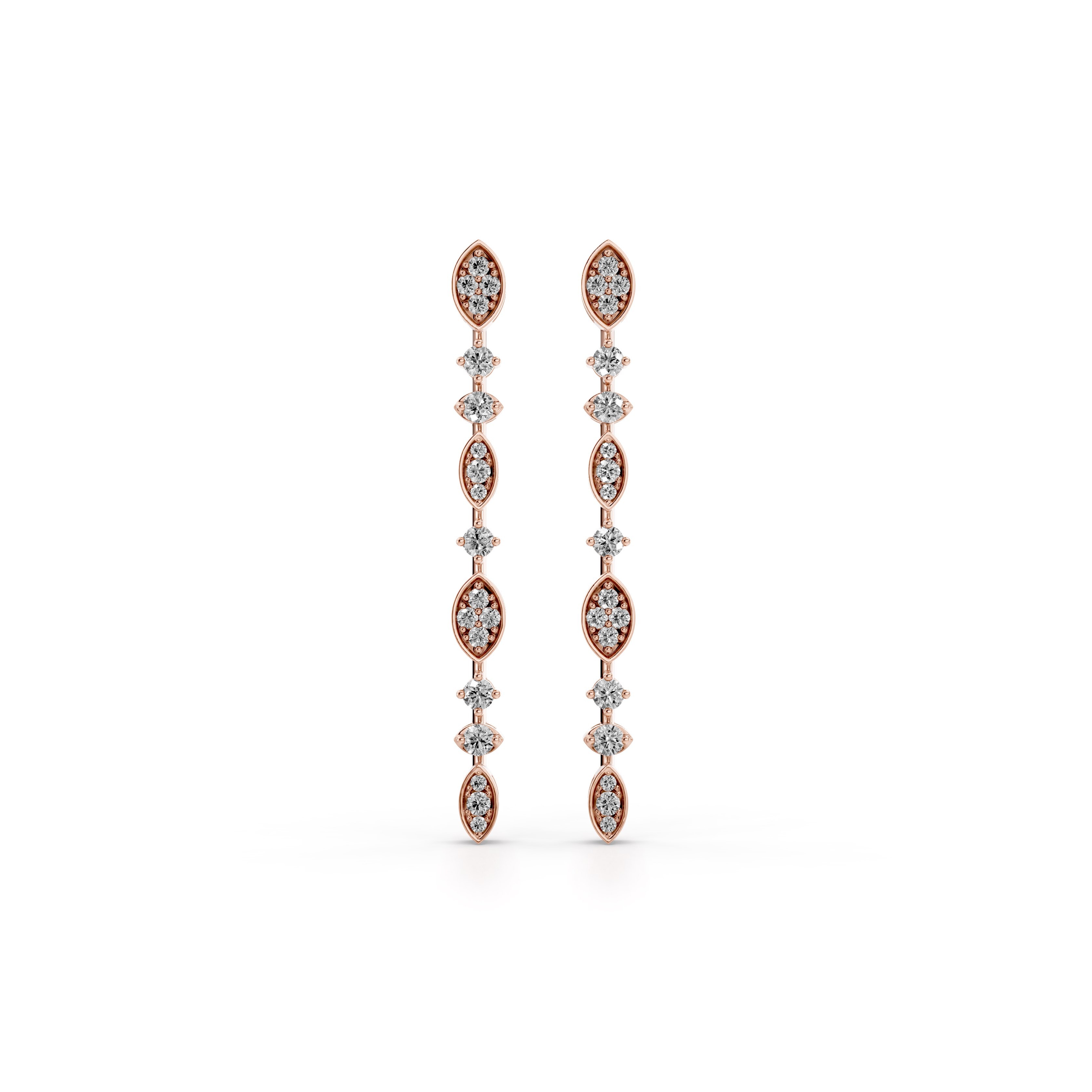 Linear drop earrings featuring a repeating pattern of marquise and round bezel-set diamonds.