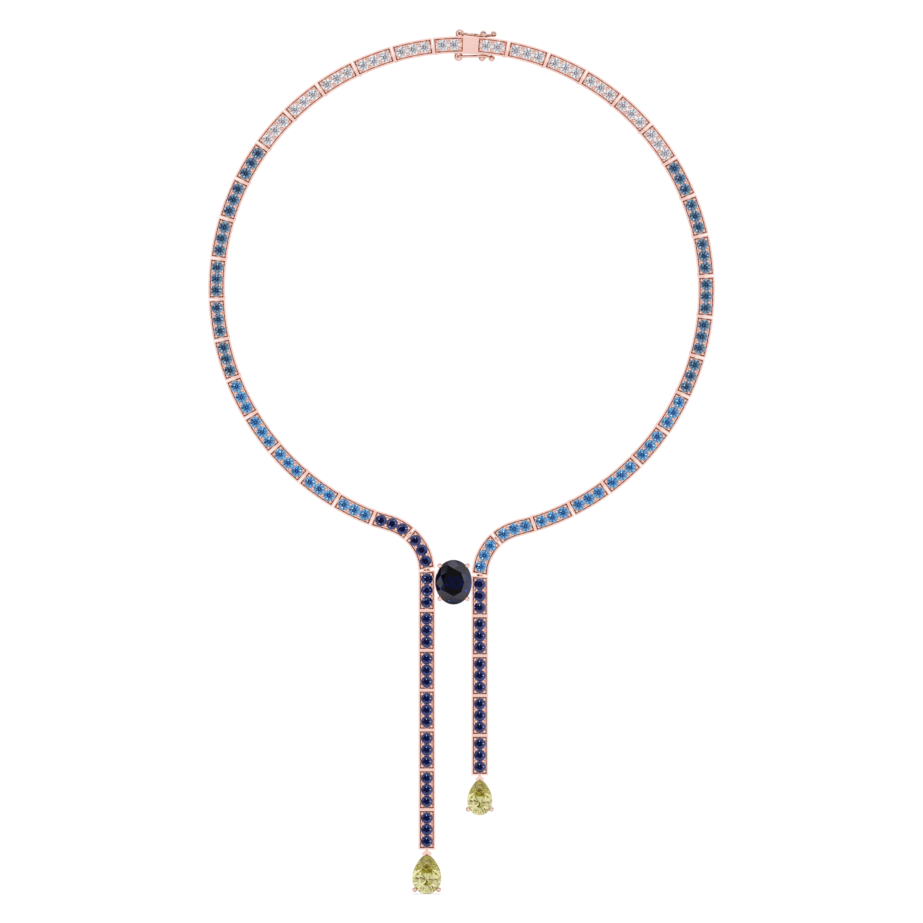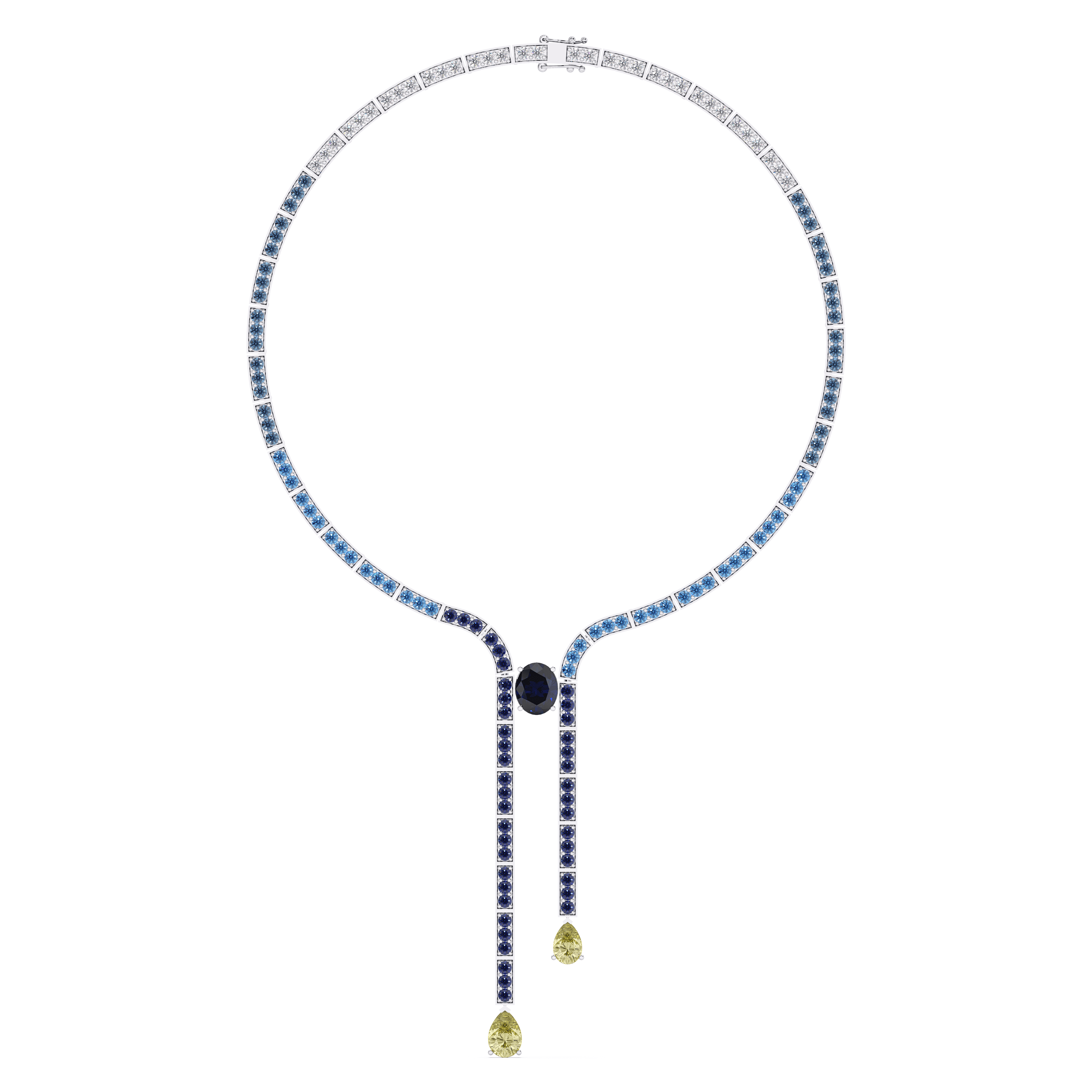 Two-line lariat necklace with ombre-style blue sapphires with a central dark blue sapphire cabochon bezel-set in gold, linked by diamond pavé bars in gold.