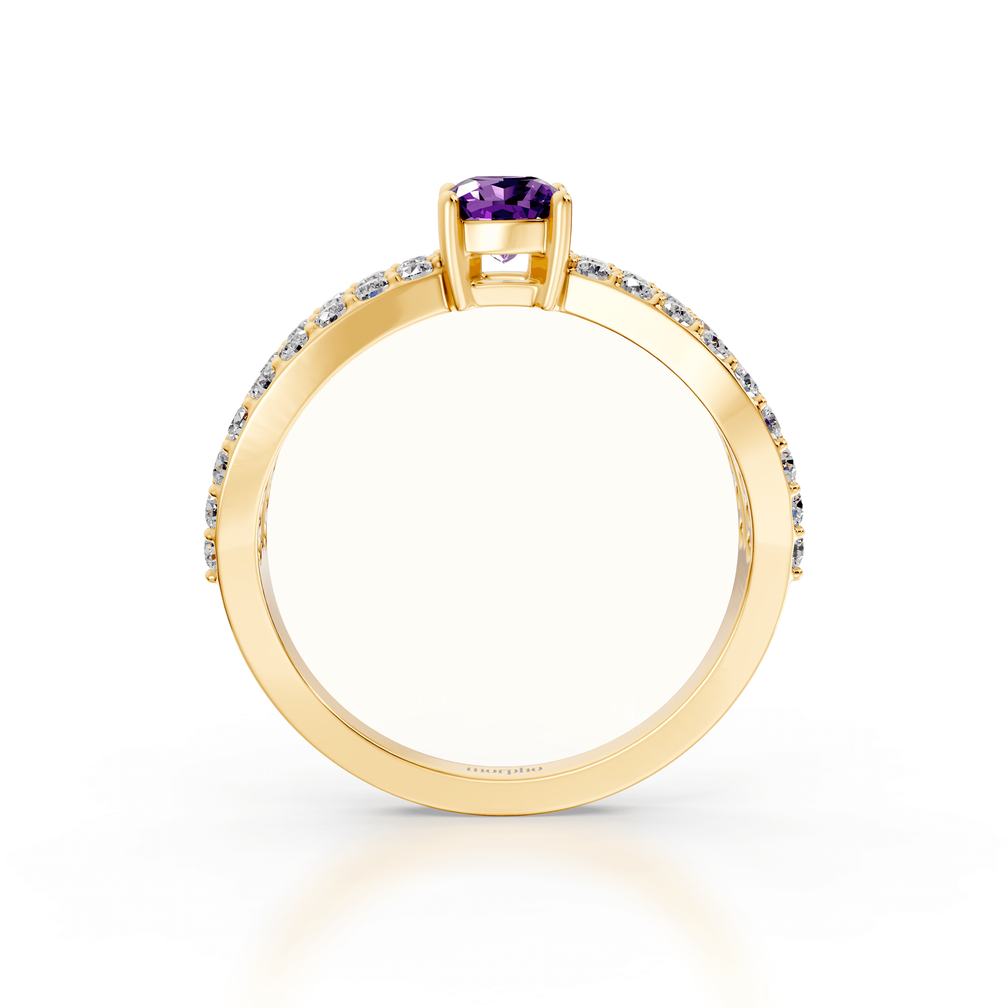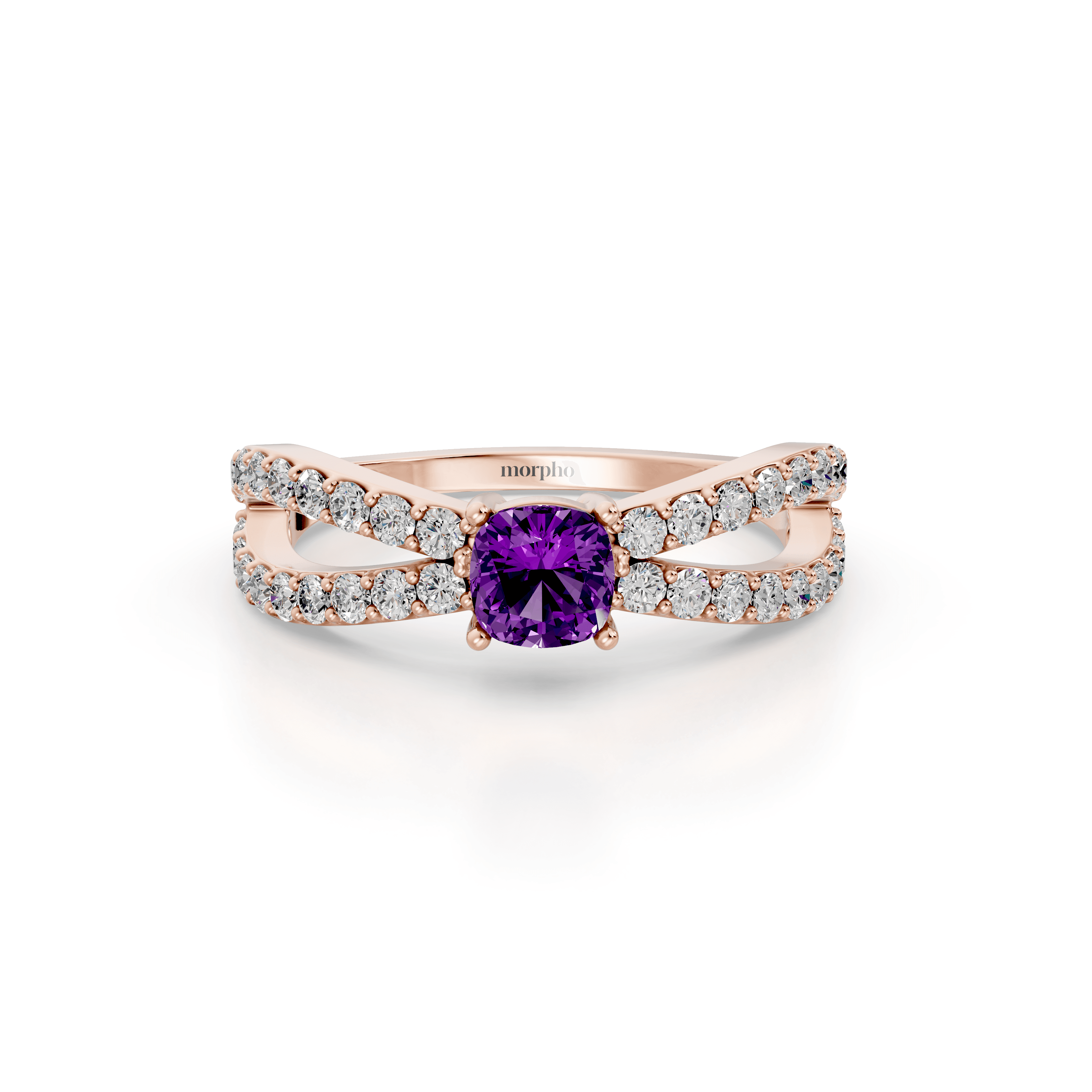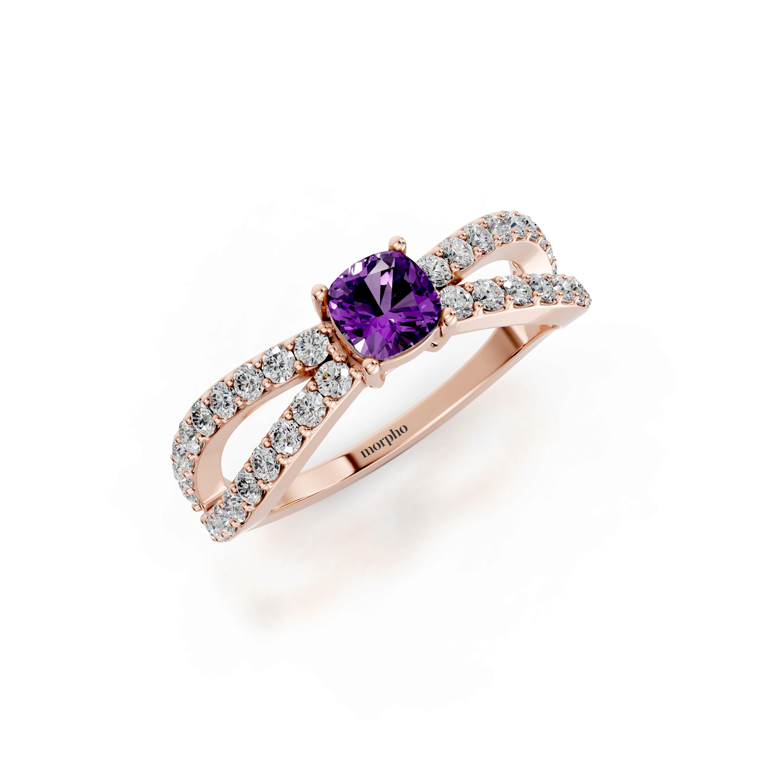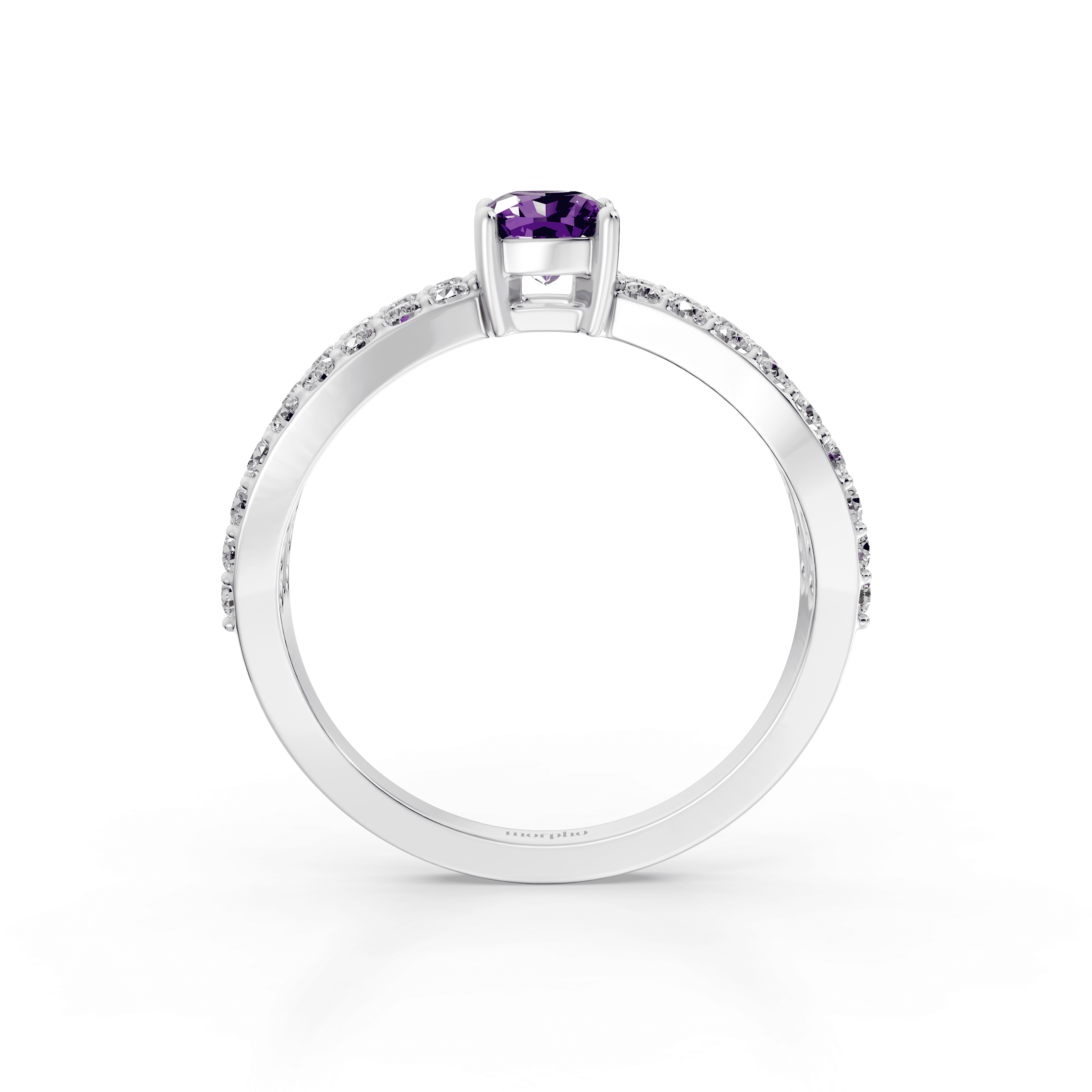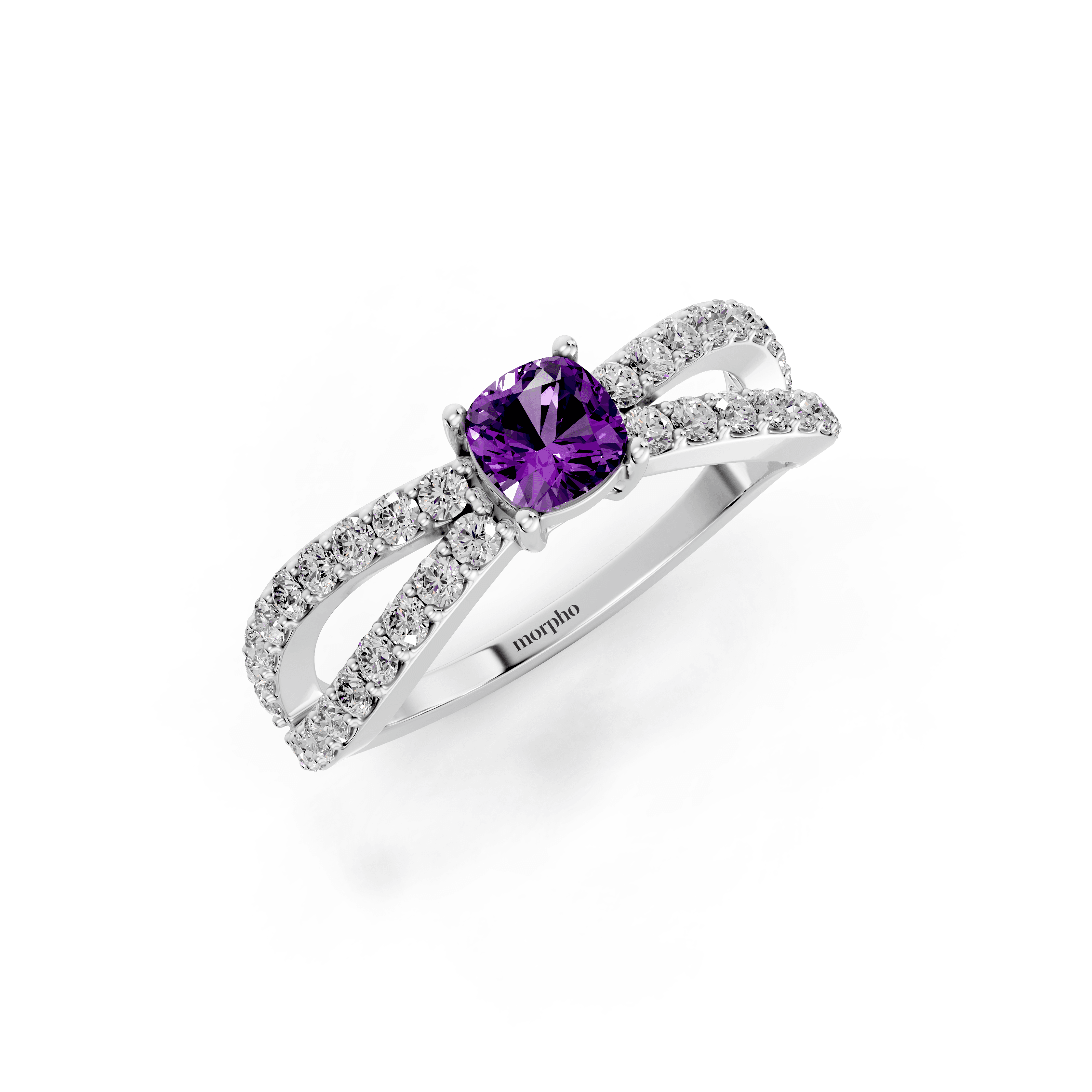 Compact cocktail ring featuring a diamond-set crossover band with a centrally mounted cushion-cut purple amethyst.