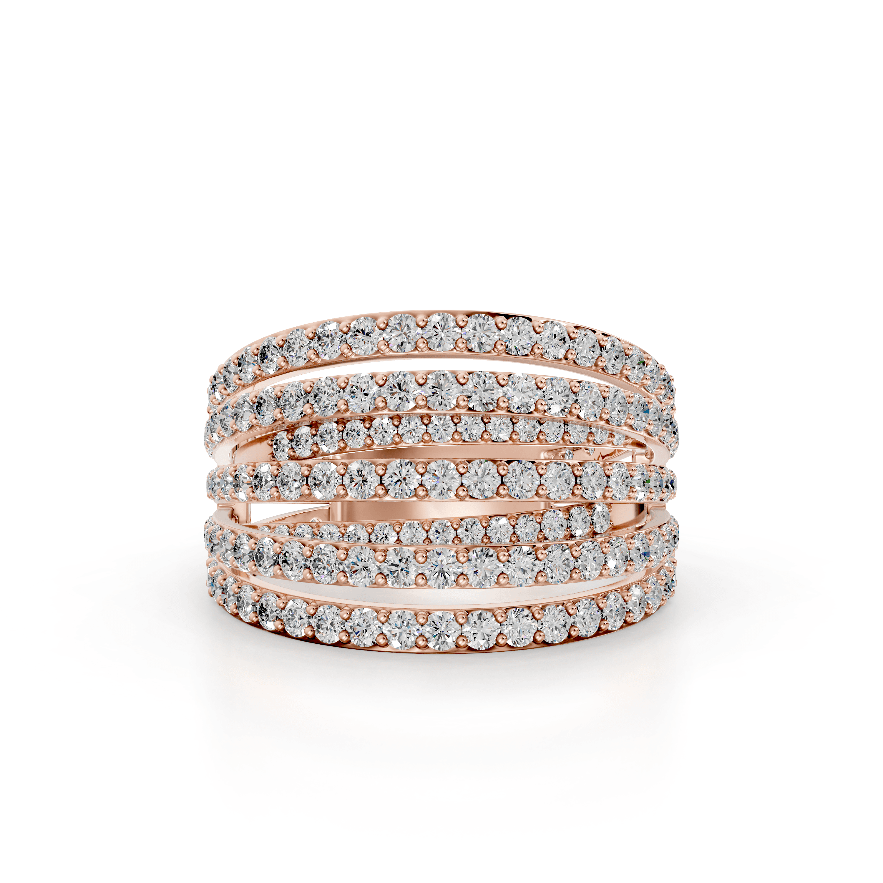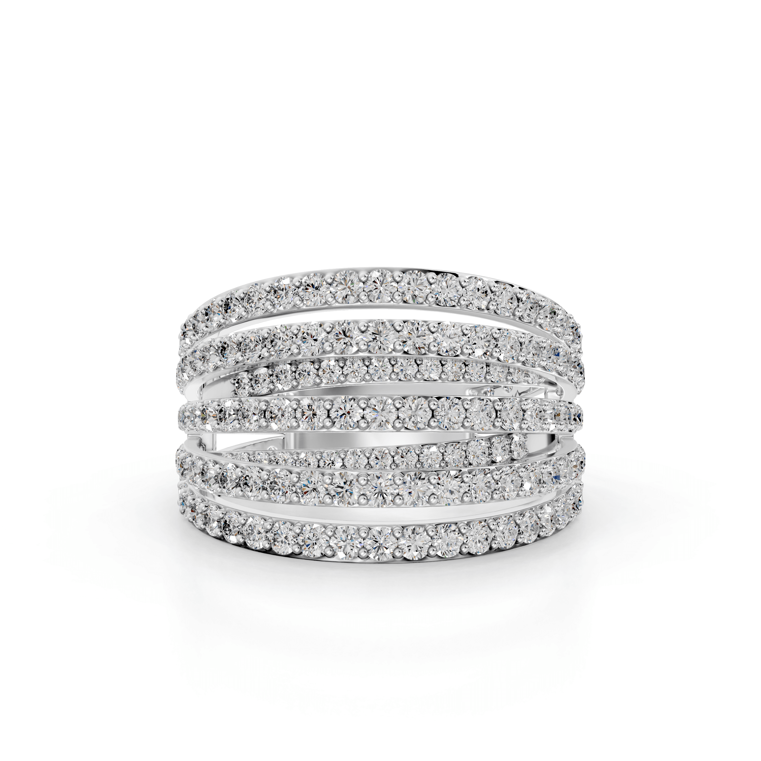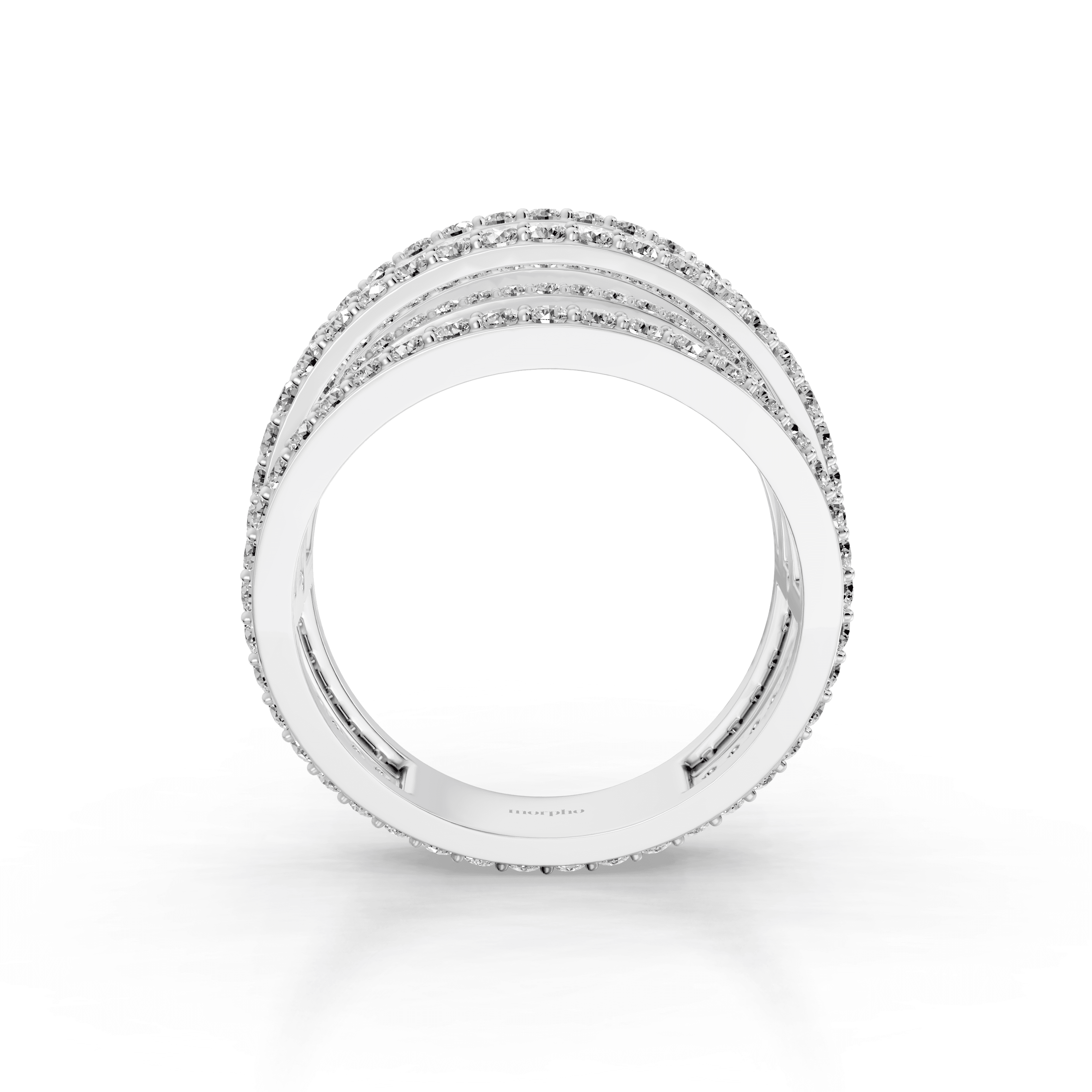 Bold multi-band cocktail ring with layered diamond-set crossover elements forming a structured, sculptural profile.