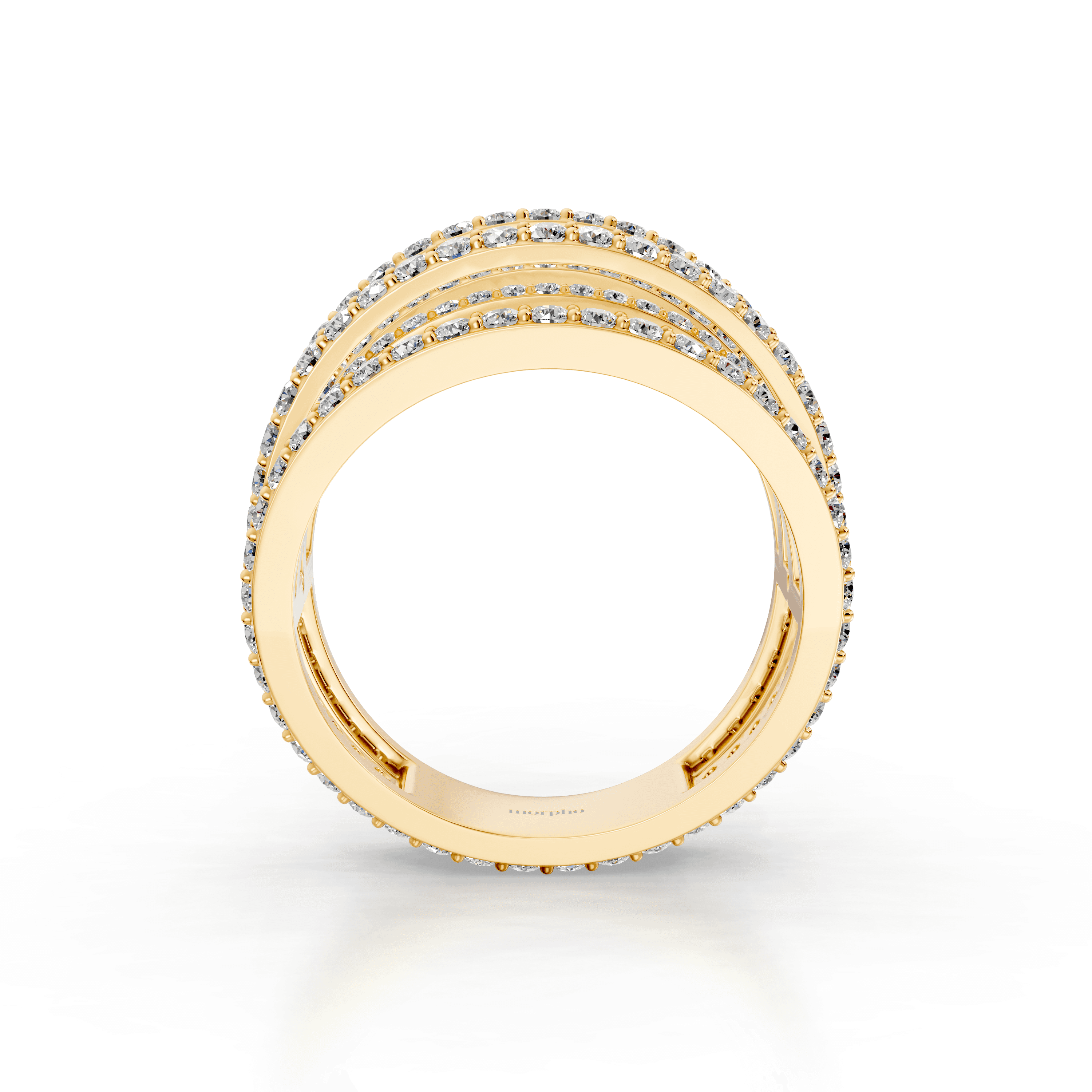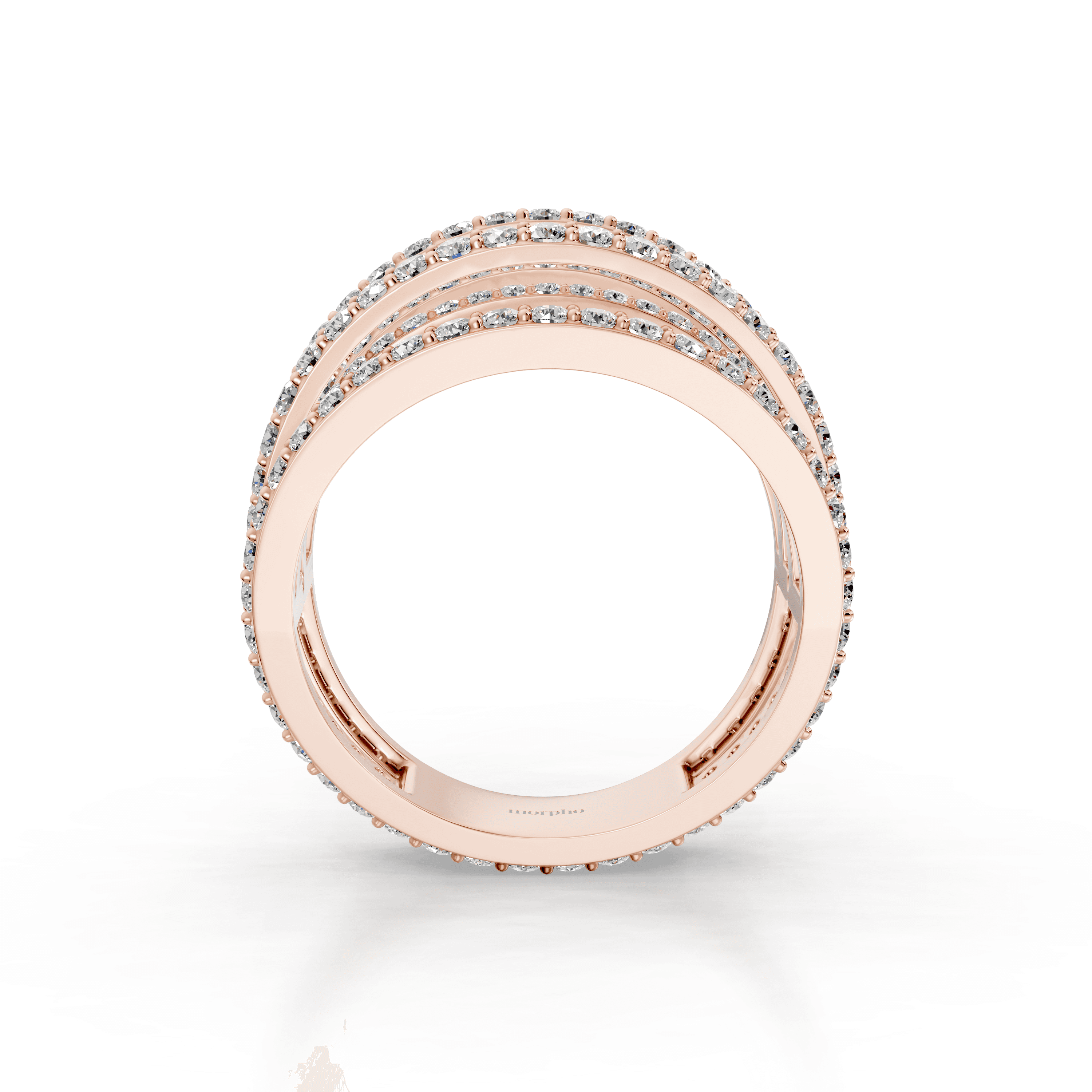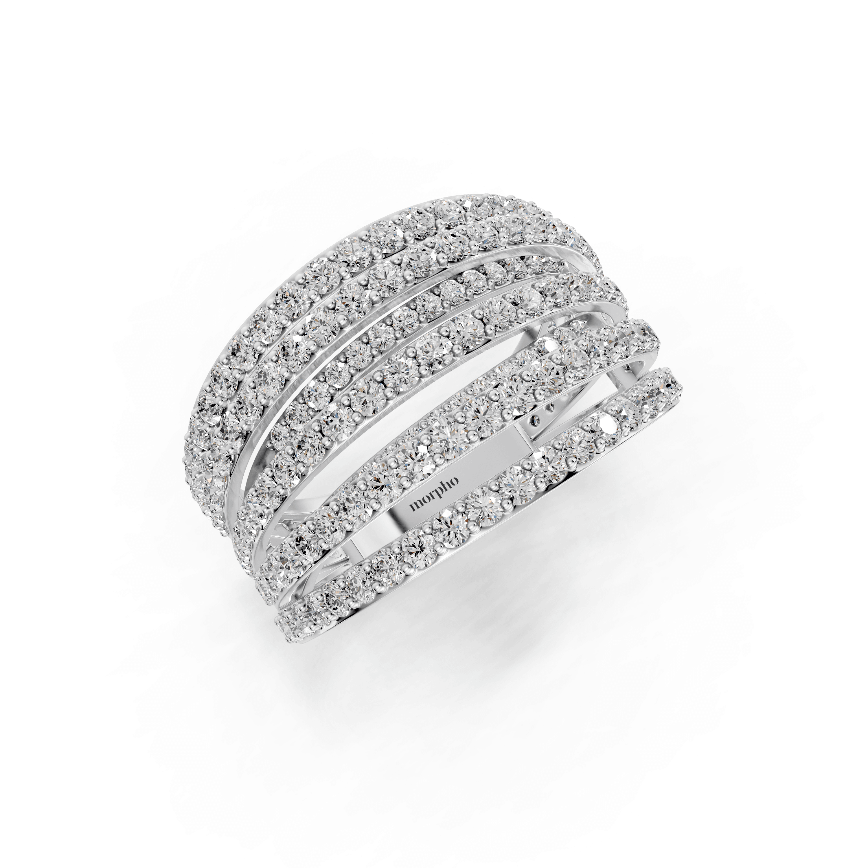 Bold multi-band cocktail ring with layered diamond-set crossover elements forming a structured, sculptural profile.