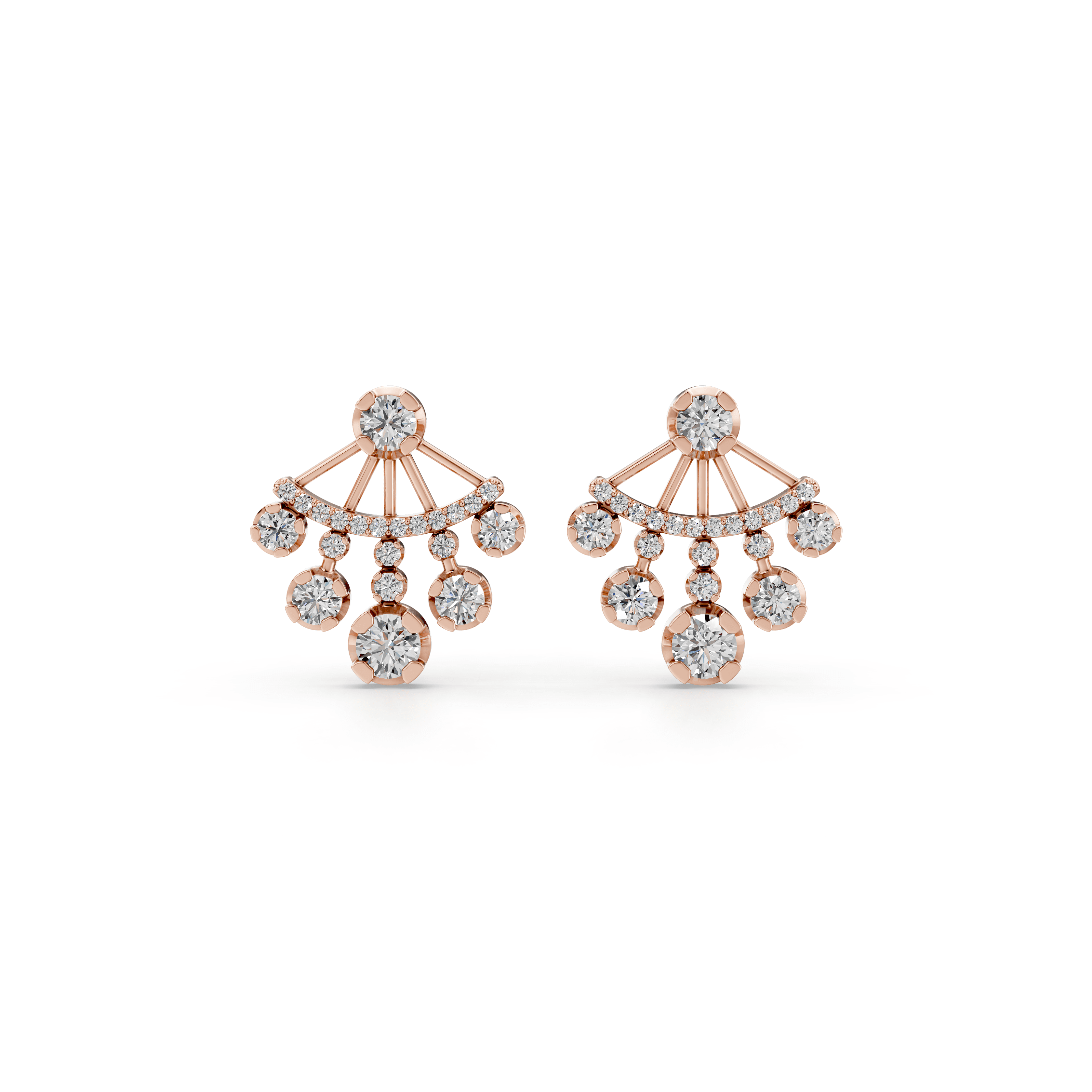 Fan-shaped stud earrings with graduated prong-set round diamonds arranged in a radiating formation. The fan-shaped wing is detachable from the solitaire stud, increasing versatility.
