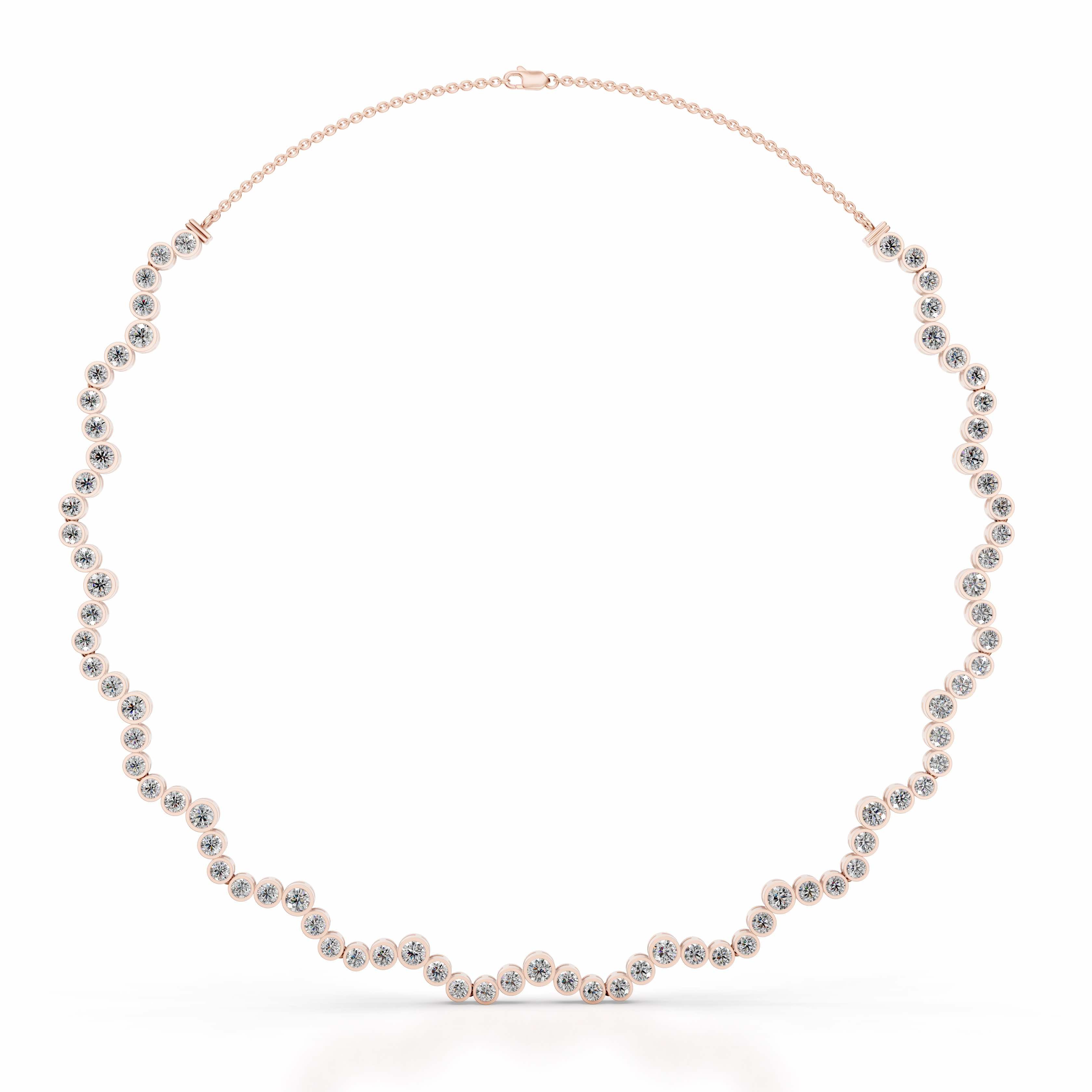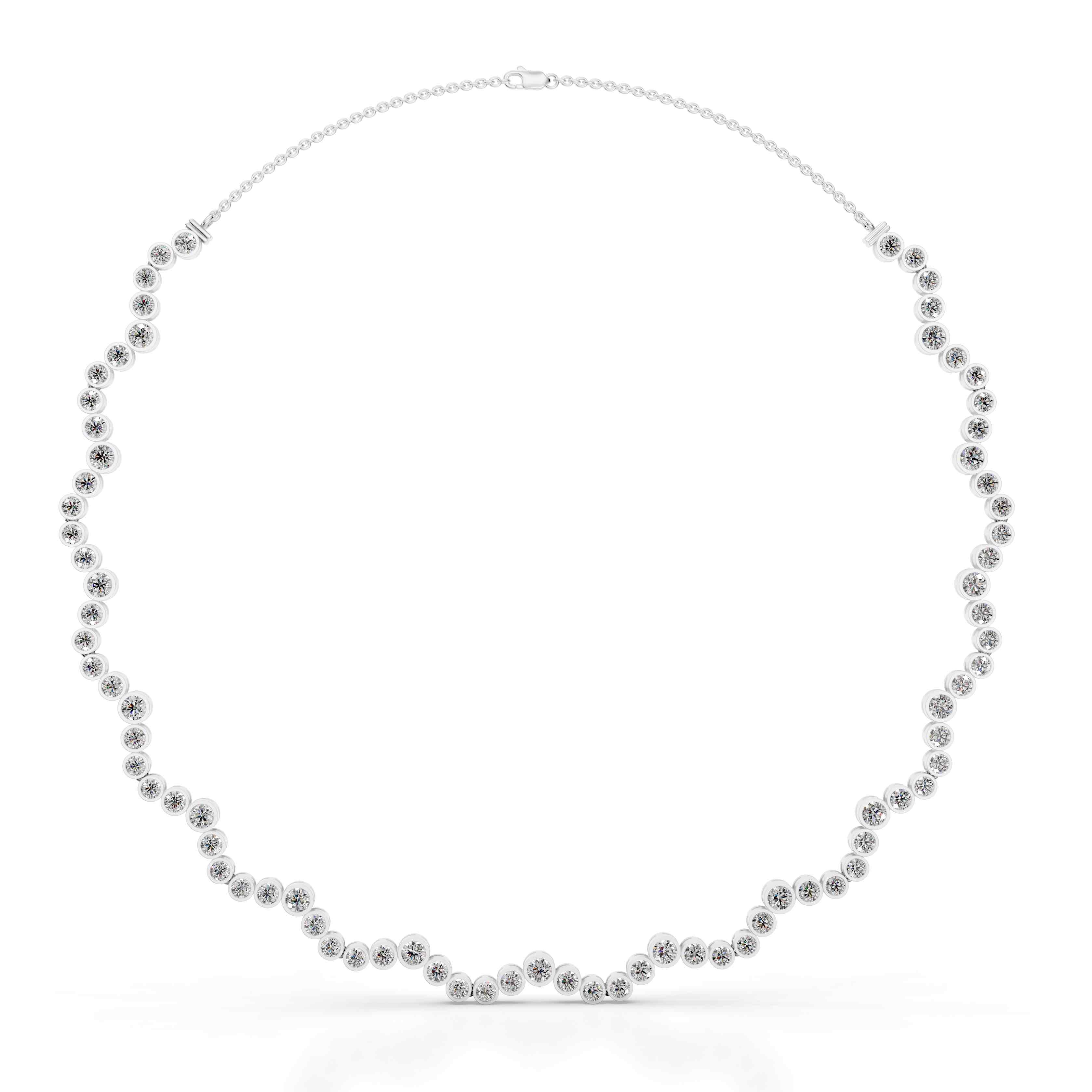 Full-length diamond necklace with bezel-set rounds arranged in wave-form graduated sequence.