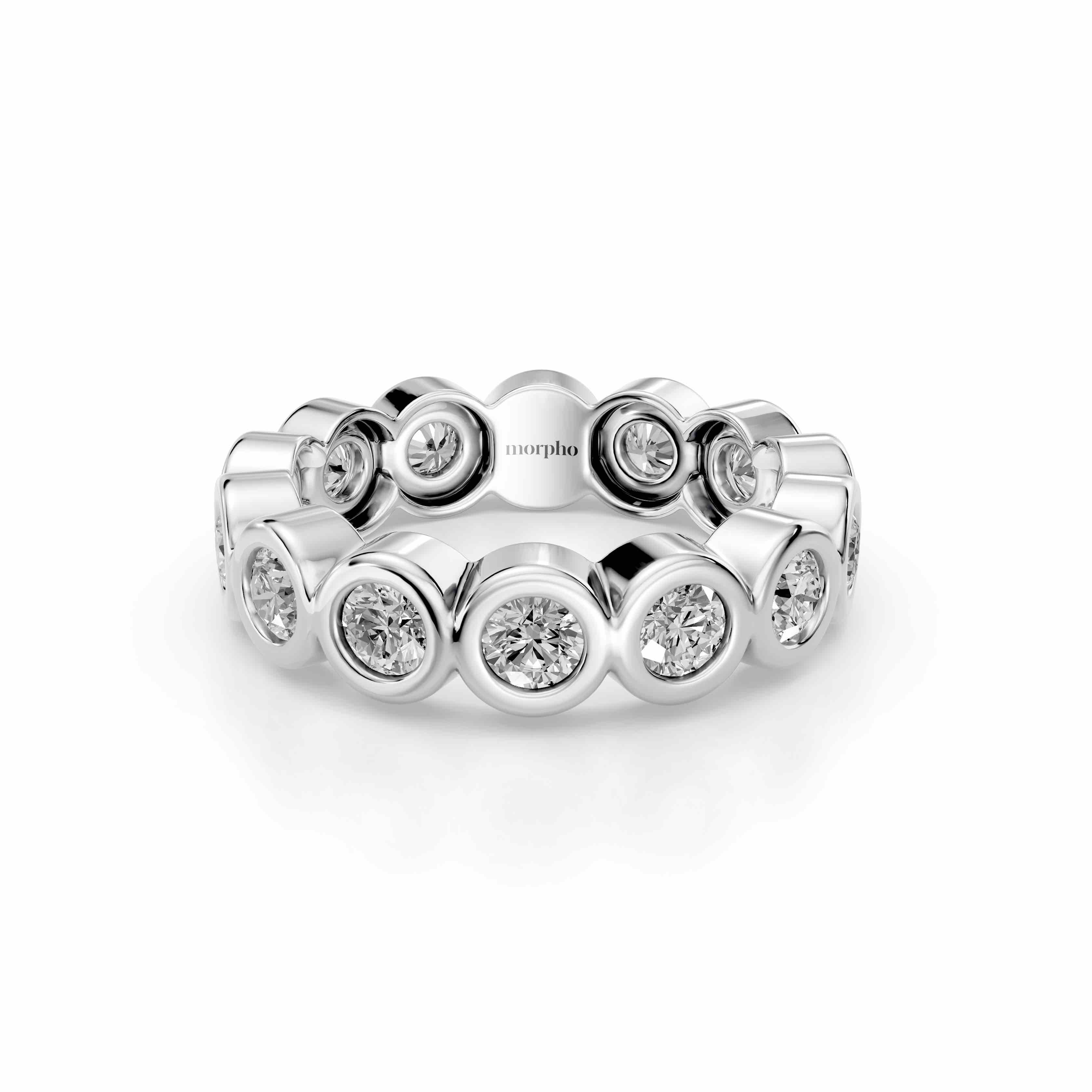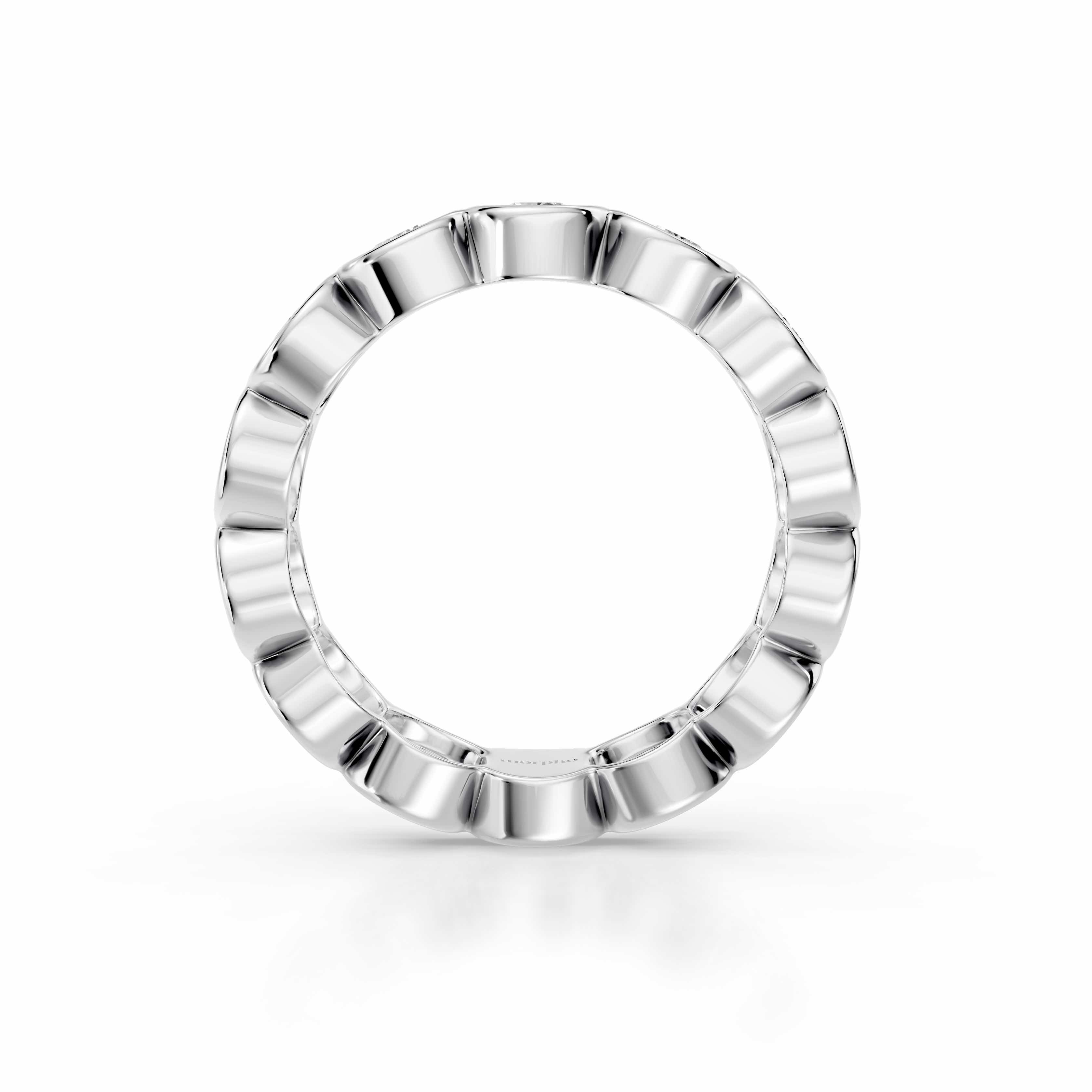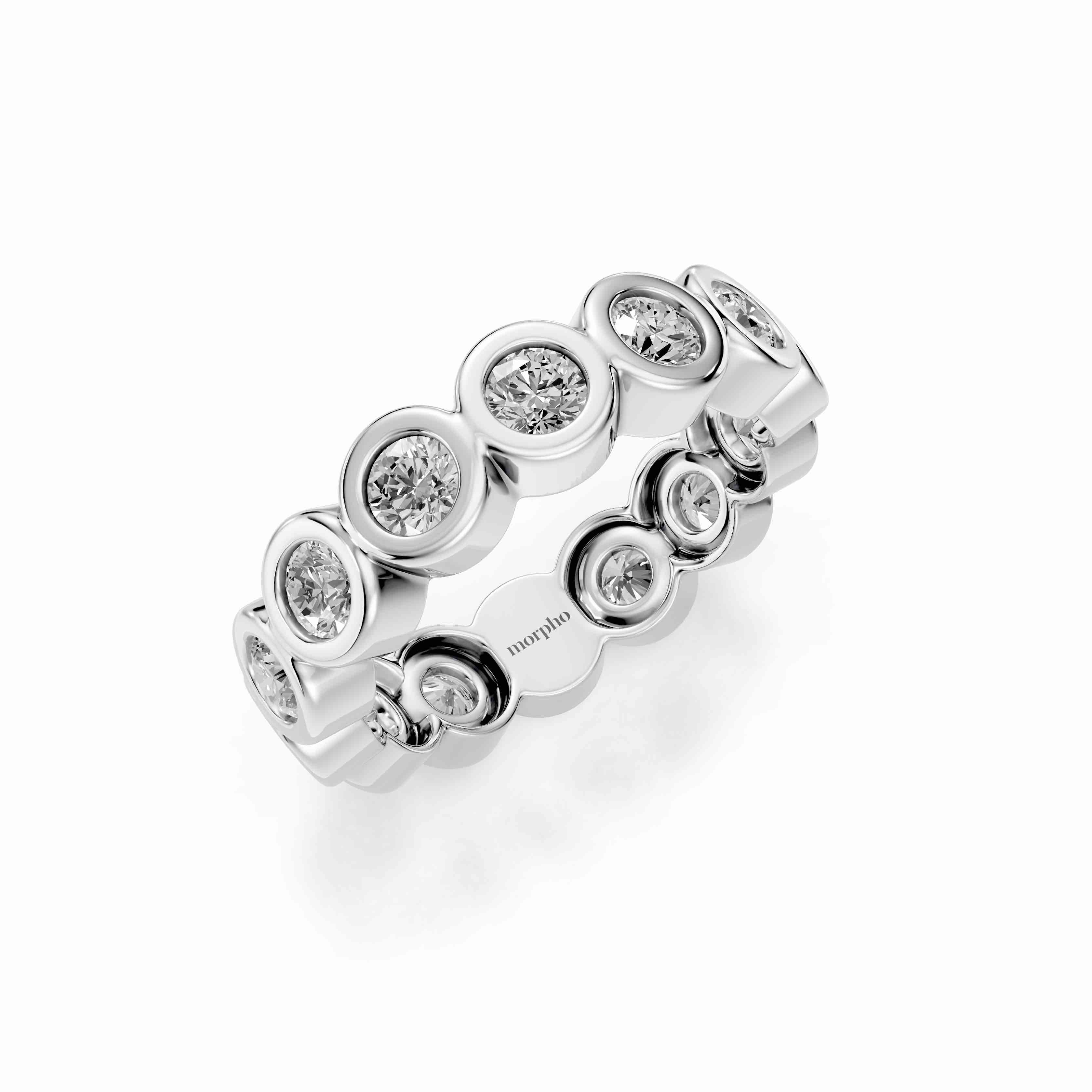 Full bezel-set eternity band with uniform round diamonds.