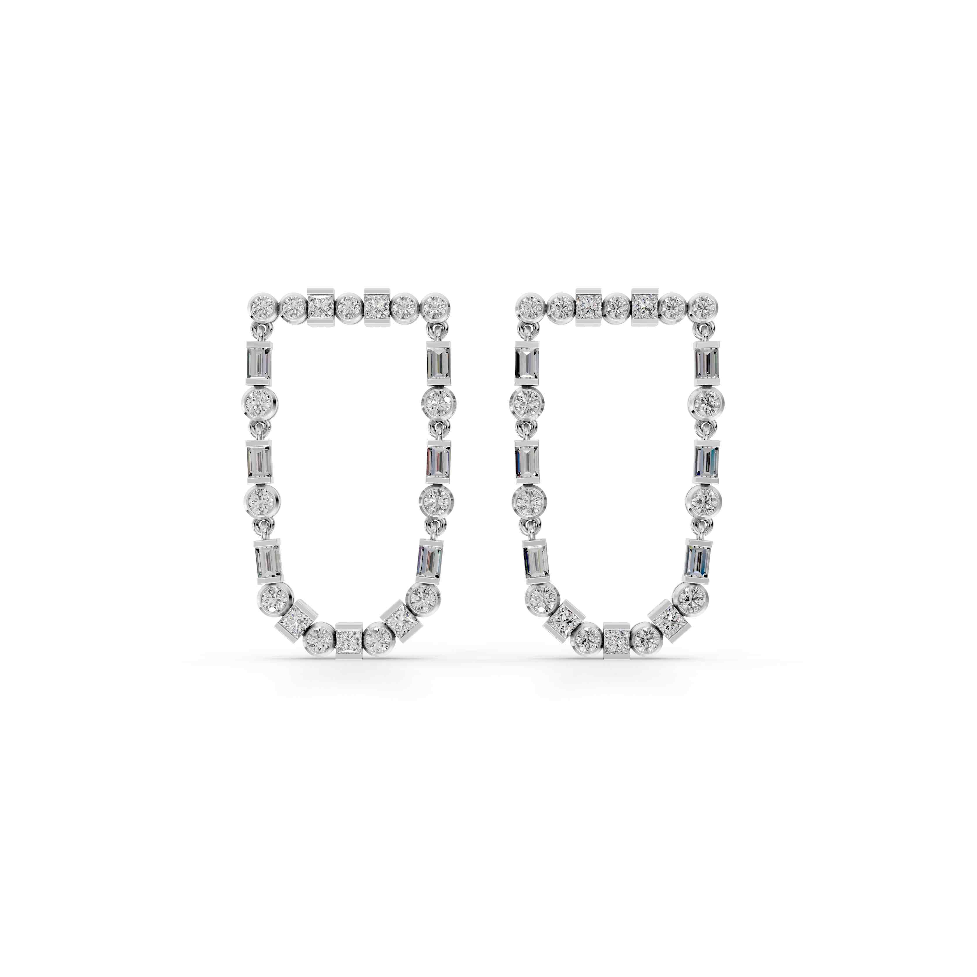 Triple-line drop earrings with bezel-set rounds and vertical baguettes with a diamond stud on top a gold bar.