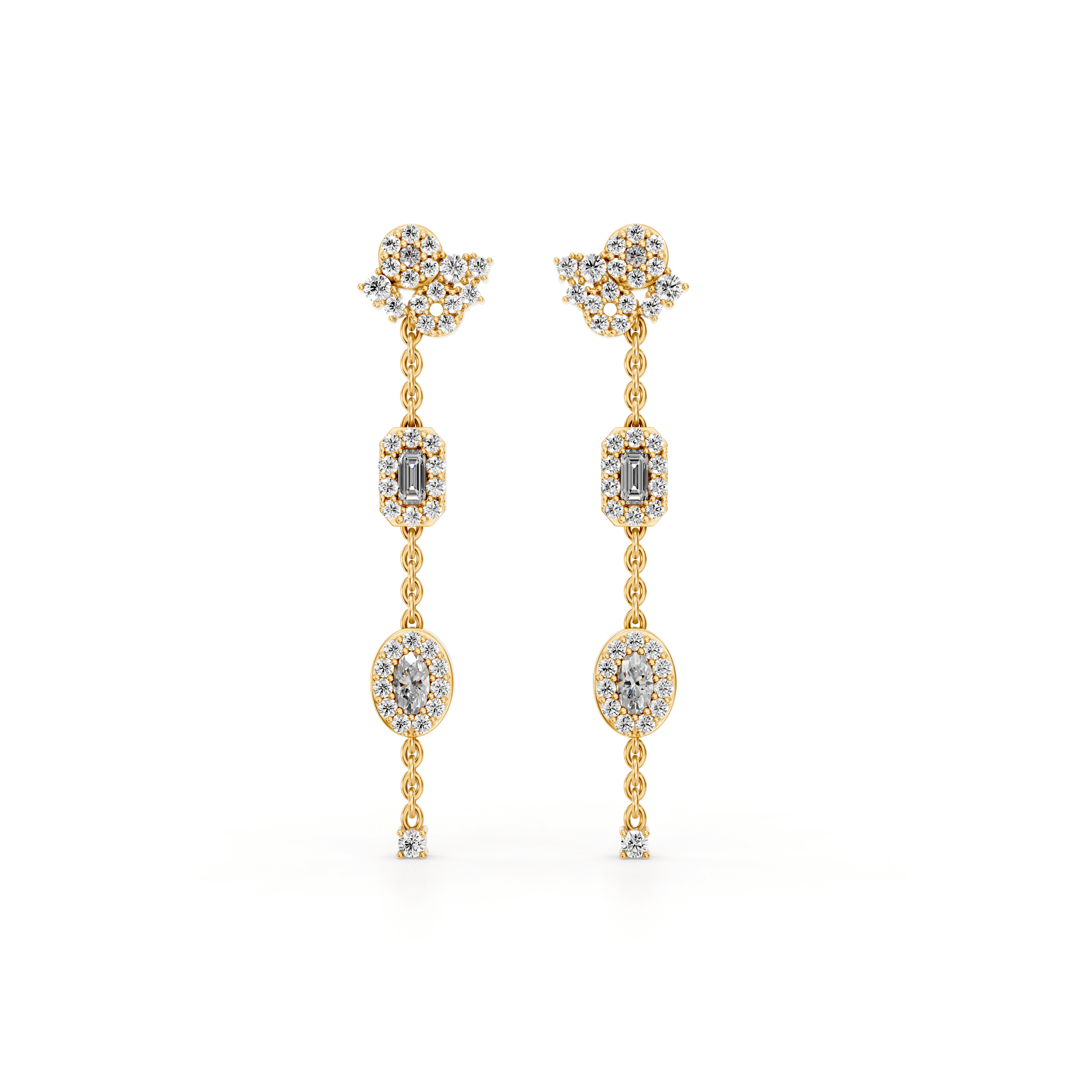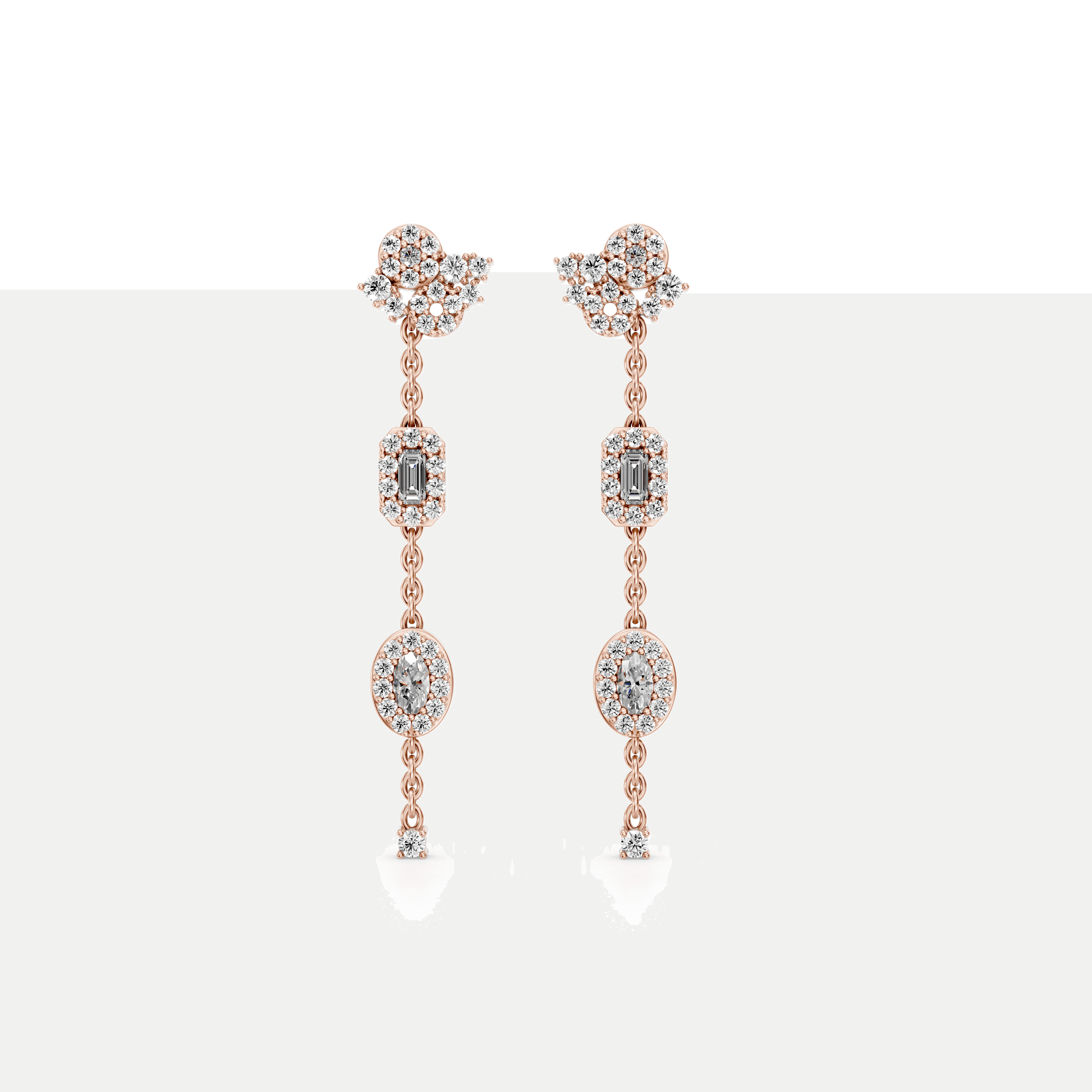 Linear drop earrings with graduated micro-pave in bezel-set round diamonds suspended on fine chain links.