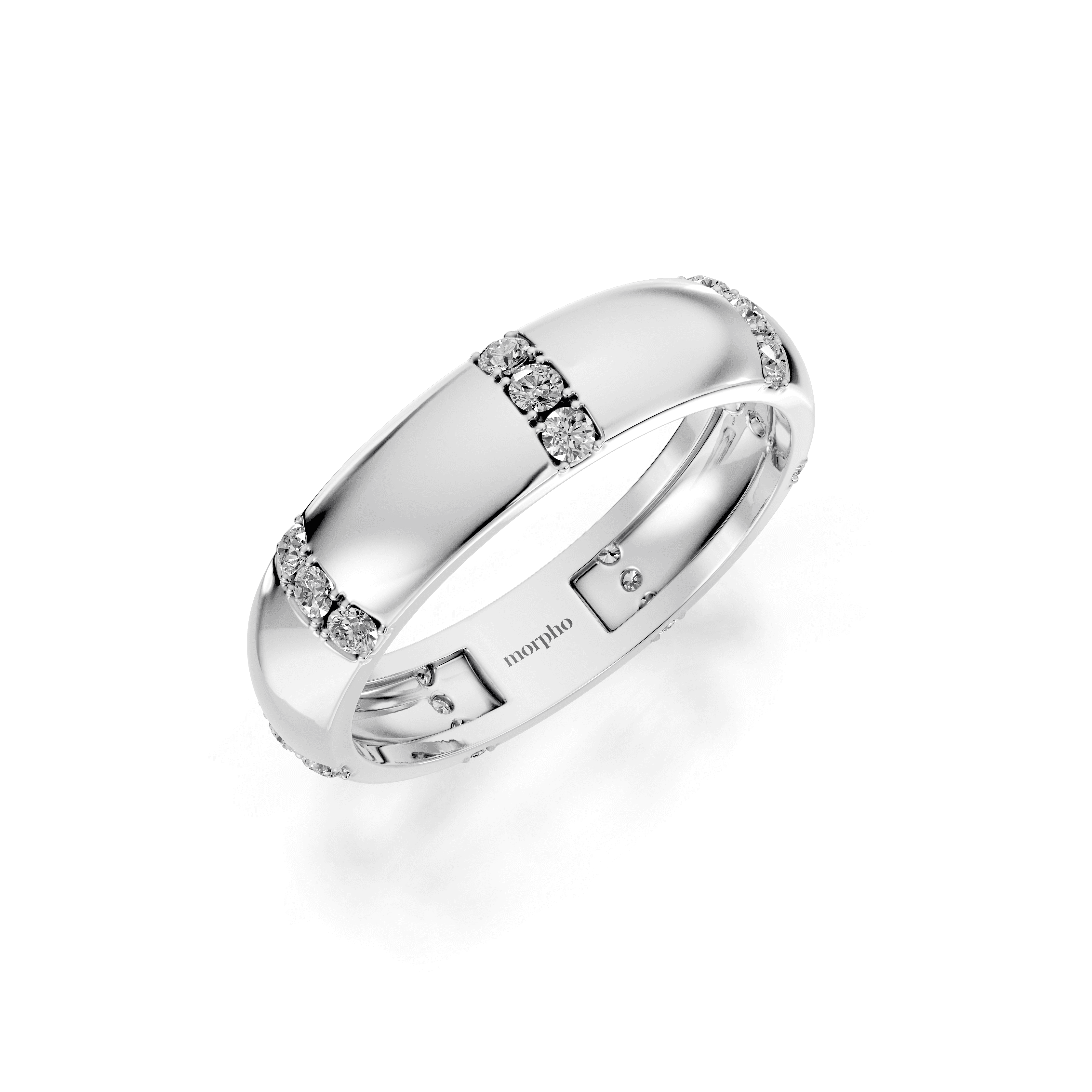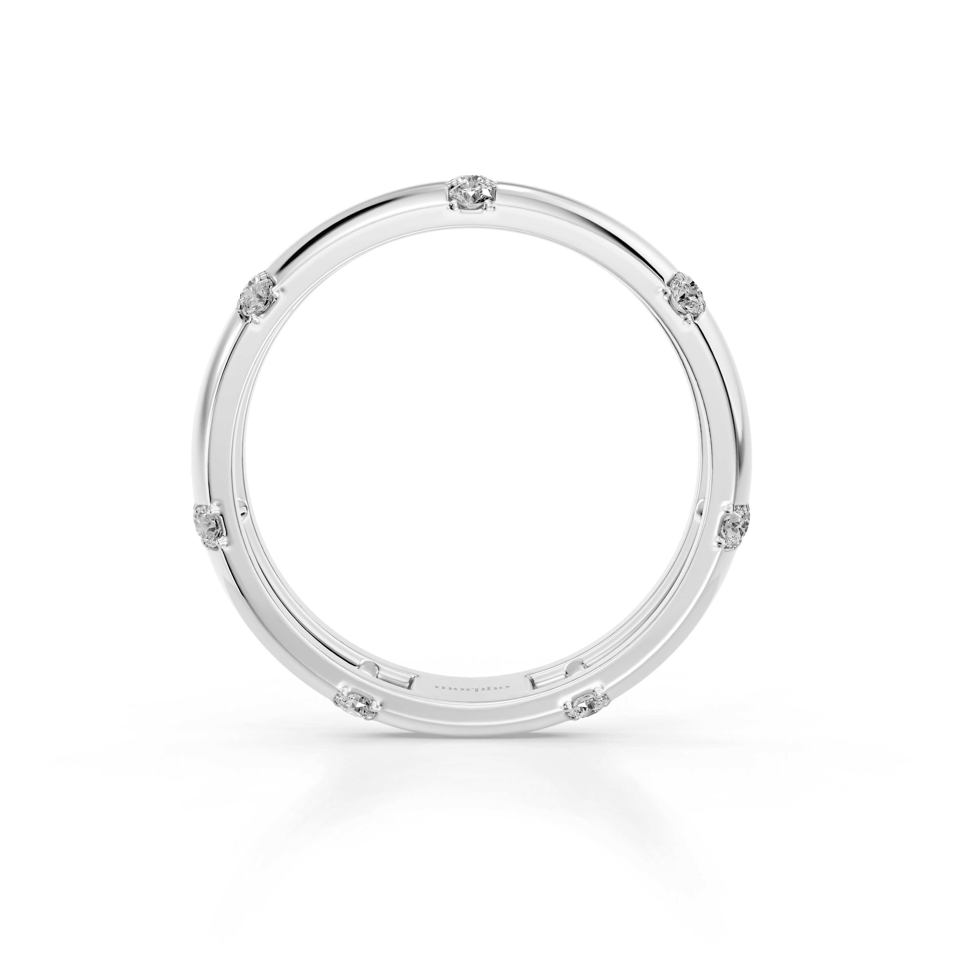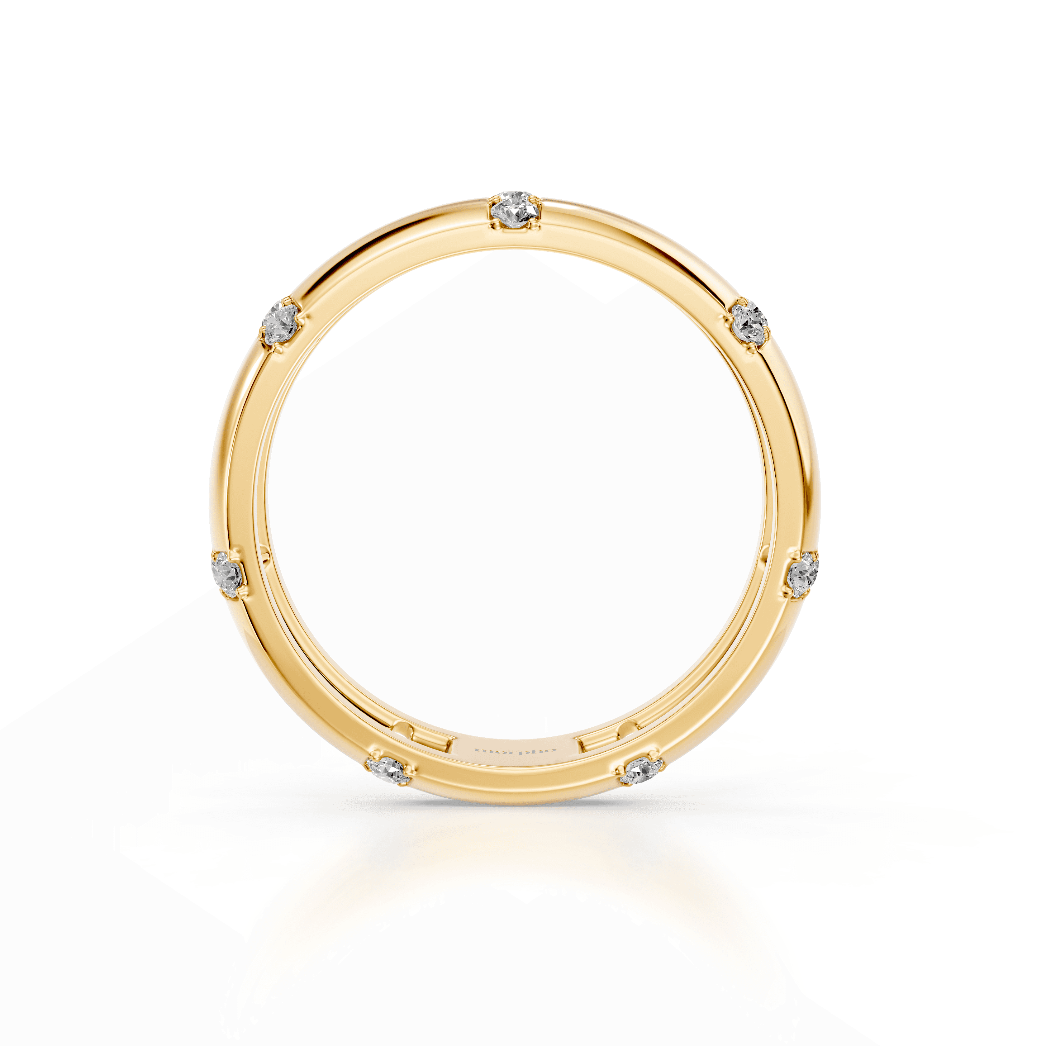 Slim band with evenly spaced prong-set round diamonds set between solid gold sections.