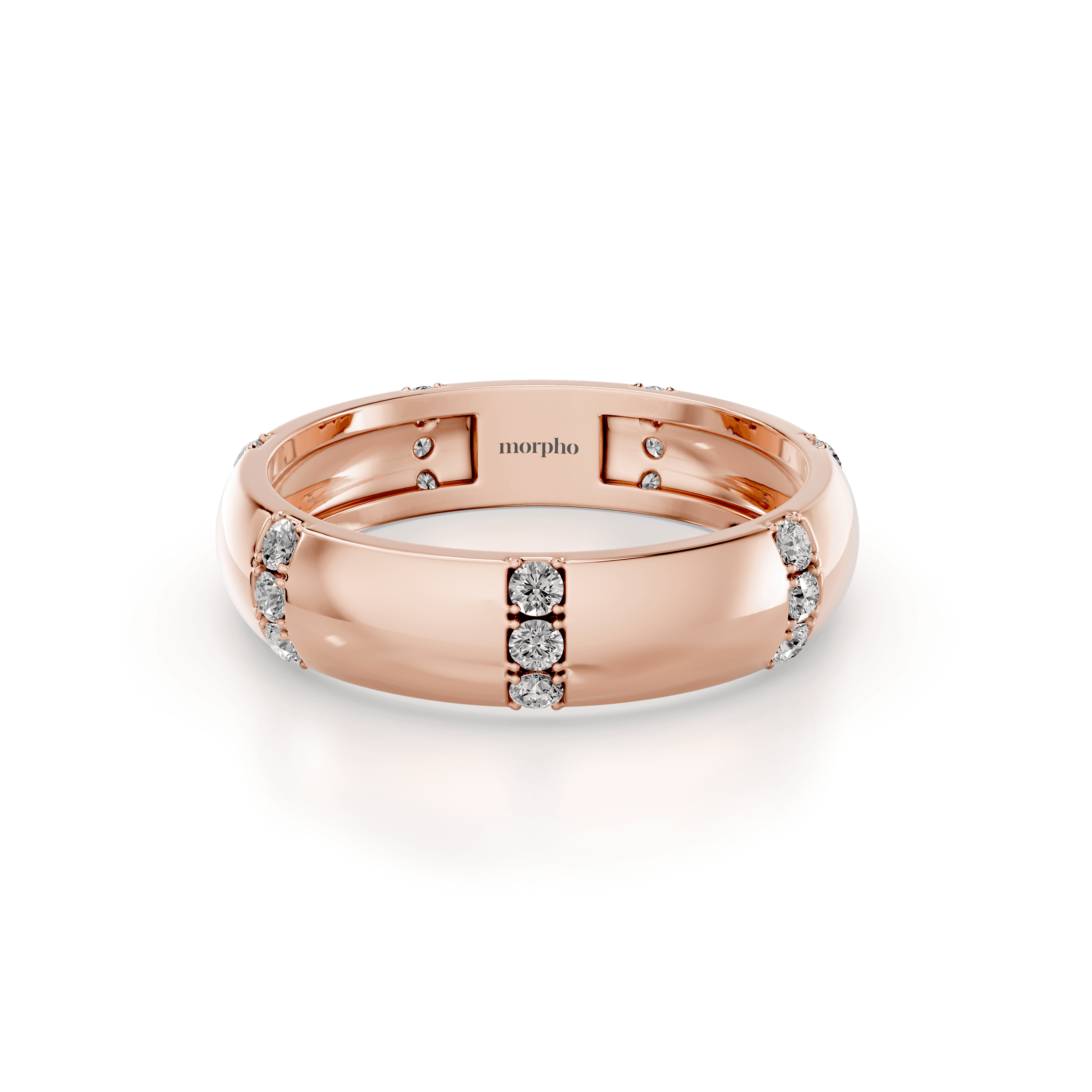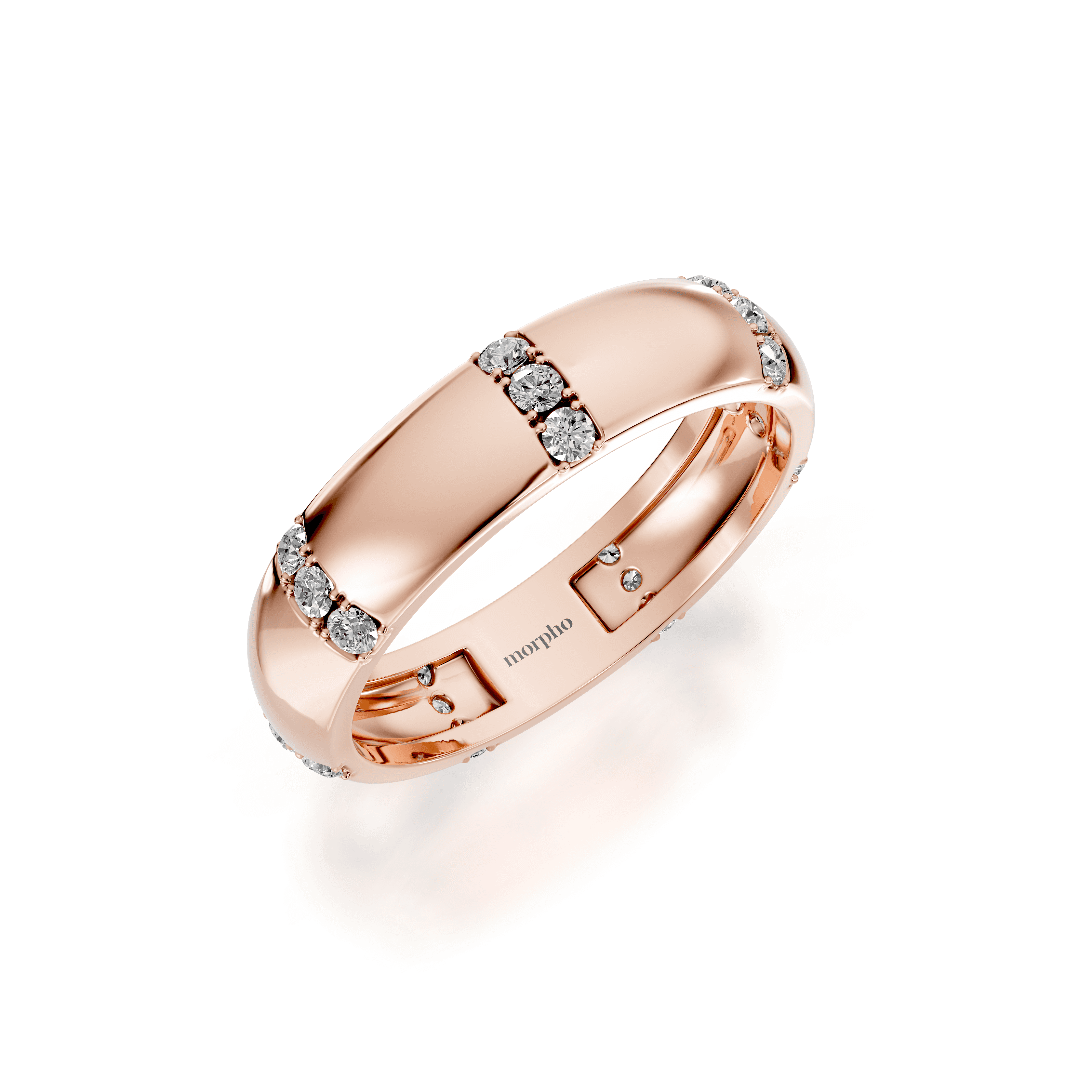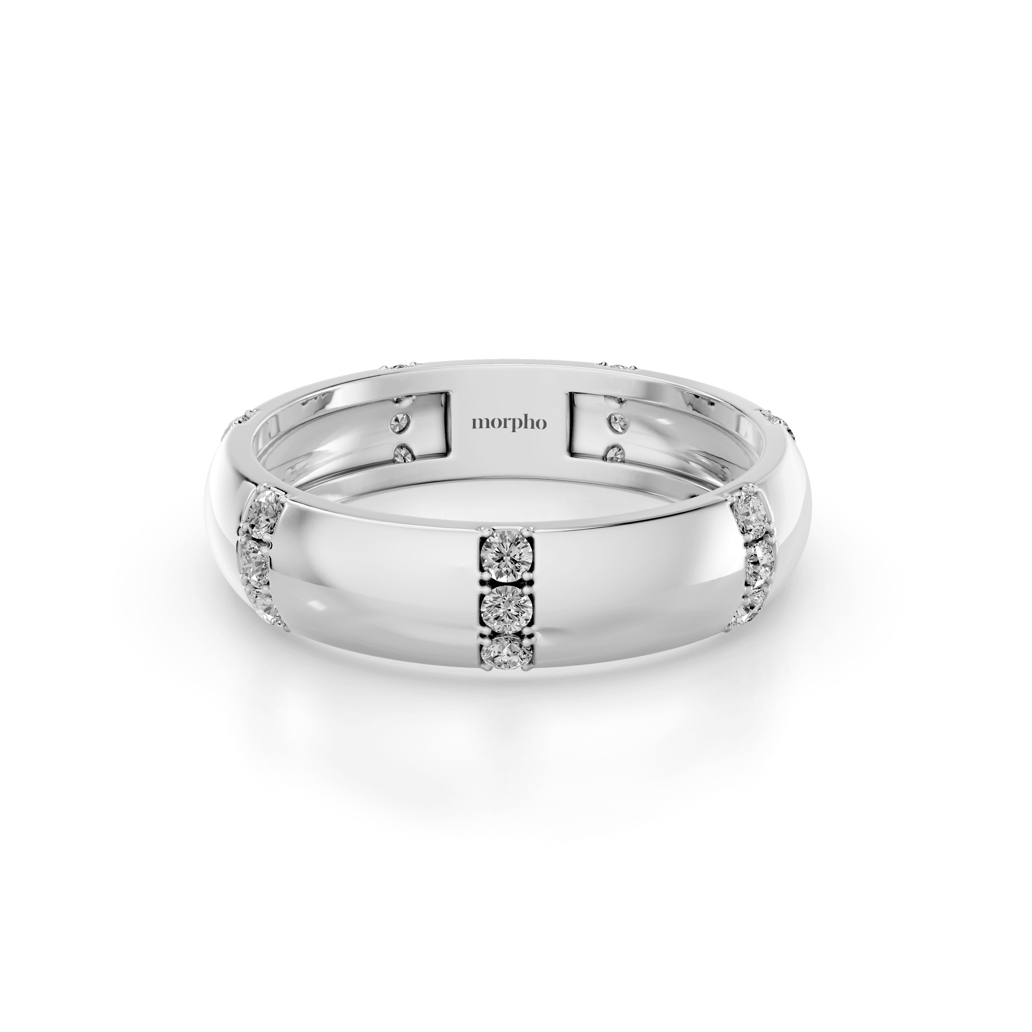 Slim band with evenly spaced prong-set round diamonds set between solid gold sections.