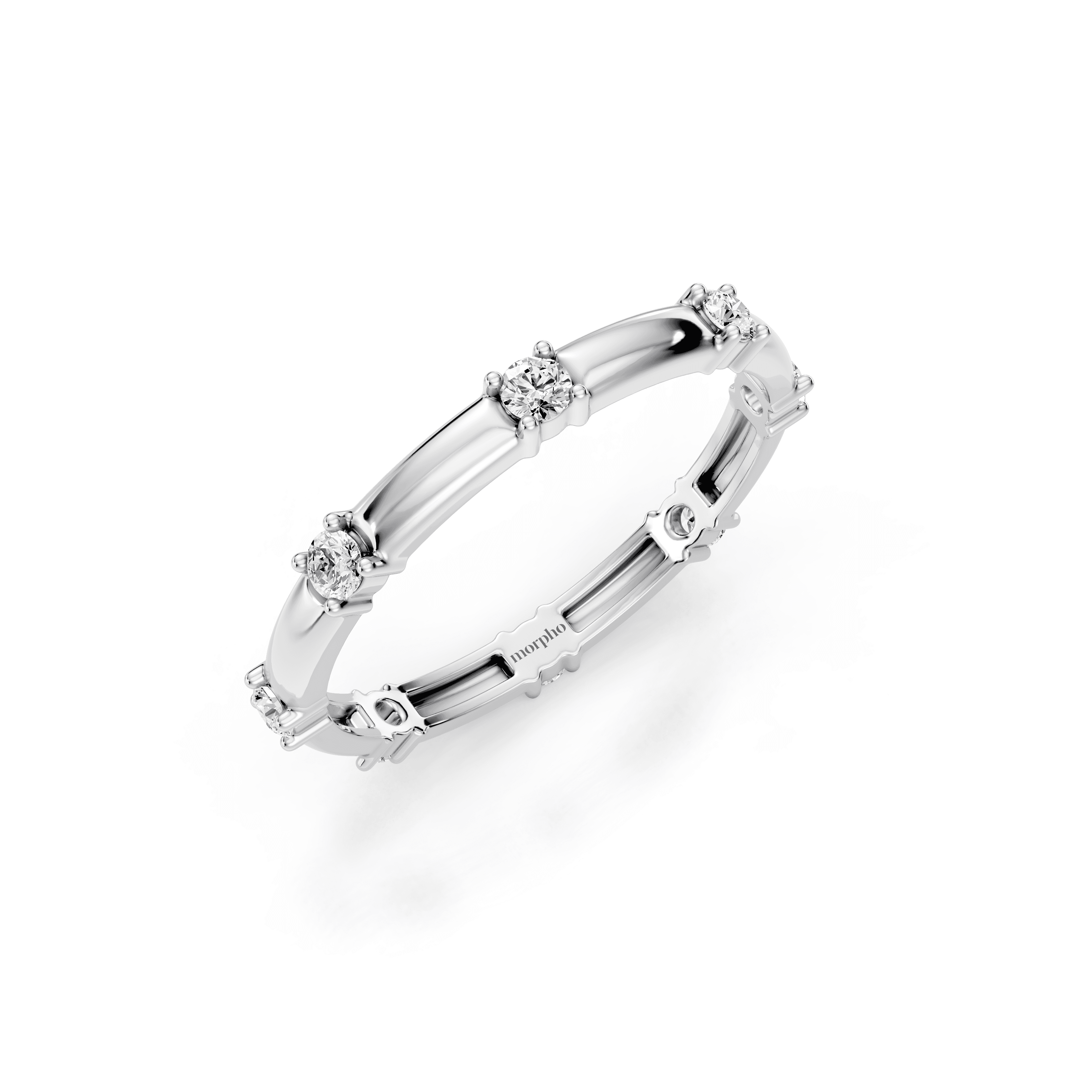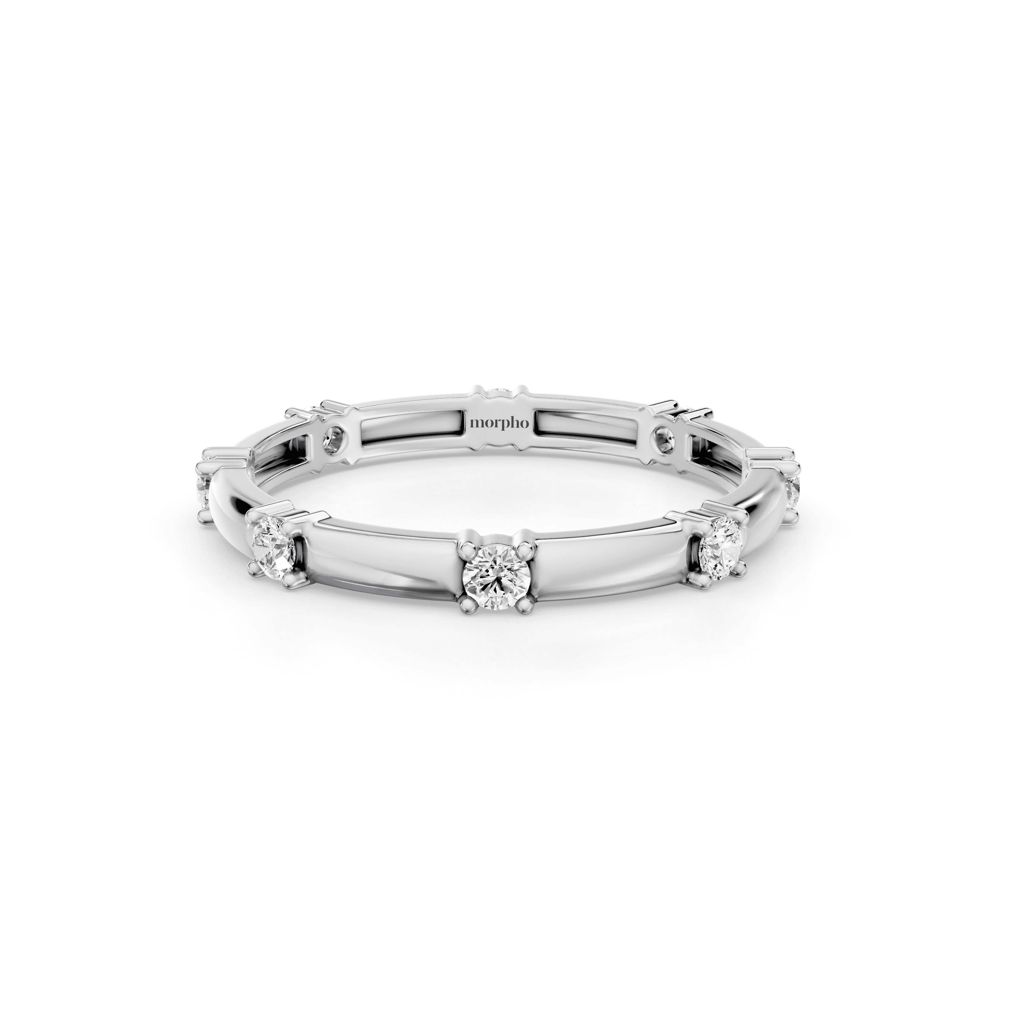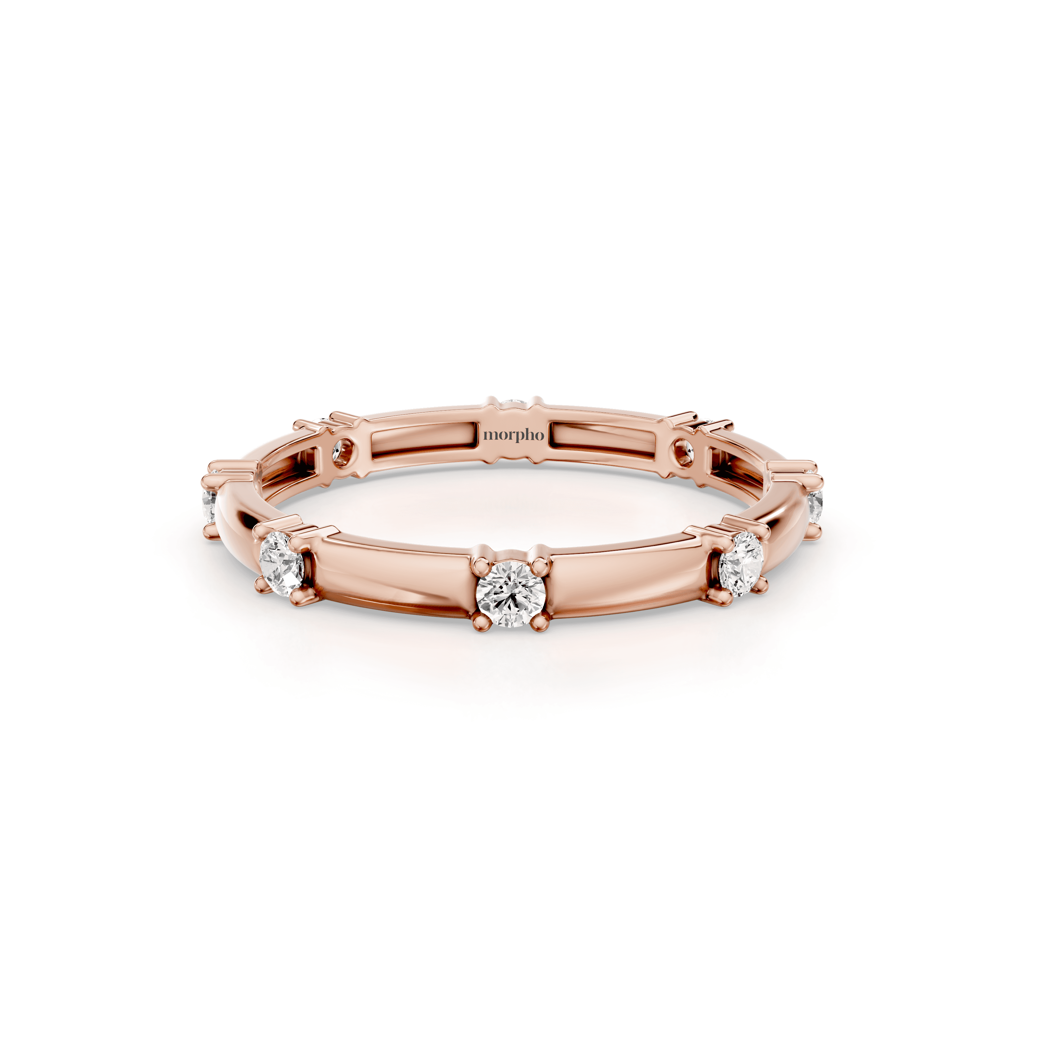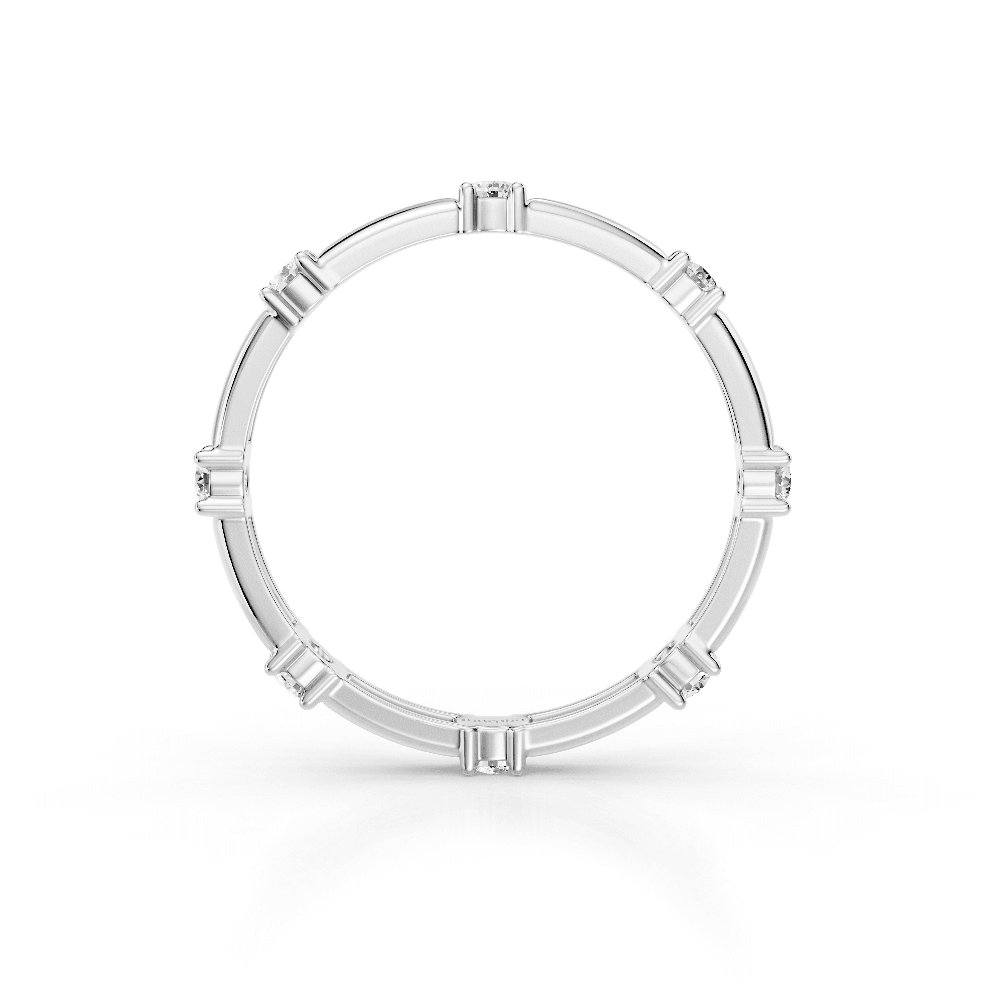 Minimal ring featuring isolated prong-set round diamonds on a narrow polished band.