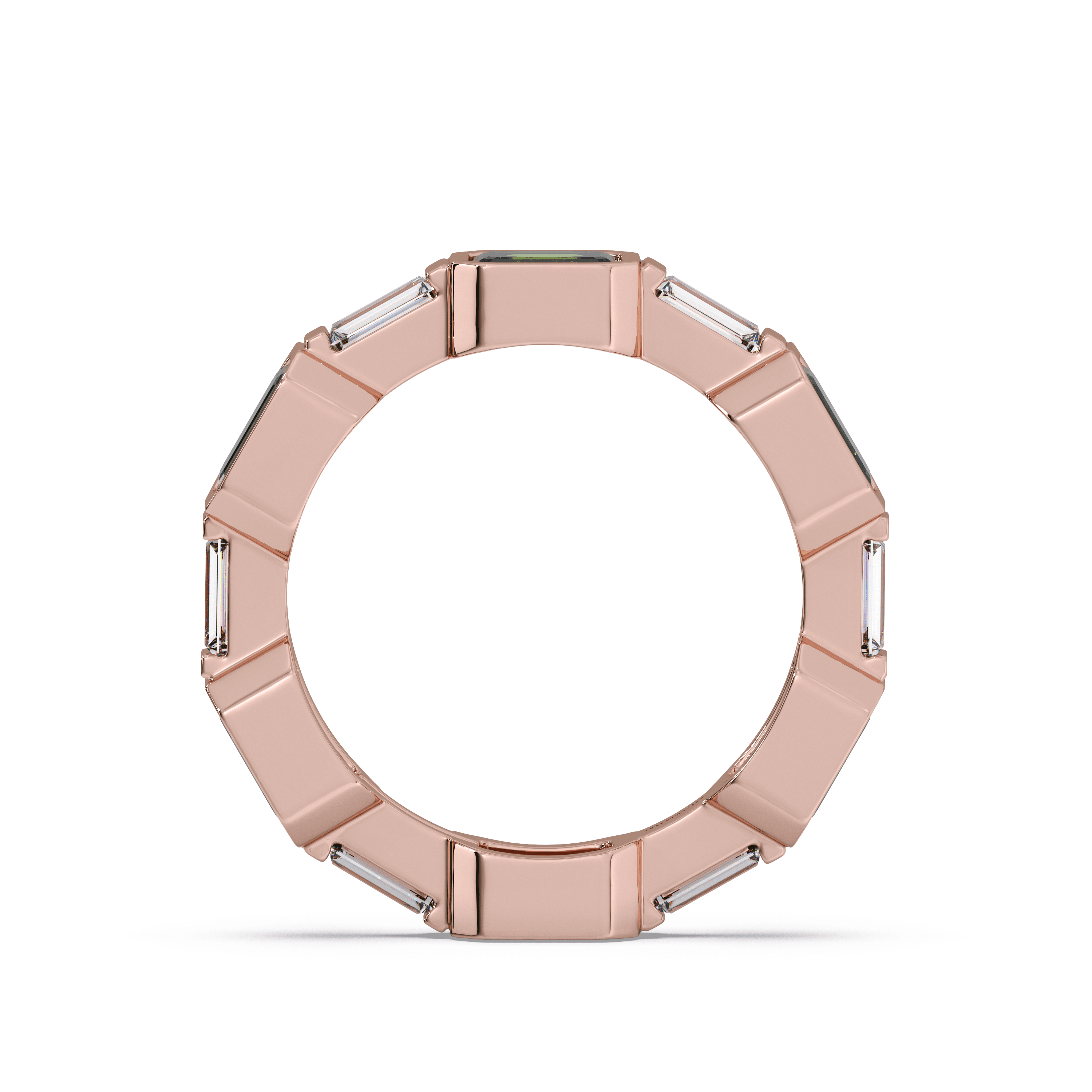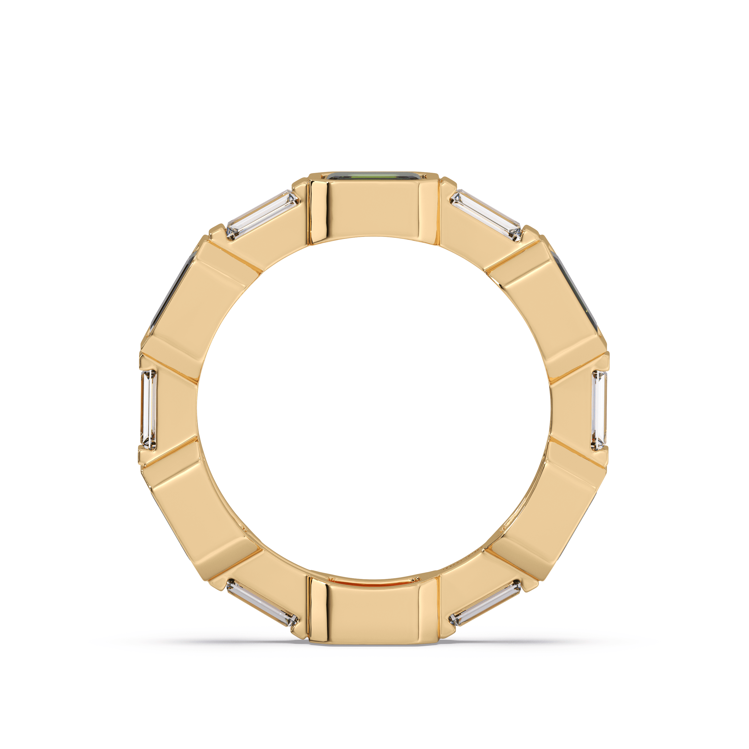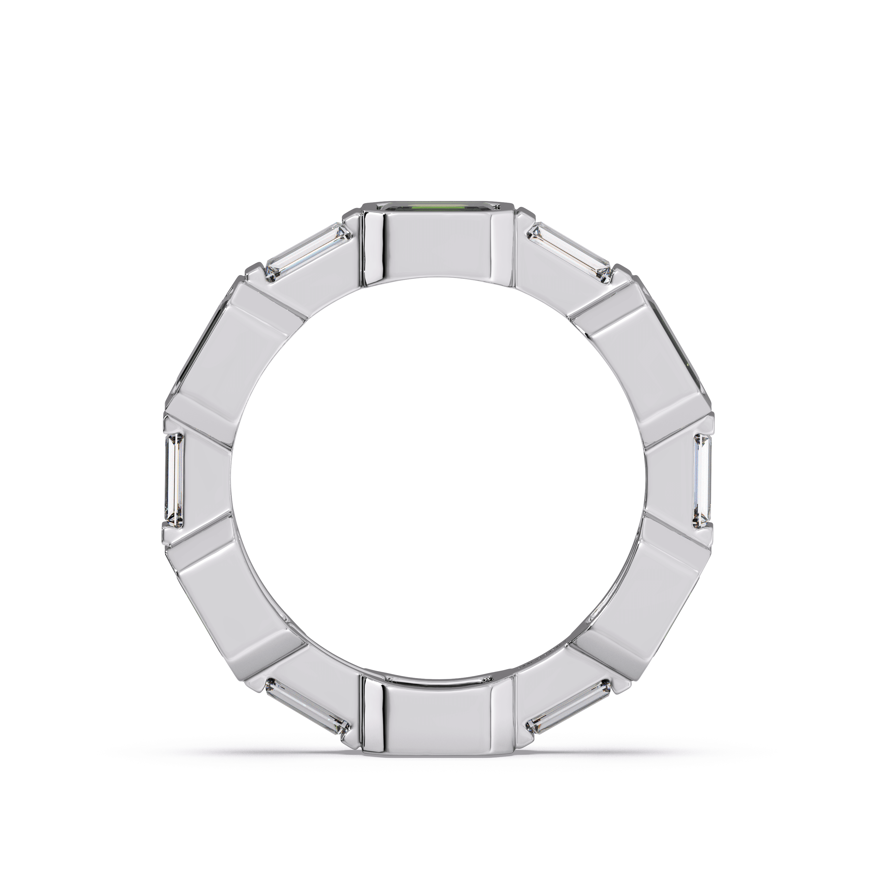 Slim stackable band featuring channel-set baguette-cut emeralds in a continuous linear layout.