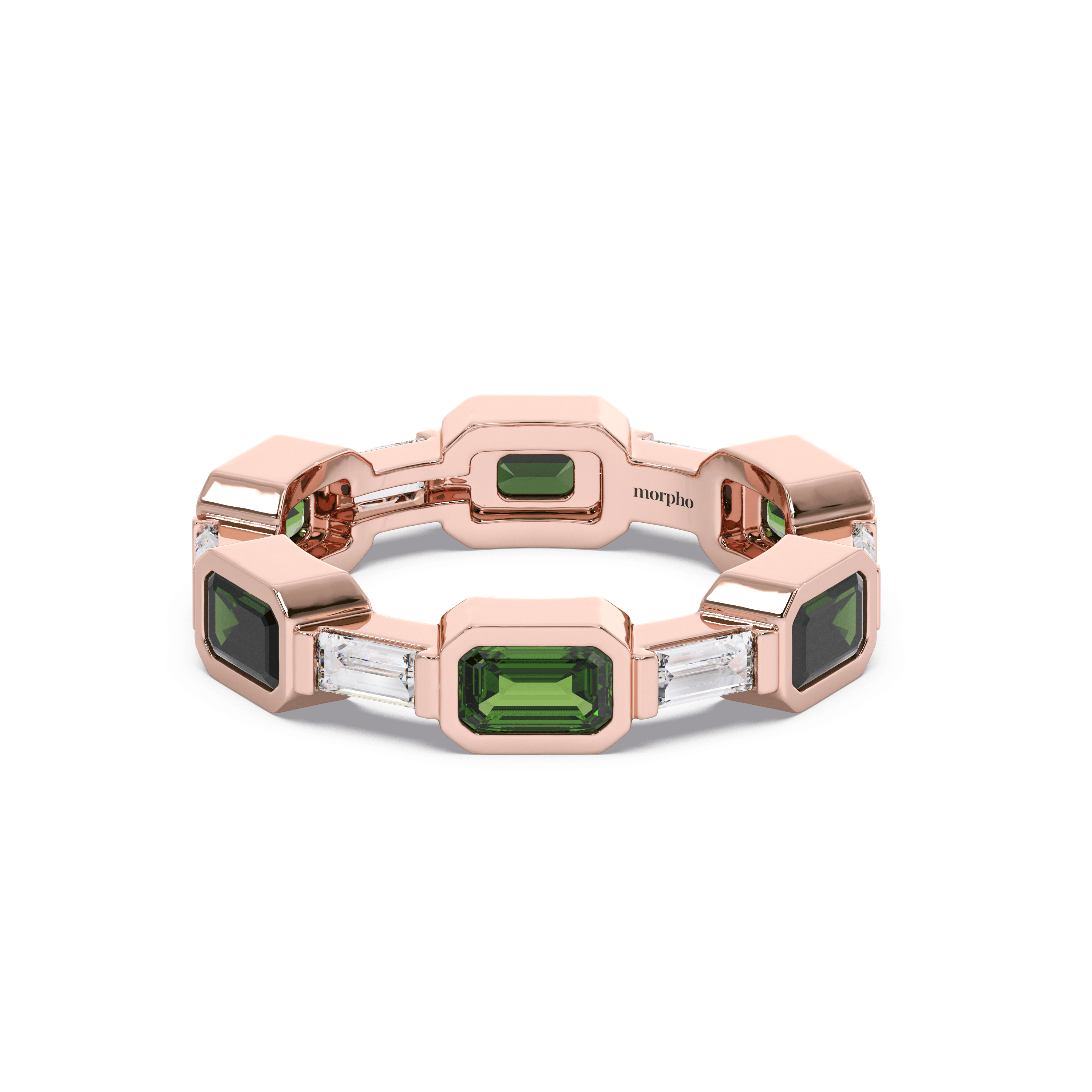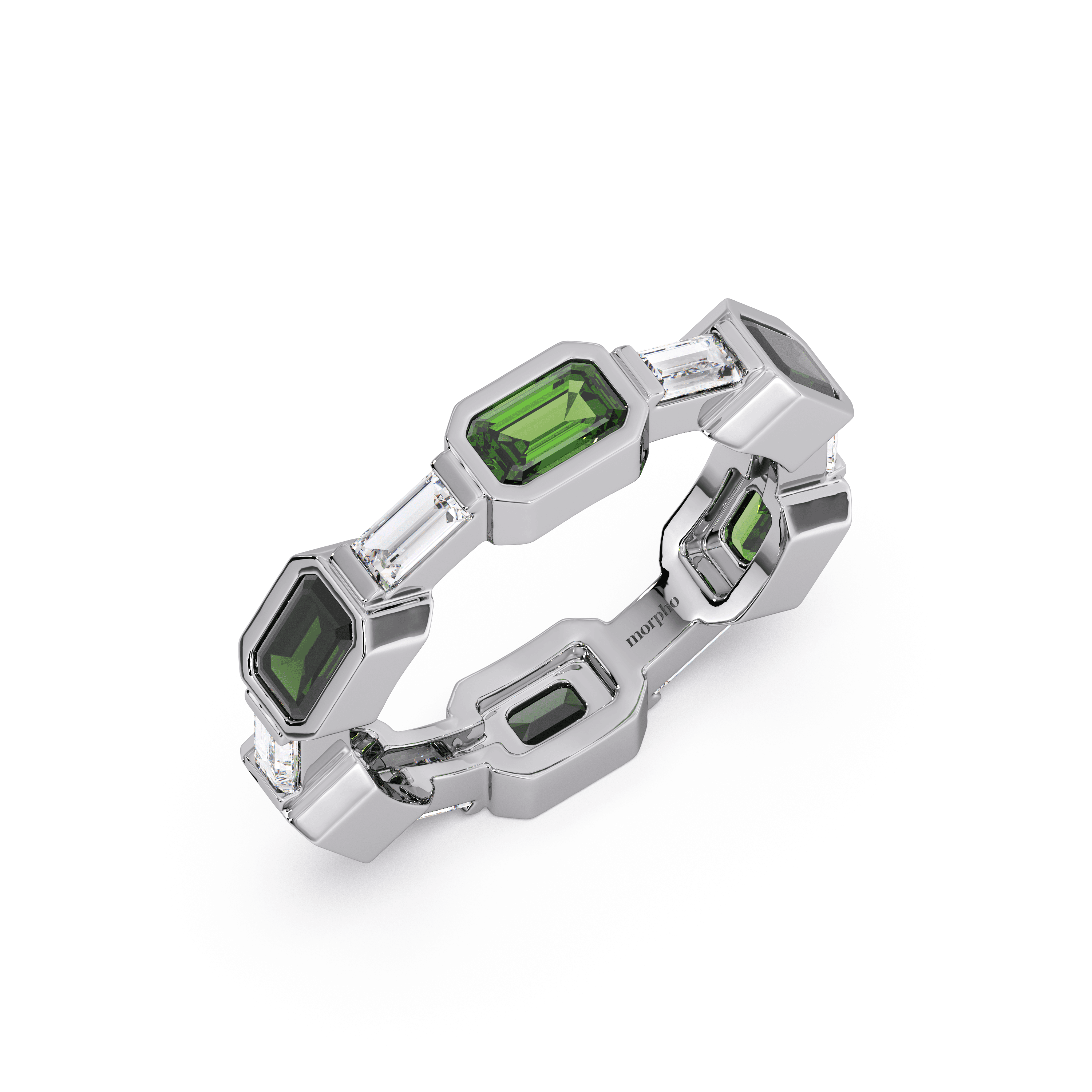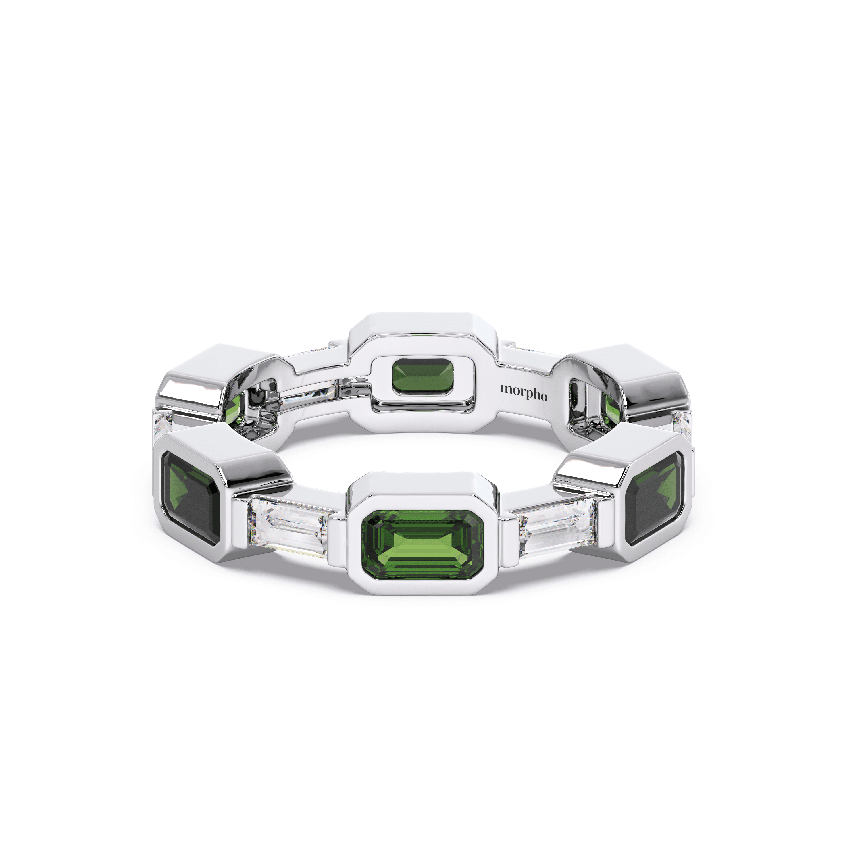 Slim stackable band featuring channel-set baguette-cut emeralds in a continuous linear layout.
