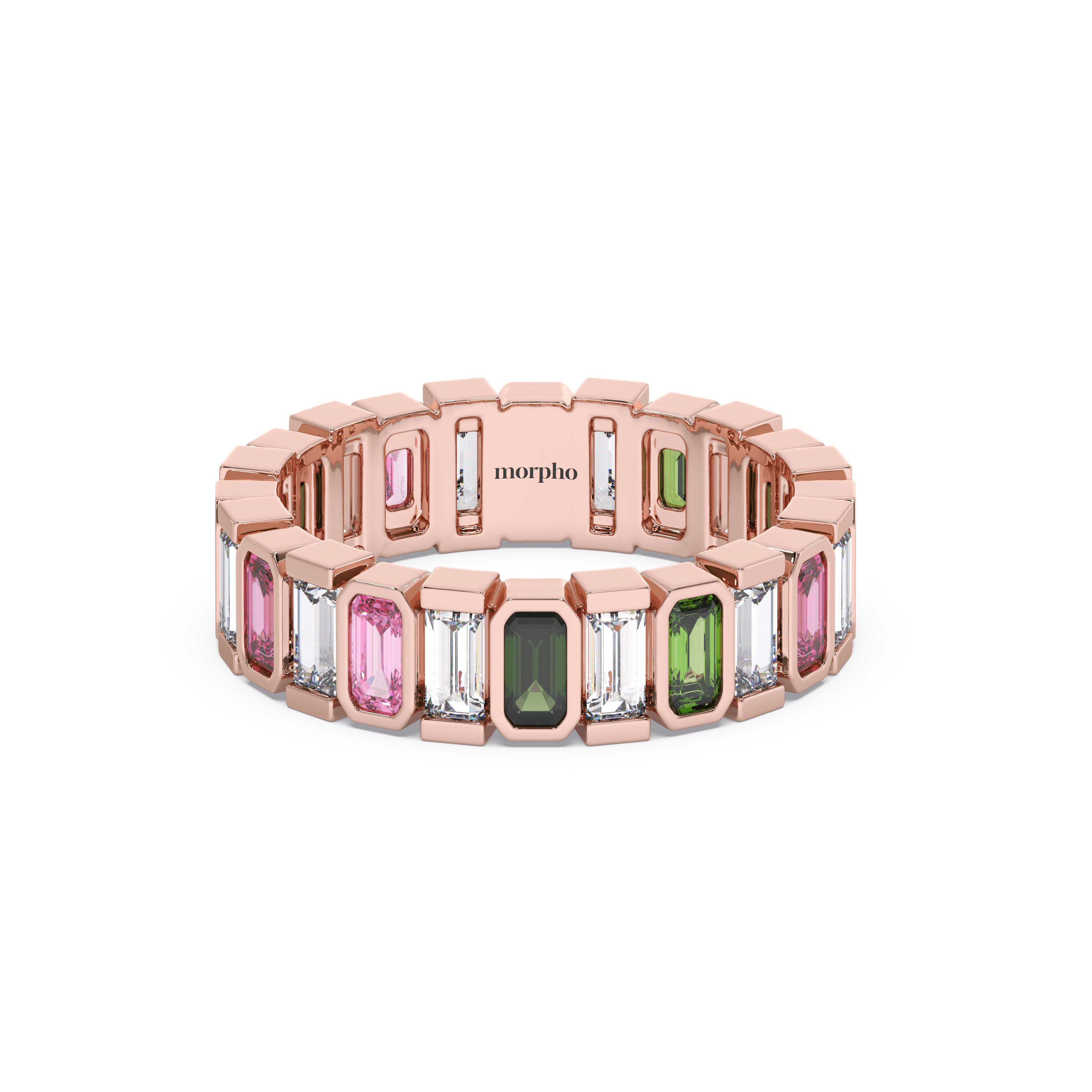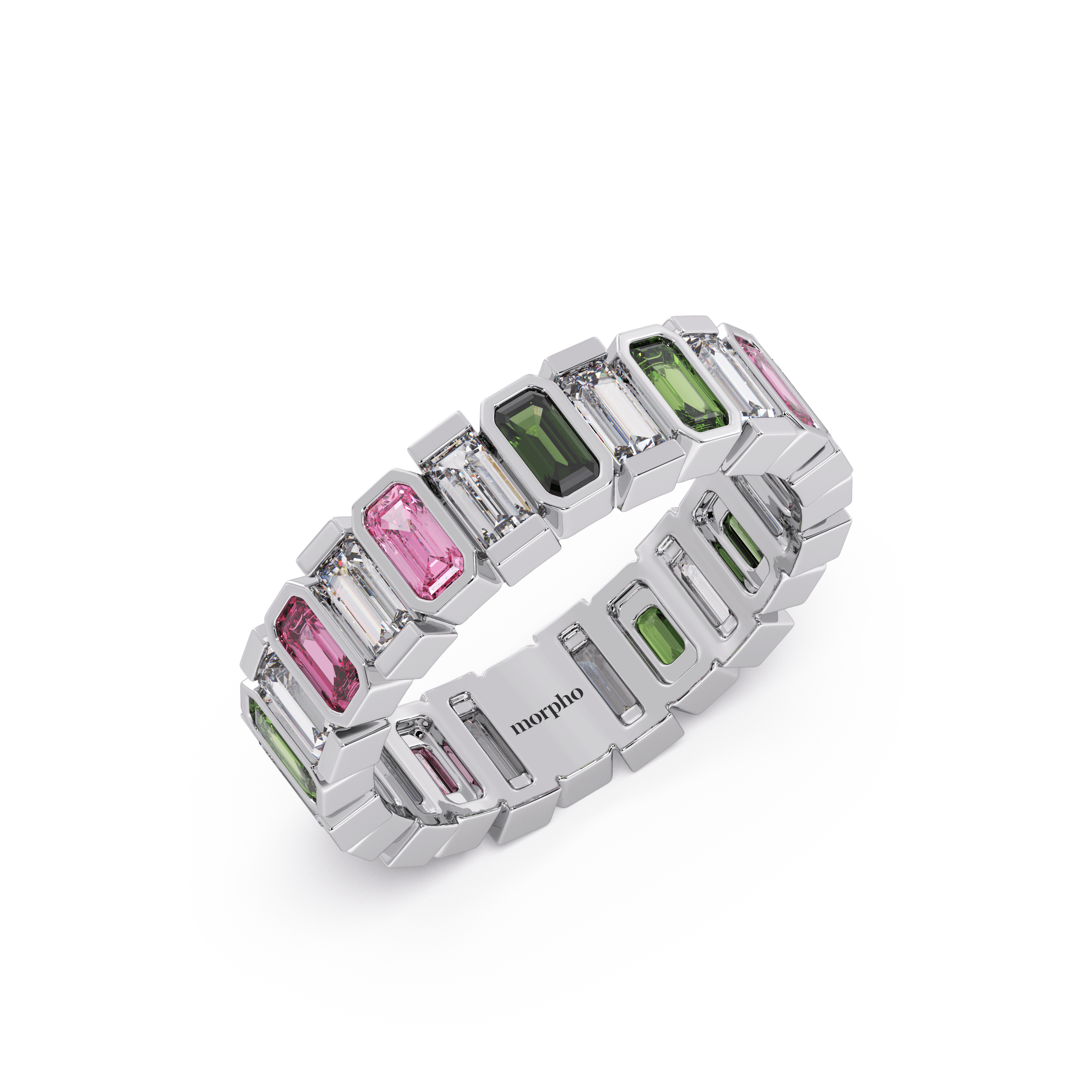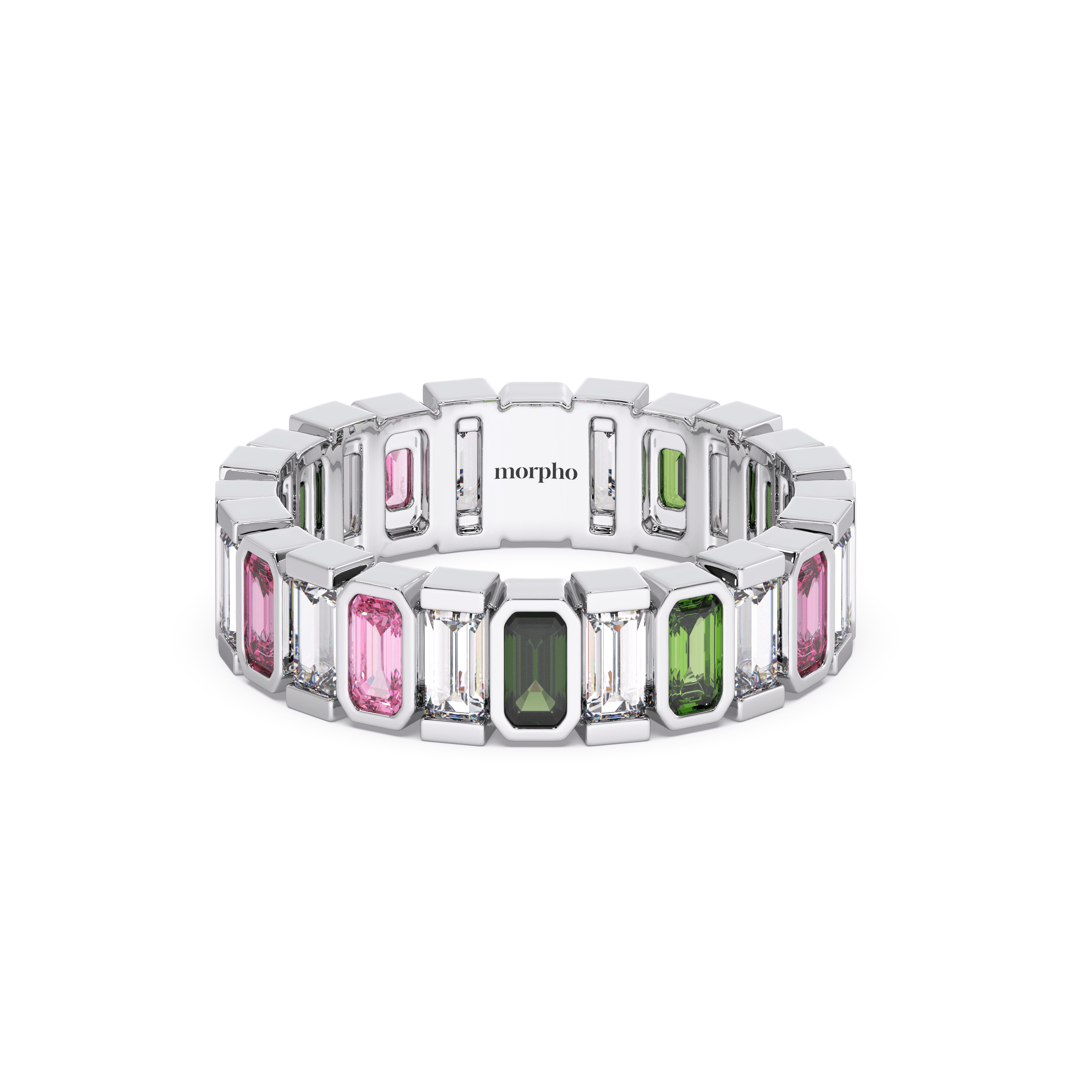 Full eternity band alternating baguette-cut emeralds and pink tourmalines in a continuous bezel-set loop.