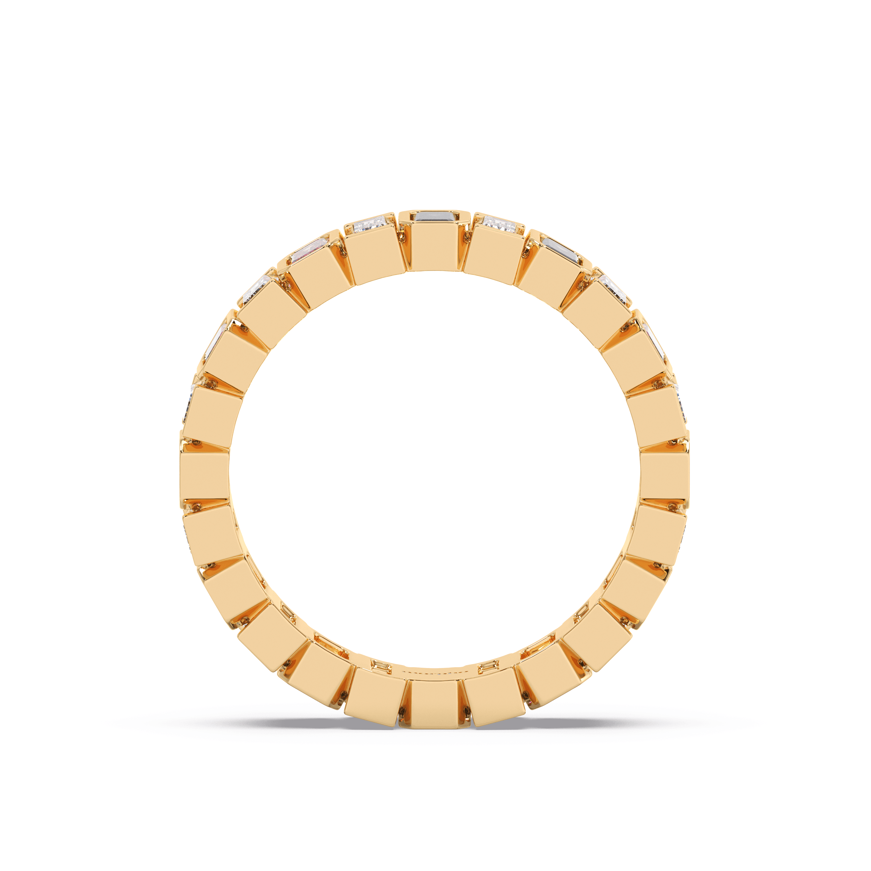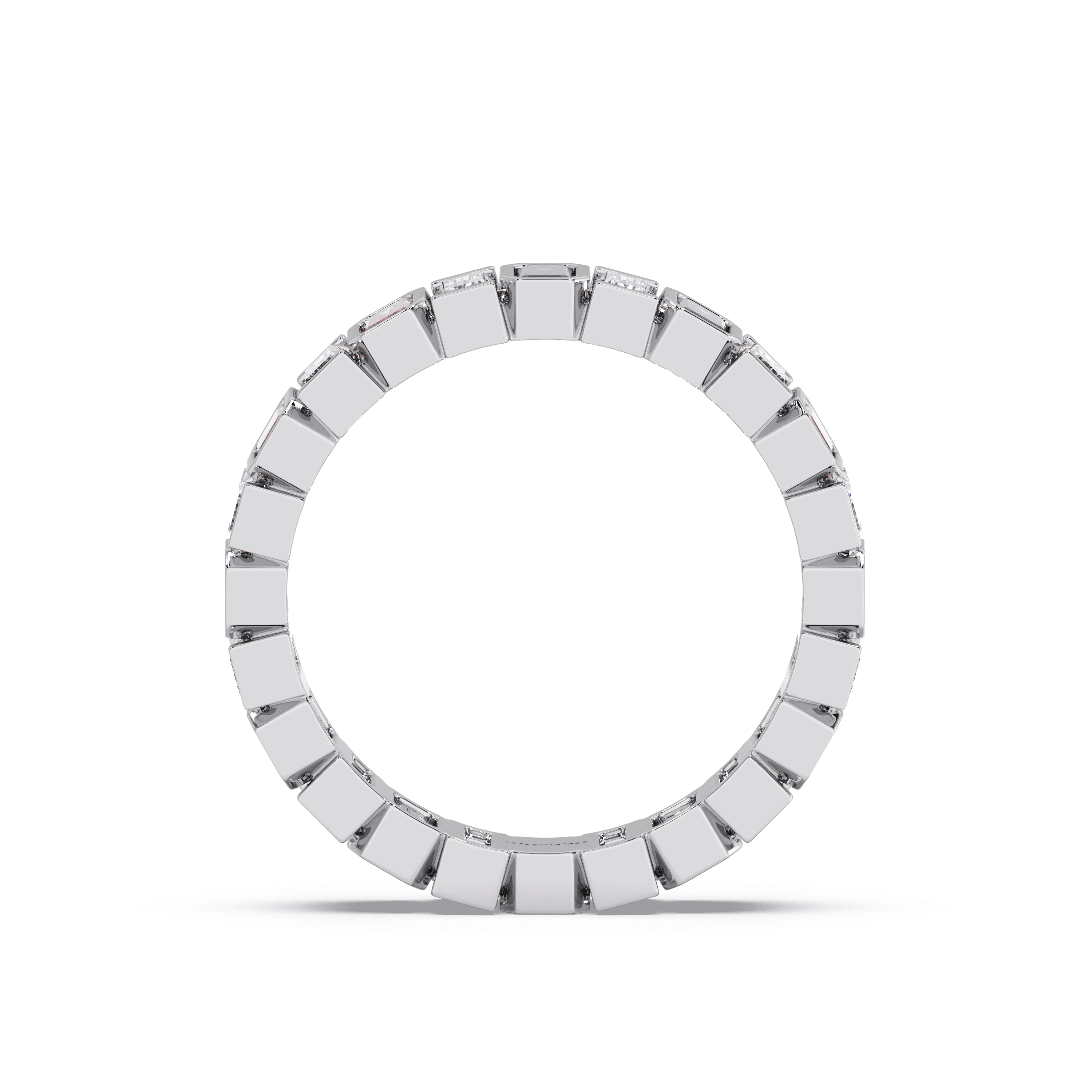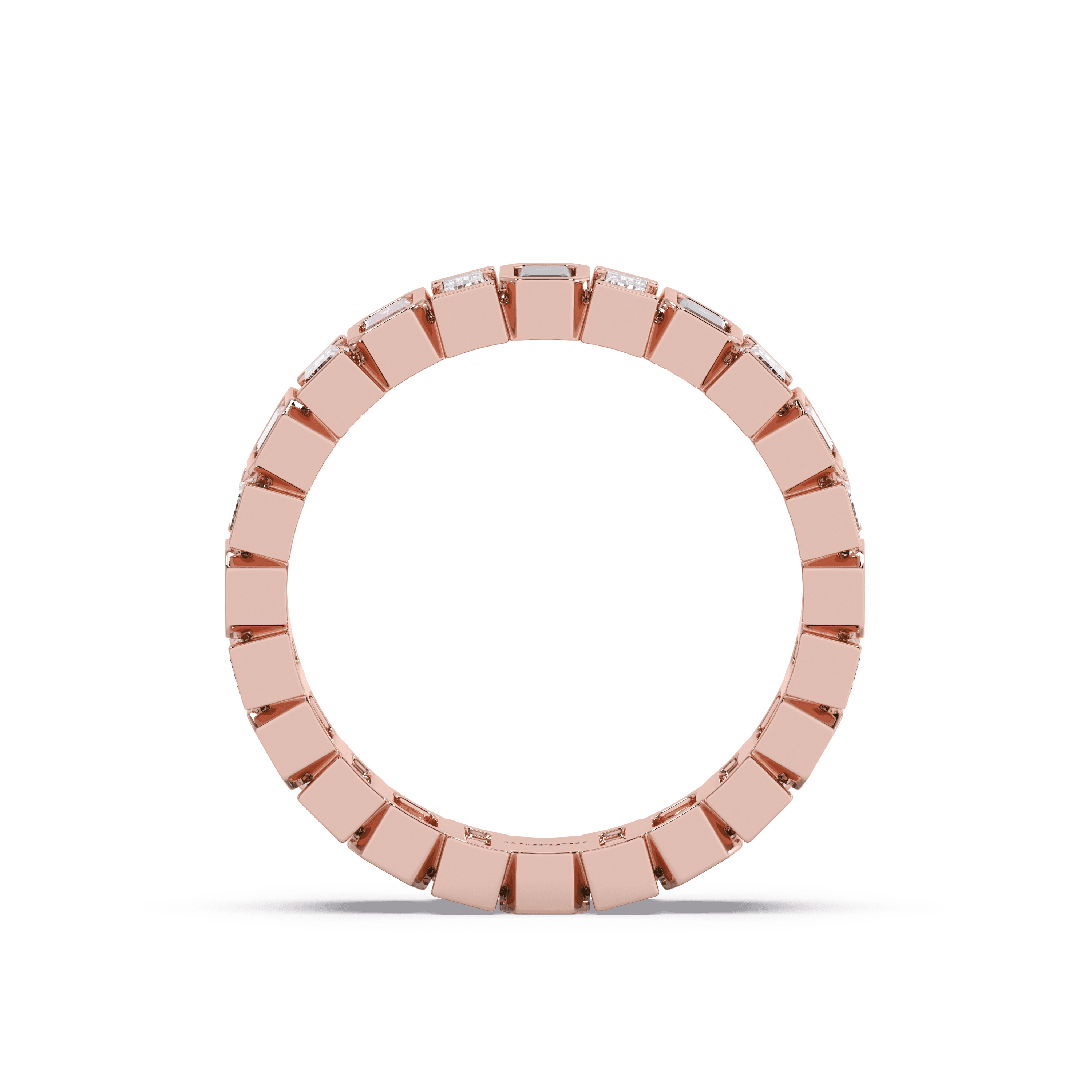 Full eternity band alternating baguette-cut emeralds and pink tourmalines in a continuous bezel-set loop.