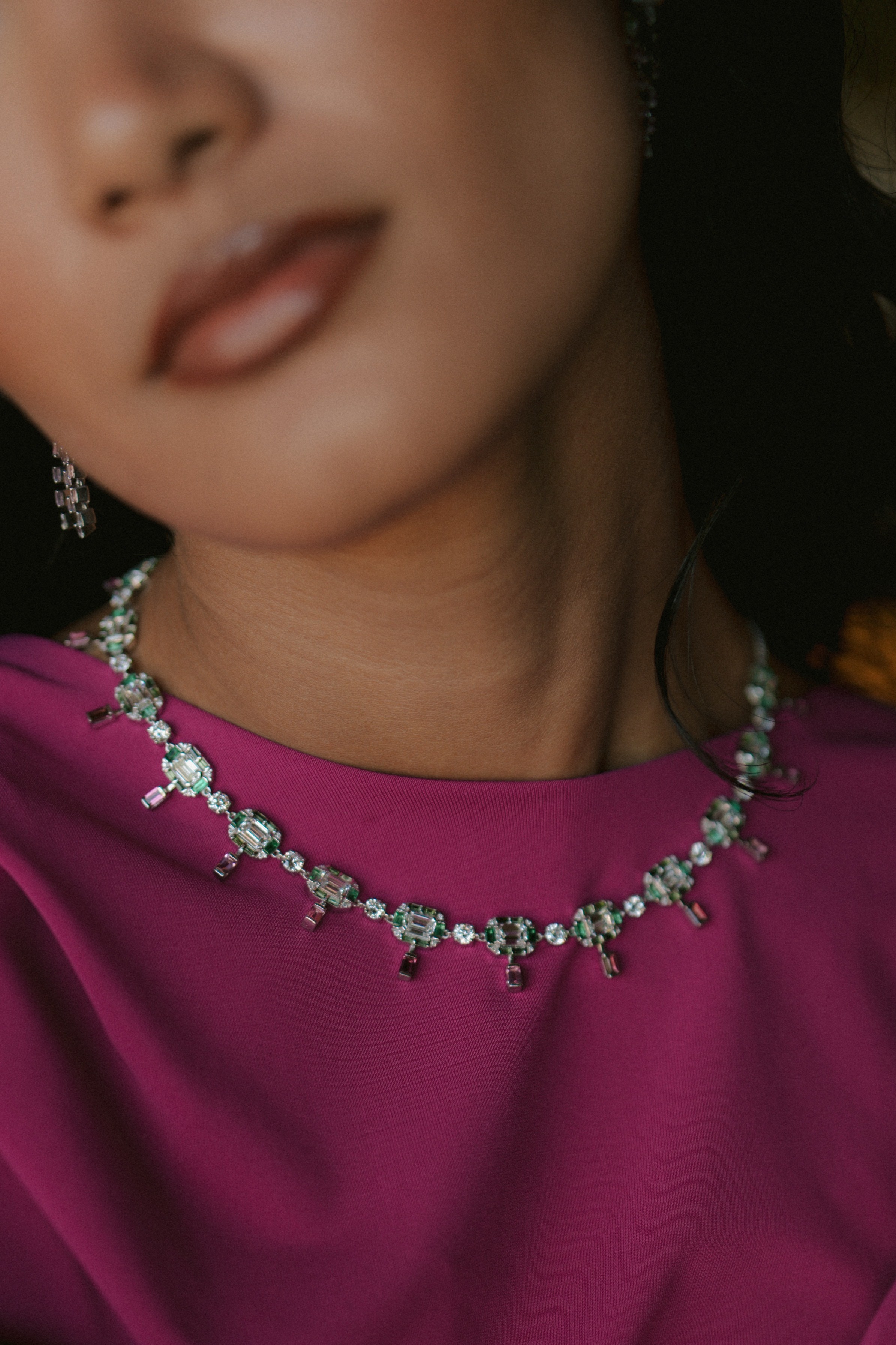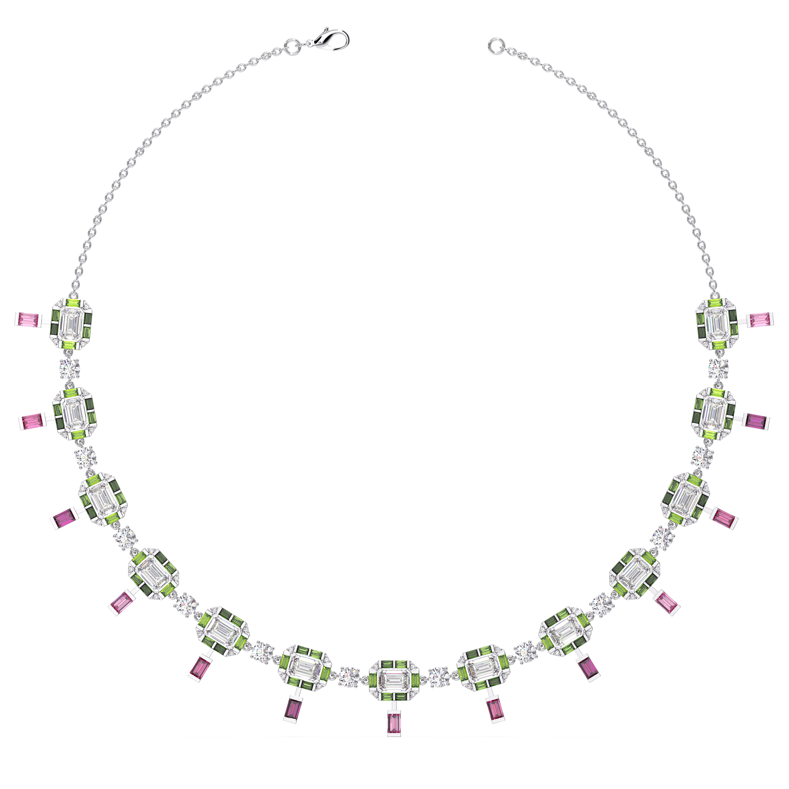 Flexible collarbone necklace composed of alternating baguette-cut emerald and pink tourmaline stations, linked with round diamond connectors.