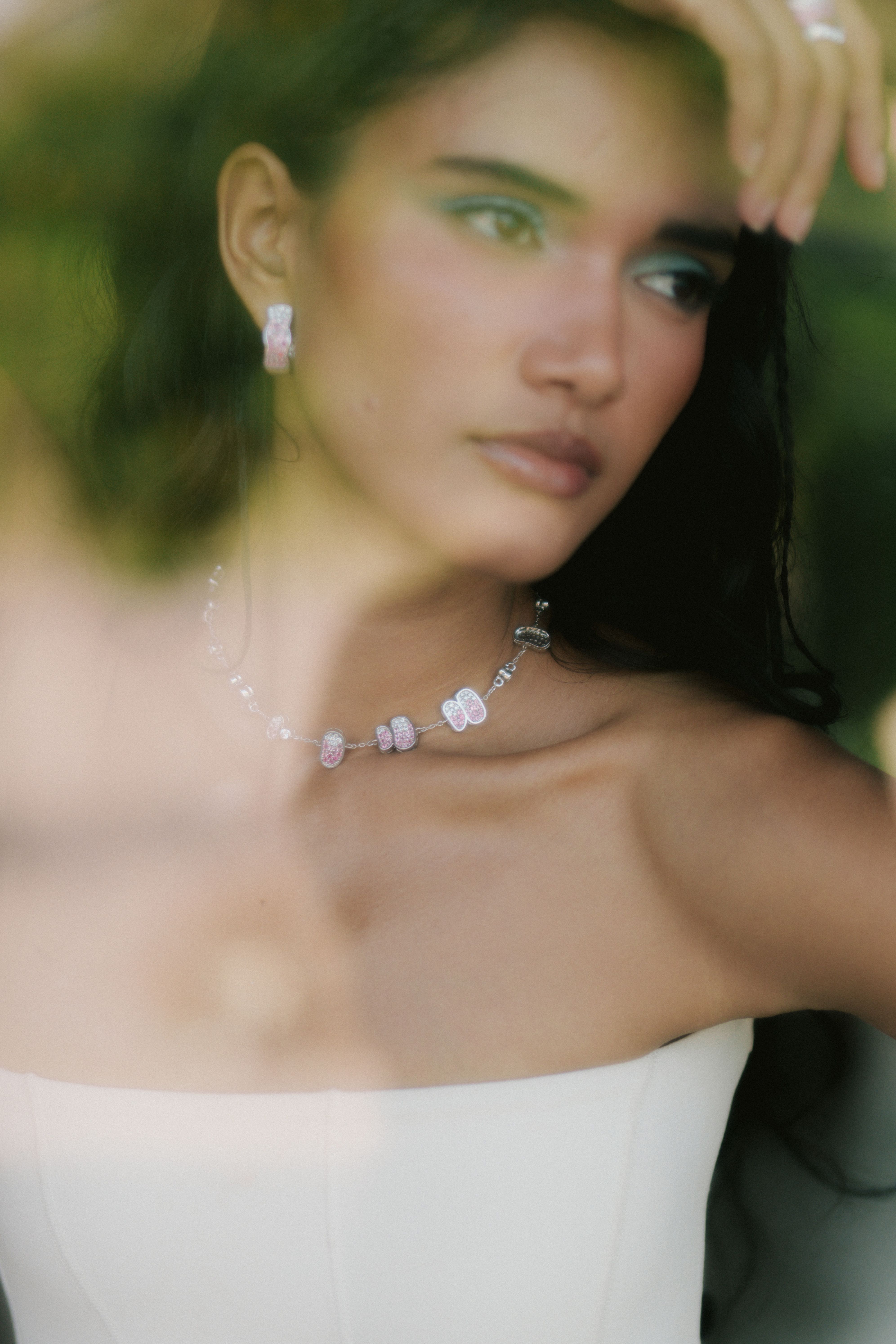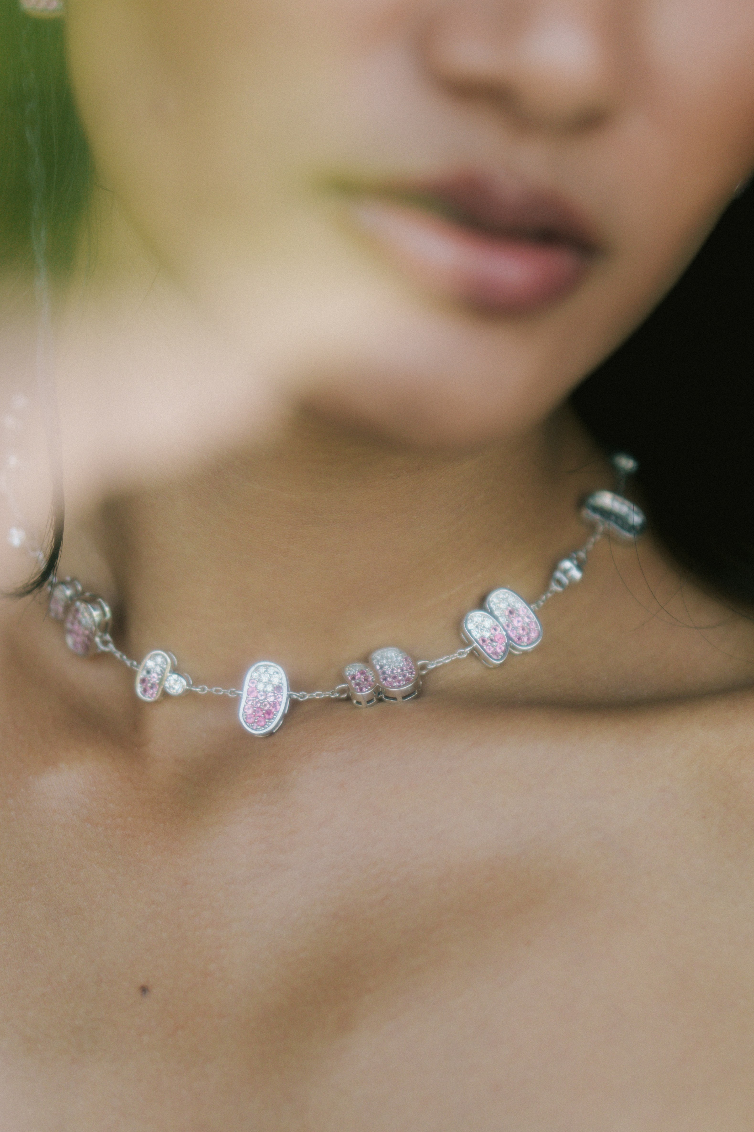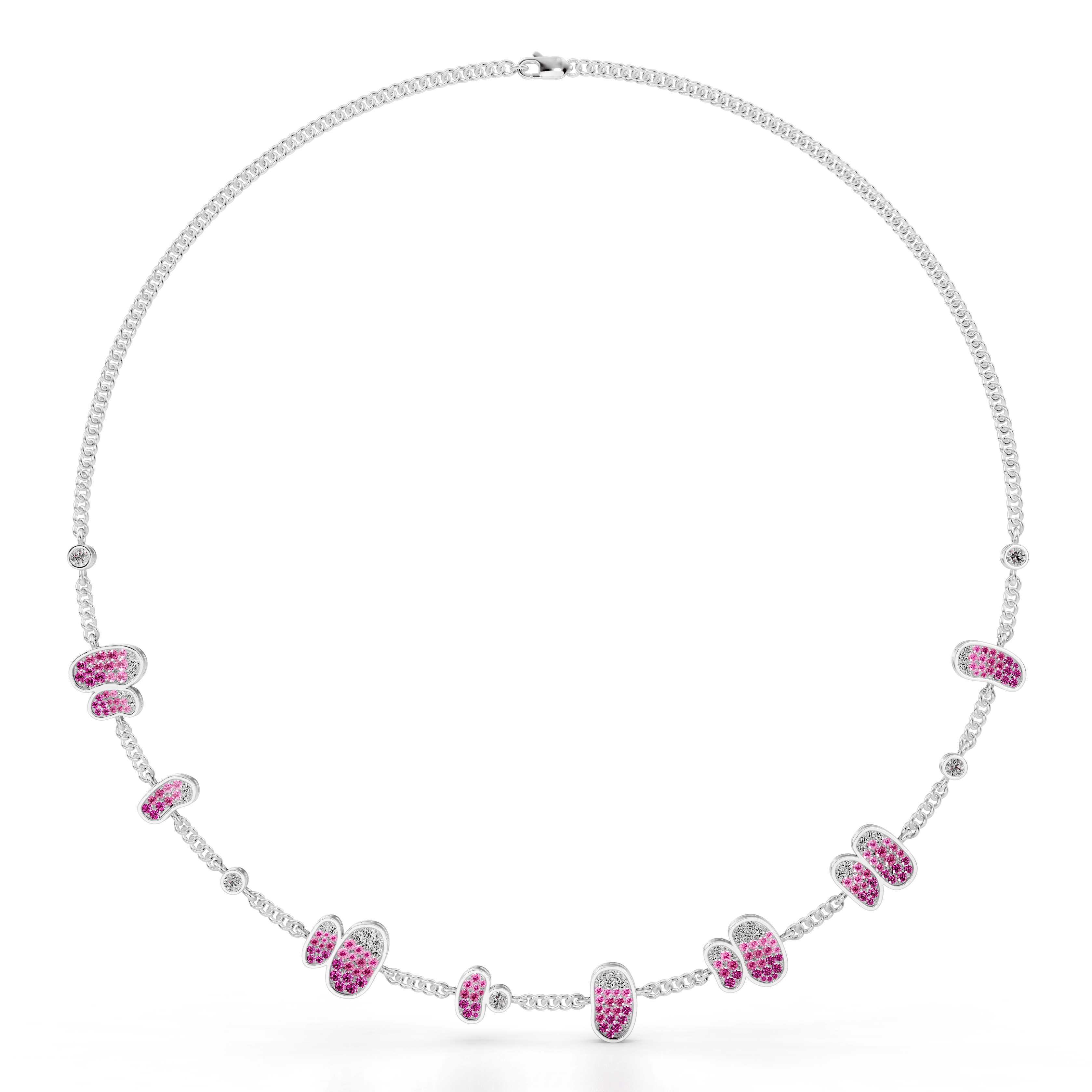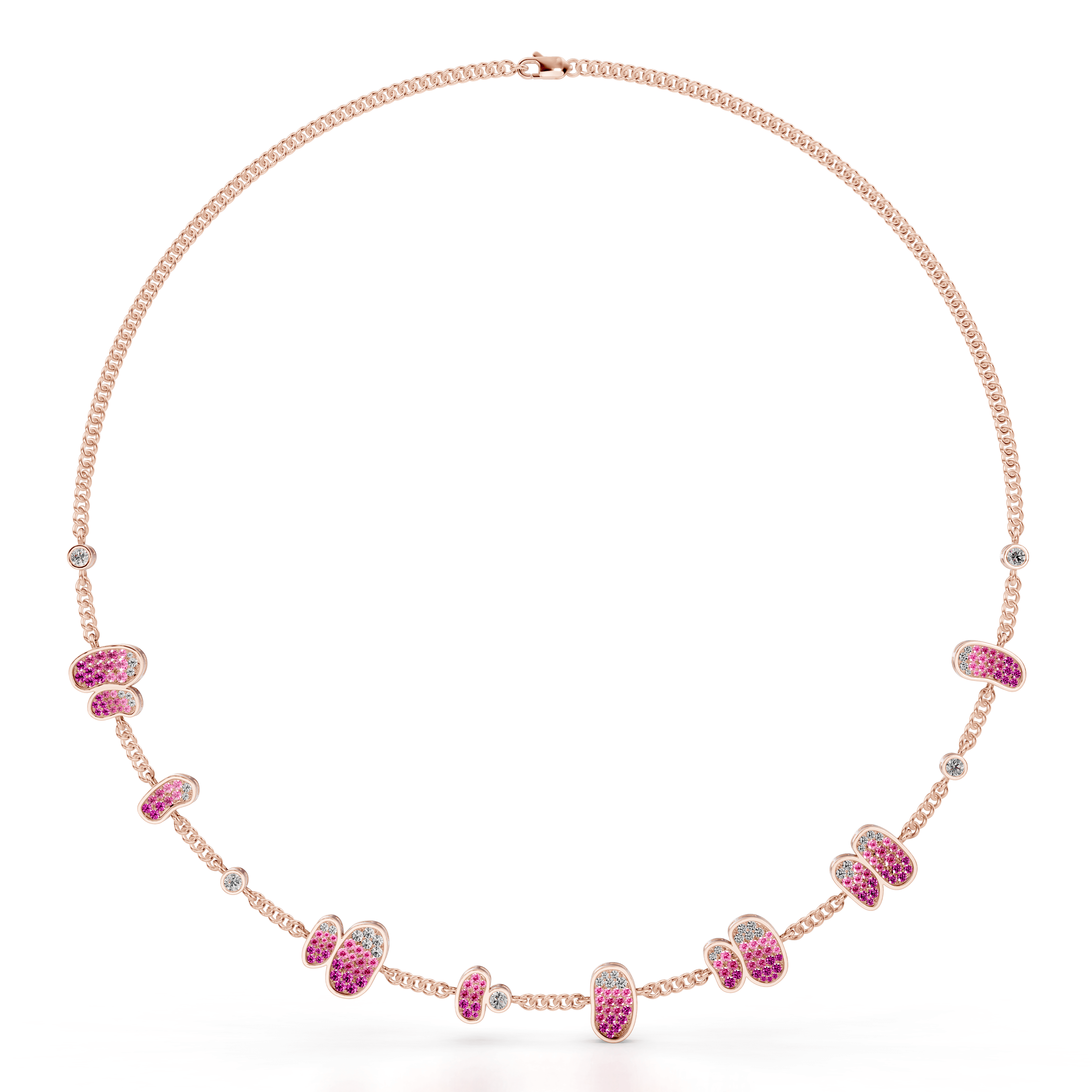 Lightweight chain necklace accented with rounded pavé-set pink tourmaline clusters spaced along a flexible gold chain.