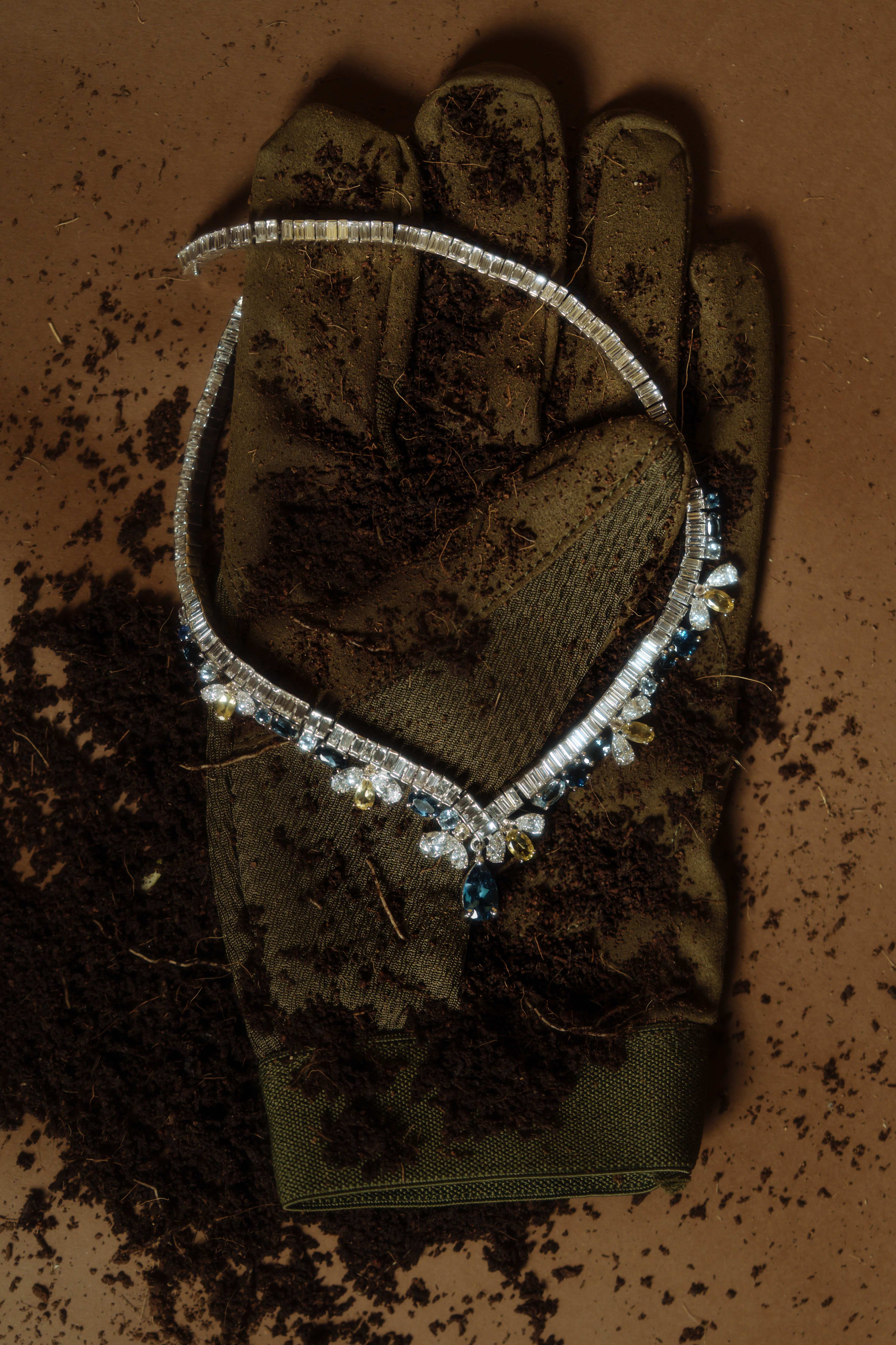A baguette diamond necklace with colourful dangling drops, butterflies and bugs