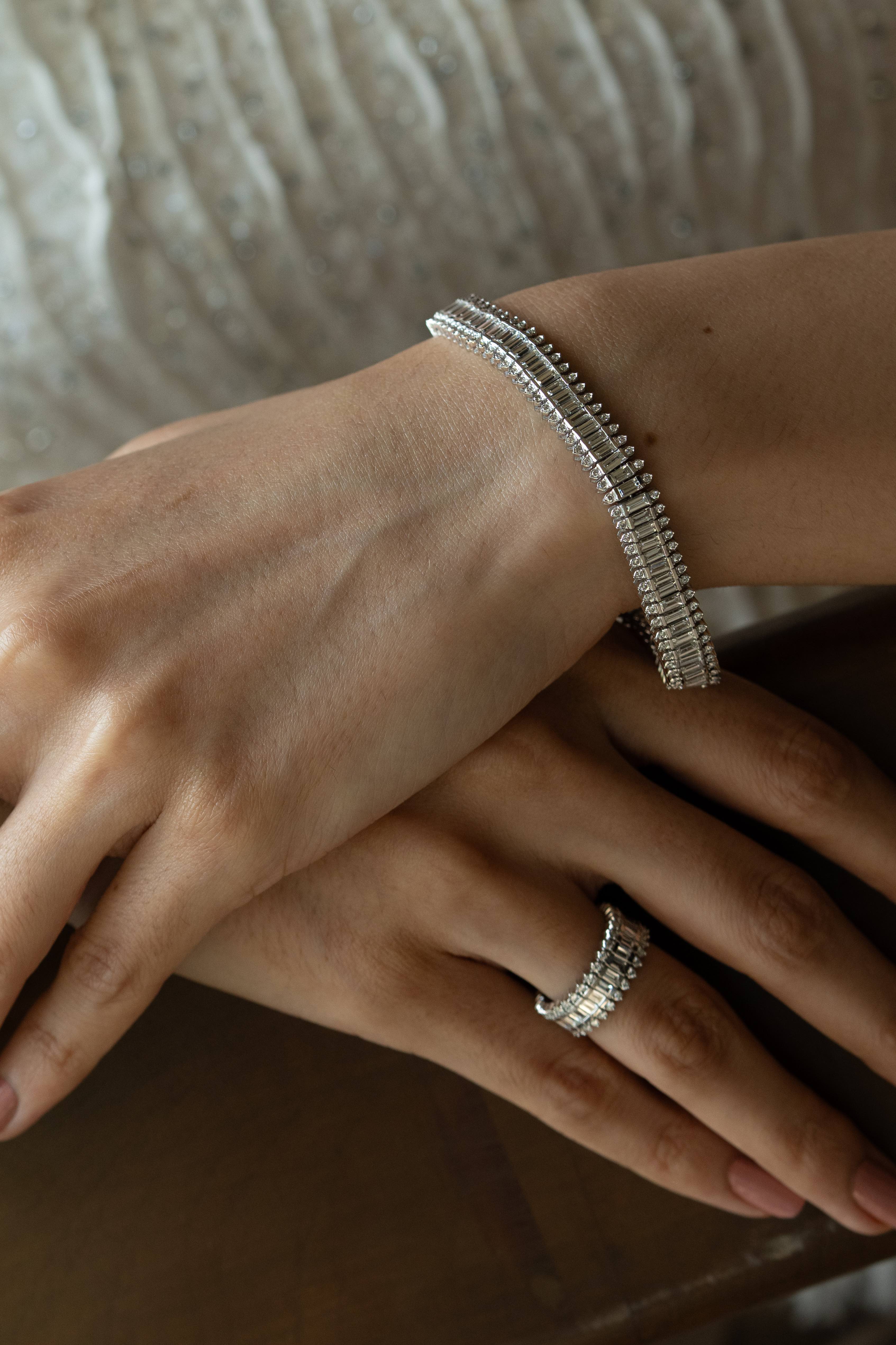 Full eternity band with parallel-set round and baguette diamonds in Off-Record style.