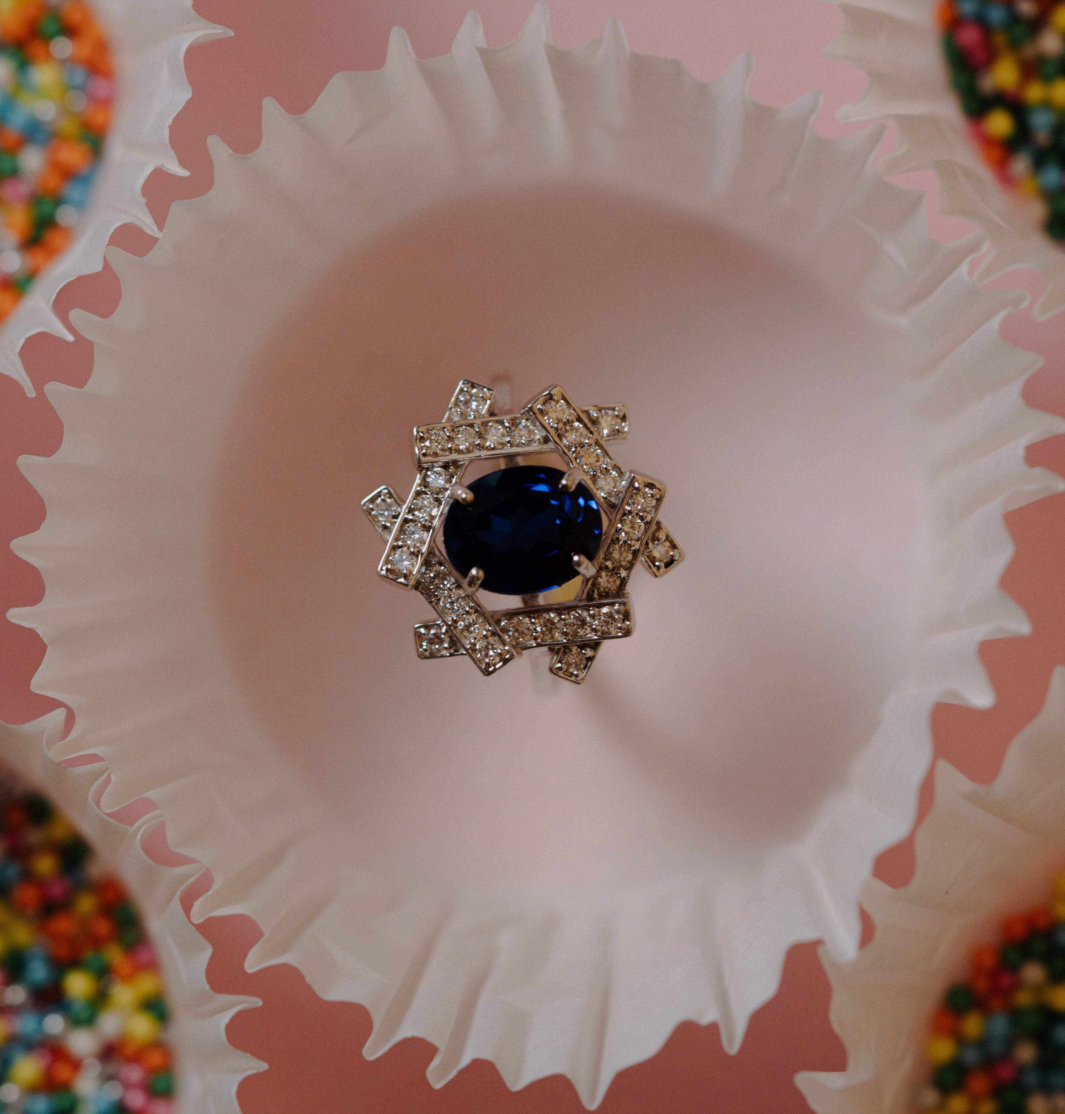Sculptural ring with a central oval blue sapphire set atop intersecting pavé-set gold bars in a layered, geometric bezel.