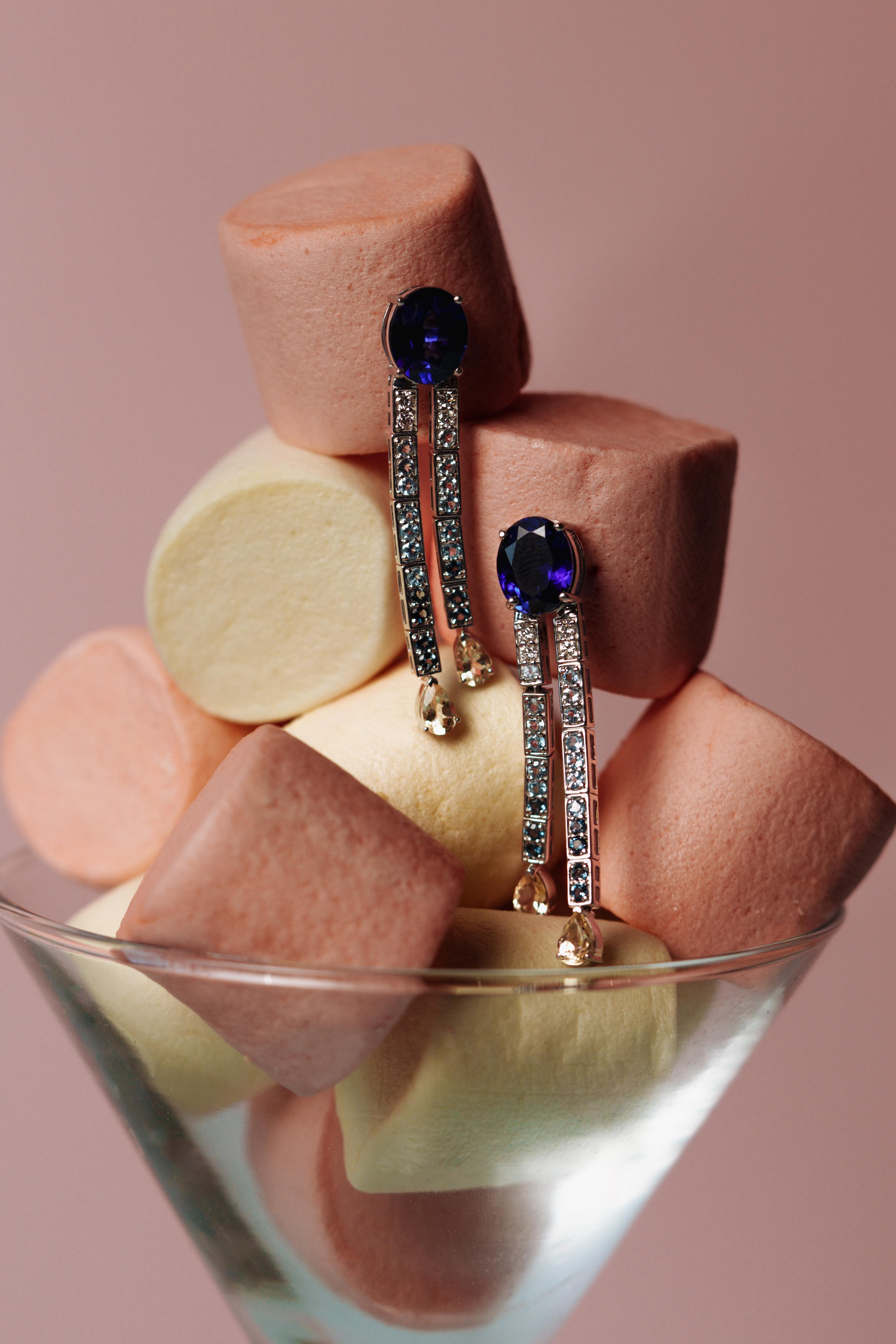 Drop earrings with dark blue sapphire studs and three-strand ombre blue sapphire drops suspended in gold, framed in white pavé bars.