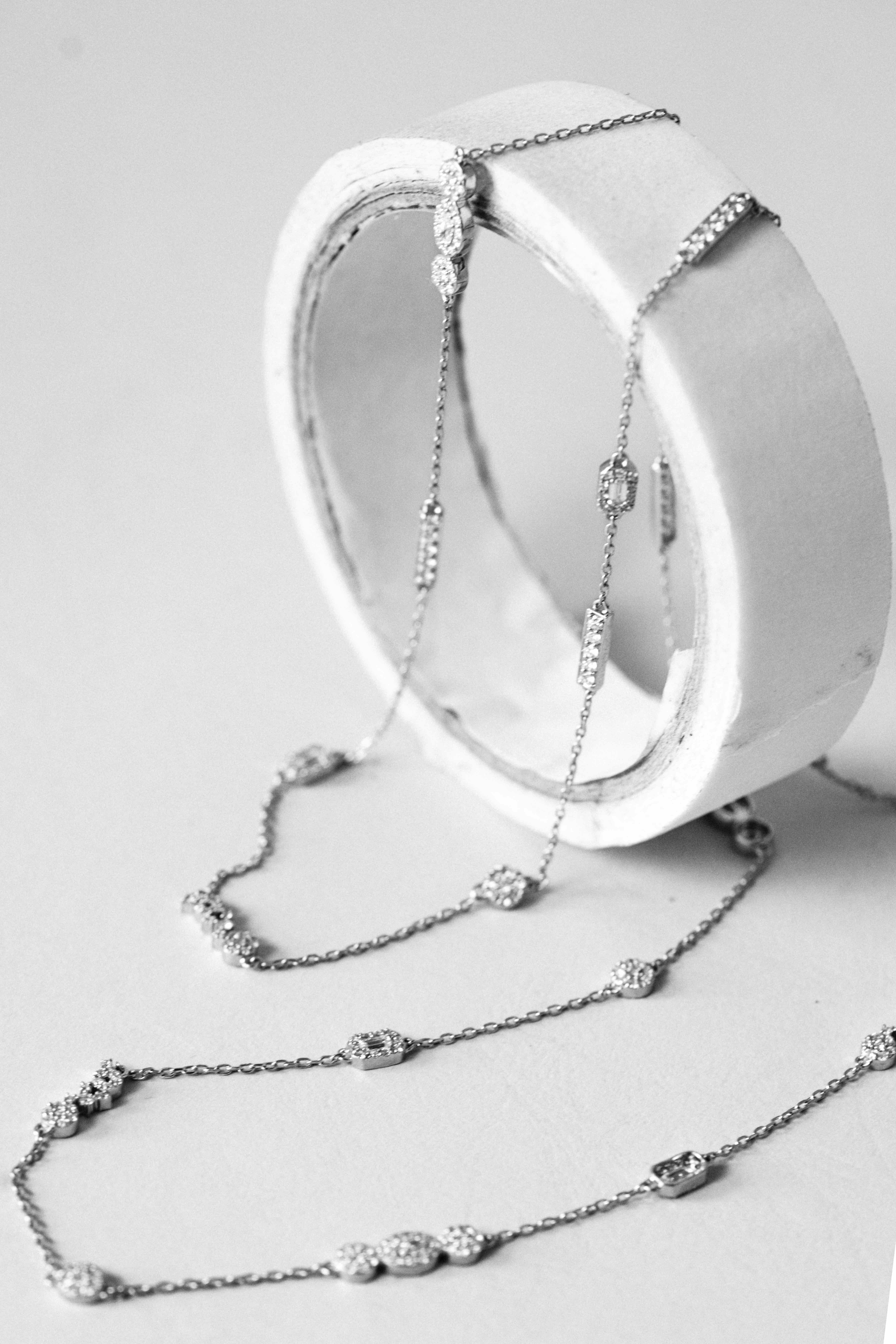 Flexible double-strand necklace with round diamonds across well-spaced components, set using micro-pave in bezel-setting.